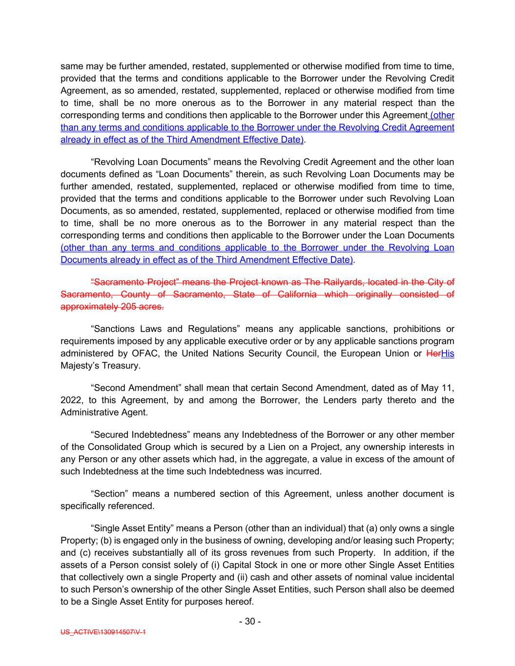 - 30 - US_ACTIVE\130914507\V-1 same may be further amended, restated, supplemented or otherwise modified from time to time, provided that the terms and conditions applicable to the Borrower under the Revolving Credit Agreement, as so amended, restated, supplemented, replaced or otherwise modified from time to time, shall be no more onerous as to the Borrower in any material respect than the corresponding terms and conditions then applicable to the Borrower under this Agreement (other than any terms and conditions applicable to the Borrower under the Revolving Credit Agreement already in effect as of the Third Amendment Effective Date). “Revolving Loan Documents” means the Revolving Credit Agreement and the other loan documents defined as “Loan Documents” therein, as such Revolving Loan Documents may be further amended, restated, supplemented, replaced or otherwise modified from time to time, provided that the terms and conditions applicable to the Borrower under such Revolving Loan Documents, as so amended, restated, supplemented, replaced or otherwise modified from time to time, shall be no more onerous as to the Borrower in any material respect than the corresponding terms and conditions then applicable to the Borrower under the Loan Documents (other than any terms and conditions applicable to the Borrower under the Revolving Loan Documents already in effect as of the Third Amendment Effective Date). “Sacramento Project” means the Project known as The Railyards, located in the City of Sacramento, County of Sacramento, State of California which originally consisted of approximately 205 acres. “Sanctions Laws and Regulations” means any applicable sanctions, prohibitions or requirements imposed by any applicable executive order or by any applicable sanctions program administered by OFAC, the United Nations Security Council, the European Union or HerHis Majesty’s Treasury. “Second Amendment” shall mean that certain Second Amendment, dated as of May 11, 2022, to this Agreement, by and among the Borrower, the Lenders party thereto and the Administrative Agent. “Secured Indebtedness” means any Indebtedness of the Borrower or any other member of the Consolidated Group which is secured by a Lien on a Project, any ownership interests in any Person or any other assets which had, in the aggregate, a value in excess of the amount of such Indebtedness at the time such Indebtedness was incurred. “Section” means a numbered section of this Agreement, unless another document is specifically referenced. “Single Asset Entity” means a Person (other than an individual) that (a) only owns a single Property; (b) is engaged only in the business of owning, developing and/or leasing such Property; and (c) receives substantially all of its gross revenues from such Property. In addition, if the assets of a Person consist solely of (i) Capital Stock in one or more other Single Asset Entities that collectively own a single Property and (ii) cash and other assets of nominal value incidental to such Person’s ownership of the other Single Asset Entities, such Person shall also be deemed to be a Single Asset Entity for purposes hereof.