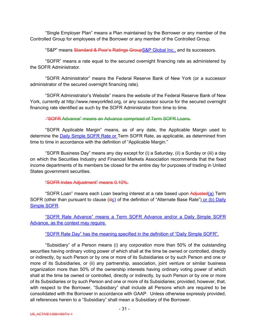- 31 - US_ACTIVE\130914507\V-1 “Single Employer Plan” means a Plan maintained by the Borrower or any member of the Controlled Group for employees of the Borrower or any member of the Controlled Group. “S&P” means Standard & Poor’s Ratings GroupS&P Global Inc., and its successors. “SOFR” means a rate equal to the secured overnight financing rate as administered by the SOFR Administrator. “SOFR Administrator” means the Federal Reserve Bank of New York (or a successor administrator of the secured overnight financing rate). “SOFR Administrator’s Website” means the website of the Federal Reserve Bank of New York, currently at http://www.newyorkfed.org, or any successor source for the secured overnight financing rate identified as such by the SOFR Administrator from time to time. “SOFR Advance” means an Advance comprised of Term SOFR Loans. “SOFR Applicable Margin” means, as of any date, the Applicable Margin used to determine the Daily Simple SOFR Rate or Term SOFR Rate, as applicable, as determined from time to time in accordance with the definition of “Applicable Margin.” “SOFR Business Day” means any day except for (i) a Saturday, (ii) a Sunday or (iii) a day on which the Securities Industry and Financial Markets Association recommends that the fixed income departments of its members be closed for the entire day for purposes of trading in United States government securities. “SOFR Index Adjustment” means 0.10%. “SOFR Loan” means each Loan bearing interest at a rate based upon Adjusted(a) Term SOFR (other than pursuant to clause (iiic) of the definition of “Alternate Base Rate”) or (b) Daily Simple SOFR. “SOFR Rate Advance” means a Term SOFR Advance and/or a Daily Simple SOFR Advance, as the context may require. “SOFR Rate Day” has the meaning specified in the definition of “Daily Simple SOFR”. “Subsidiary” of a Person means (i) any corporation more than 50% of the outstanding securities having ordinary voting power of which shall at the time be owned or controlled, directly or indirectly, by such Person or by one or more of its Subsidiaries or by such Person and one or more of its Subsidiaries, or (ii) any partnership, association, joint venture or similar business organization more than 50% of the ownership interests having ordinary voting power of which shall at the time be owned or controlled, directly or indirectly, by such Person or by one or more of its Subsidiaries or by such Person and one or more of its Subsidiaries; provided, however, that, with respect to the Borrower, “Subsidiary” shall include all Persons which are required to be consolidated with the Borrower in accordance with GAAP. Unless otherwise expressly provided, all references herein to a “Subsidiary” shall mean a Subsidiary of the Borrower.