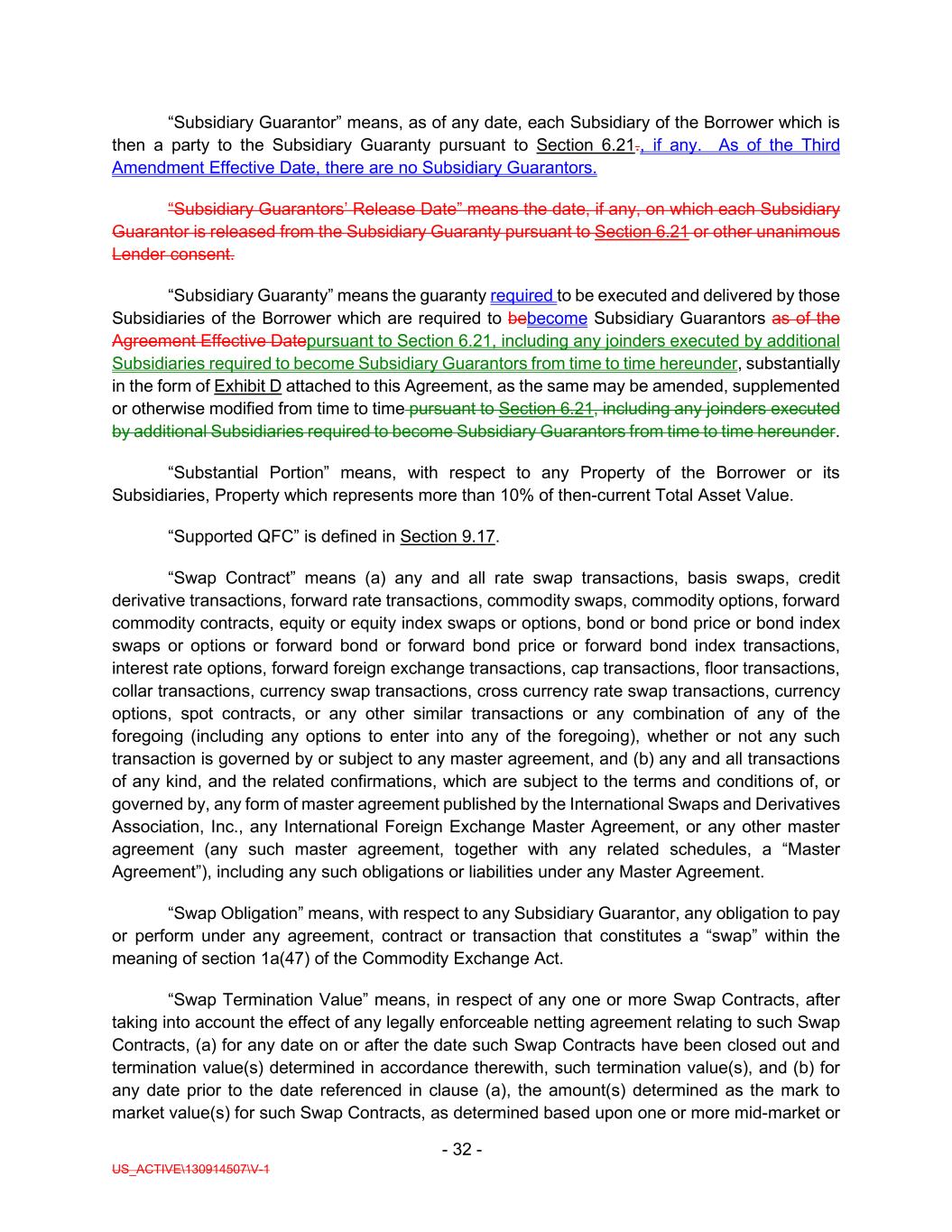 - 32 - US_ACTIVE\130914507\V-1 “Subsidiary Guarantor” means, as of any date, each Subsidiary of the Borrower which is then a party to the Subsidiary Guaranty pursuant to Section 6.21., if any. As of the Third Amendment Effective Date, there are no Subsidiary Guarantors. “Subsidiary Guarantors’ Release Date” means the date, if any, on which each Subsidiary Guarantor is released from the Subsidiary Guaranty pursuant to Section 6.21 or other unanimous Lender consent. “Subsidiary Guaranty” means the guaranty required to be executed and delivered by those Subsidiaries of the Borrower which are required to bebecome Subsidiary Guarantors as of the Agreement Effective Datepursuant to Section 6.21, including any joinders executed by additional Subsidiaries required to become Subsidiary Guarantors from time to time hereunder, substantially in the form of Exhibit D attached to this Agreement, as the same may be amended, supplemented or otherwise modified from time to time pursuant to Section 6.21, including any joinders executed by additional Subsidiaries required to become Subsidiary Guarantors from time to time hereunder. “Substantial Portion” means, with respect to any Property of the Borrower or its Subsidiaries, Property which represents more than 10% of then-current Total Asset Value. “Supported QFC” is defined in Section 9.17. “Swap Contract” means (a) any and all rate swap transactions, basis swaps, credit derivative transactions, forward rate transactions, commodity swaps, commodity options, forward commodity contracts, equity or equity index swaps or options, bond or bond price or bond index swaps or options or forward bond or forward bond price or forward bond index transactions, interest rate options, forward foreign exchange transactions, cap transactions, floor transactions, collar transactions, currency swap transactions, cross currency rate swap transactions, currency options, spot contracts, or any other similar transactions or any combination of any of the foregoing (including any options to enter into any of the foregoing), whether or not any such transaction is governed by or subject to any master agreement, and (b) any and all transactions of any kind, and the related confirmations, which are subject to the terms and conditions of, or governed by, any form of master agreement published by the International Swaps and Derivatives Association, Inc., any International Foreign Exchange Master Agreement, or any other master agreement (any such master agreement, together with any related schedules, a “Master Agreement”), including any such obligations or liabilities under any Master Agreement. “Swap Obligation” means, with respect to any Subsidiary Guarantor, any obligation to pay or perform under any agreement, contract or transaction that constitutes a “swap” within the meaning of section 1a(47) of the Commodity Exchange Act. “Swap Termination Value” means, in respect of any one or more Swap Contracts, after taking into account the effect of any legally enforceable netting agreement relating to such Swap Contracts, (a) for any date on or after the date such Swap Contracts have been closed out and termination value(s) determined in accordance therewith, such termination value(s), and (b) for any date prior to the date referenced in clause (a), the amount(s) determined as the mark to market value(s) for such Swap Contracts, as determined based upon one or more mid-market or