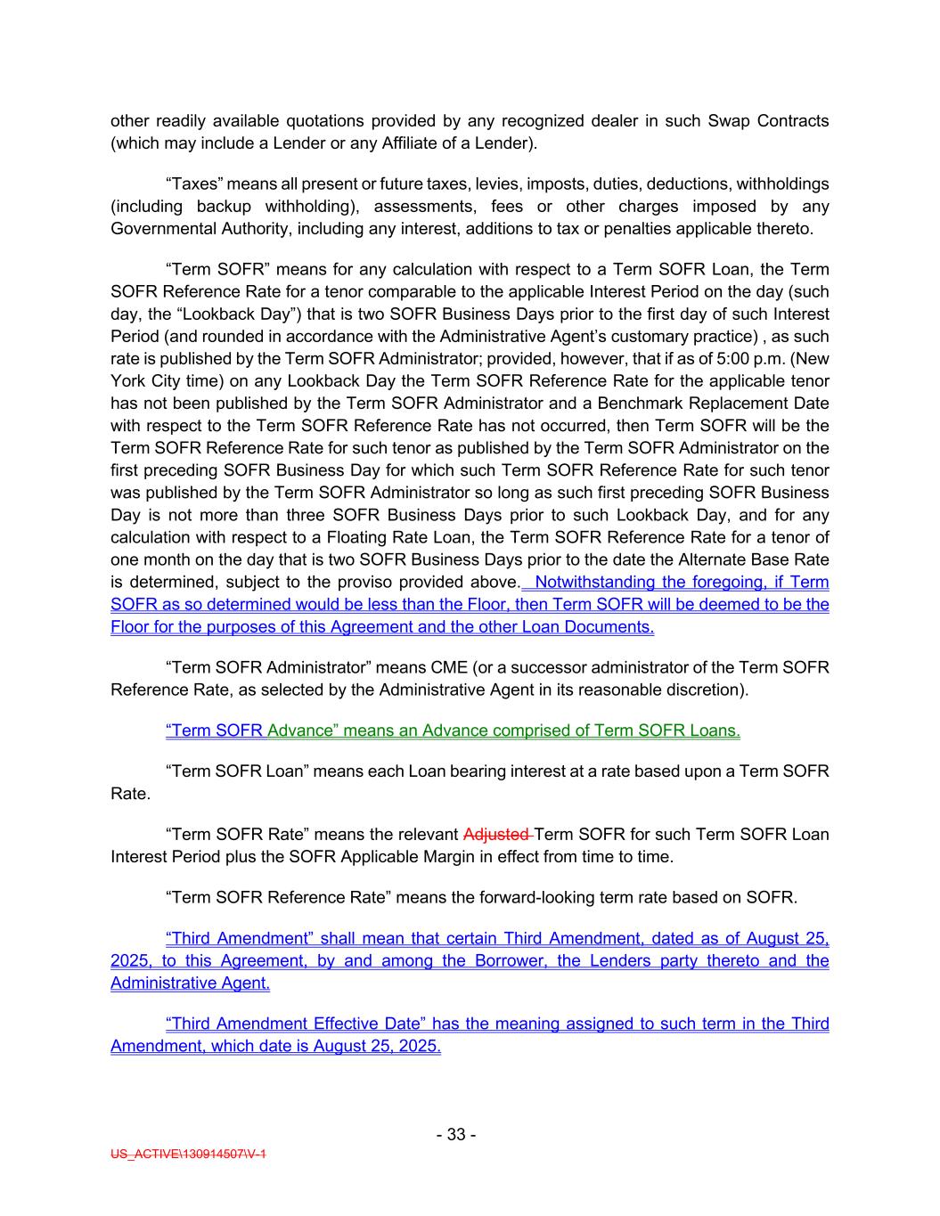 - 33 - US_ACTIVE\130914507\V-1 other readily available quotations provided by any recognized dealer in such Swap Contracts (which may include a Lender or any Affiliate of a Lender). “Taxes” means all present or future taxes, levies, imposts, duties, deductions, withholdings (including backup withholding), assessments, fees or other charges imposed by any Governmental Authority, including any interest, additions to tax or penalties applicable thereto. “Term SOFR” means for any calculation with respect to a Term SOFR Loan, the Term SOFR Reference Rate for a tenor comparable to the applicable Interest Period on the day (such day, the “Lookback Day”) that is two SOFR Business Days prior to the first day of such Interest Period (and rounded in accordance with the Administrative Agent’s customary practice) , as such rate is published by the Term SOFR Administrator; provided, however, that if as of 5:00 p.m. (New York City time) on any Lookback Day the Term SOFR Reference Rate for the applicable tenor has not been published by the Term SOFR Administrator and a Benchmark Replacement Date with respect to the Term SOFR Reference Rate has not occurred, then Term SOFR will be the Term SOFR Reference Rate for such tenor as published by the Term SOFR Administrator on the first preceding SOFR Business Day for which such Term SOFR Reference Rate for such tenor was published by the Term SOFR Administrator so long as such first preceding SOFR Business Day is not more than three SOFR Business Days prior to such Lookback Day, and for any calculation with respect to a Floating Rate Loan, the Term SOFR Reference Rate for a tenor of one month on the day that is two SOFR Business Days prior to the date the Alternate Base Rate is determined, subject to the proviso provided above. Notwithstanding the foregoing, if Term SOFR as so determined would be less than the Floor, then Term SOFR will be deemed to be the Floor for the purposes of this Agreement and the other Loan Documents. “Term SOFR Administrator” means CME (or a successor administrator of the Term SOFR Reference Rate, as selected by the Administrative Agent in its reasonable discretion). “Term SOFR Advance” means an Advance comprised of Term SOFR Loans. “Term SOFR Loan” means each Loan bearing interest at a rate based upon a Term SOFR Rate. “Term SOFR Rate” means the relevant Adjusted Term SOFR for such Term SOFR Loan Interest Period plus the SOFR Applicable Margin in effect from time to time. “Term SOFR Reference Rate” means the forward-looking term rate based on SOFR. “Third Amendment” shall mean that certain Third Amendment, dated as of August 25, 2025, to this Agreement, by and among the Borrower, the Lenders party thereto and the Administrative Agent. “Third Amendment Effective Date” has the meaning assigned to such term in the Third Amendment, which date is August 25, 2025.