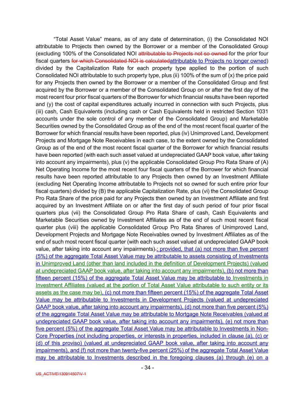 - 34 - US_ACTIVE\130914507\V-1 “Total Asset Value” means, as of any date of determination, (i) the Consolidated NOI attributable to Projects then owned by the Borrower or a member of the Consolidated Group (excluding 100% of the Consolidated NOI attributable to Projects not so owned for the prior four fiscal quarters for which Consolidated NOI is calculatedattributable to Projects no longer owned) divided by the Capitalization Rate for each property type applied to the portion of such Consolidated NOI attributable to such property type, plus (ii) 100% of the sum of (x) the price paid for any Projects then owned by the Borrower or a member of the Consolidated Group and first acquired by the Borrower or a member of the Consolidated Group on or after the first day of the most recent four prior fiscal quarters of the Borrower for which financial results have been reported and (y) the cost of capital expenditures actually incurred in connection with such Projects, plus (iii) cash, Cash Equivalents (including cash or Cash Equivalents held in restricted Section 1031 accounts under the sole control of any member of the Consolidated Group) and Marketable Securities owned by the Consolidated Group as of the end of the most recent fiscal quarter of the Borrower for which financial results have been reported, plus (iv) Unimproved Land, Development Projects and Mortgage Note Receivables in each case, to the extent owned by the Consolidated Group as of the end of the most recent fiscal quarter of the Borrower for which financial results have been reported (with each such asset valued at undepreciated GAAP book value, after taking into account any impairments), plus (v) the applicable Consolidated Group Pro Rata Share of (A) Net Operating Income for the most recent four fiscal quarters of the Borrower for which financial results have been reported attributable to any Projects then owned by an Investment Affiliate (excluding Net Operating Income attributable to Projects not so owned for such entire prior four fiscal quarters) divided by (B) the applicable Capitalization Rate, plus (vi) the Consolidated Group Pro Rata Share of the price paid for any Projects then owned by an Investment Affiliate and first acquired by an Investment Affiliate on or after the first day of such period of four prior fiscal quarters plus (vii) the Consolidated Group Pro Rata Share of cash, Cash Equivalents and Marketable Securities owned by Investment Affiliates as of the end of such most recent fiscal quarter plus (viii) the applicable Consolidated Group Pro Rata Shares of Unimproved Land, Development Projects and Mortgage Note Receivables owned by Investment Affiliates as of the end of such most recent fiscal quarter (with each such asset valued at undepreciated GAAP book value, after taking into account any impairments).; provided, that (a) not more than five percent (5%) of the aggregate Total Asset Value may be attributable to assets consisting of Investments in Unimproved Land (other than land included in the definition of Development Projects) (valued at undepreciated GAAP book value, after taking into account any impairments), (b) not more than fifteen percent (15%) of the aggregate Total Asset Value may be attributable to Investments in Investment Affiliates (valued at the portion of Total Asset Value attributable to such entity or its assets as the case may be), (c) not more than fifteen percent (15%) of the aggregate Total Asset Value may be attributable to Investments in Development Projects (valued at undepreciated GAAP book value, after taking into account any impairments), (d) not more than five percent (5%) of the aggregate Total Asset Value may be attributable to Mortgage Note Receivables (valued at undepreciated GAAP book value, after taking into account any impairments), (e) not more than five percent (5%) of the aggregate Total Asset Value may be attributable to Investments in Non- Core Properties (not including properties, or interests in properties, included in clause (a), (c) or (d) of this proviso) (valued at undepreciated GAAP book value, after taking into account any impairments), and (f) not more than twenty-five percent (25%) of the aggregate Total Asset Value may be attributable to Investments described in the foregoing clauses (a) through (e) on a