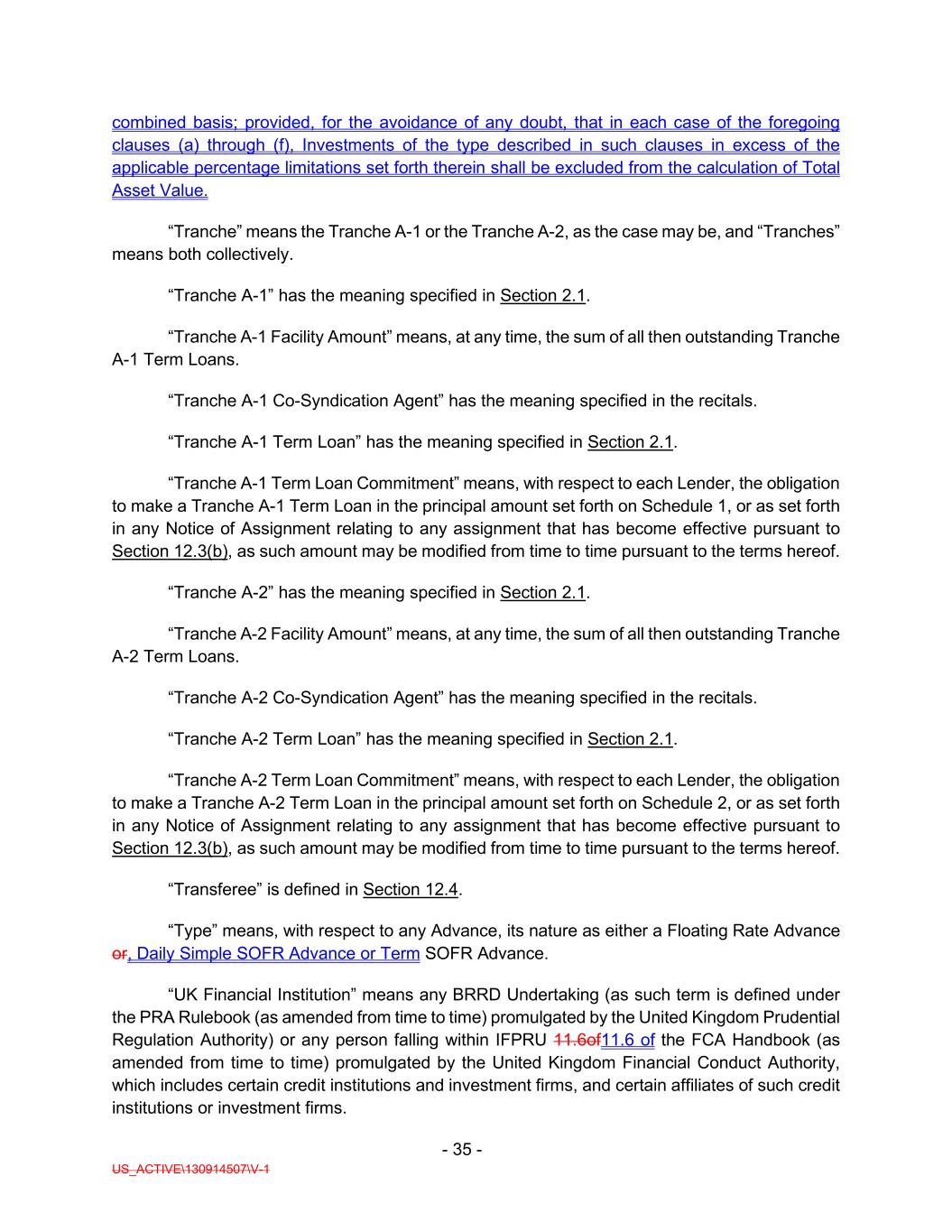 - 35 - US_ACTIVE\130914507\V-1 combined basis; provided, for the avoidance of any doubt, that in each case of the foregoing clauses (a) through (f), Investments of the type described in such clauses in excess of the applicable percentage limitations set forth therein shall be excluded from the calculation of Total Asset Value. “Tranche” means the Tranche A-1 or the Tranche A-2, as the case may be, and “Tranches” means both collectively. “Tranche A-1” has the meaning specified in Section 2.1. “Tranche A-1 Facility Amount” means, at any time, the sum of all then outstanding Tranche A-1 Term Loans. “Tranche A-1 Co-Syndication Agent” has the meaning specified in the recitals. “Tranche A-1 Term Loan” has the meaning specified in Section 2.1. “Tranche A-1 Term Loan Commitment” means, with respect to each Lender, the obligation to make a Tranche A-1 Term Loan in the principal amount set forth on Schedule 1, or as set forth in any Notice of Assignment relating to any assignment that has become effective pursuant to Section 12.3(b), as such amount may be modified from time to time pursuant to the terms hereof. “Tranche A-2” has the meaning specified in Section 2.1. “Tranche A-2 Facility Amount” means, at any time, the sum of all then outstanding Tranche A-2 Term Loans. “Tranche A-2 Co-Syndication Agent” has the meaning specified in the recitals. “Tranche A-2 Term Loan” has the meaning specified in Section 2.1. “Tranche A-2 Term Loan Commitment” means, with respect to each Lender, the obligation to make a Tranche A-2 Term Loan in the principal amount set forth on Schedule 2, or as set forth in any Notice of Assignment relating to any assignment that has become effective pursuant to Section 12.3(b), as such amount may be modified from time to time pursuant to the terms hereof. “Transferee” is defined in Section 12.4. “Type” means, with respect to any Advance, its nature as either a Floating Rate Advance or, Daily Simple SOFR Advance or Term SOFR Advance. “UK Financial Institution” means any BRRD Undertaking (as such term is defined under the PRA Rulebook (as amended from time to time) promulgated by the United Kingdom Prudential Regulation Authority) or any person falling within IFPRU 11.6of11.6 of the FCA Handbook (as amended from time to time) promulgated by the United Kingdom Financial Conduct Authority, which includes certain credit institutions and investment firms, and certain affiliates of such credit institutions or investment firms.