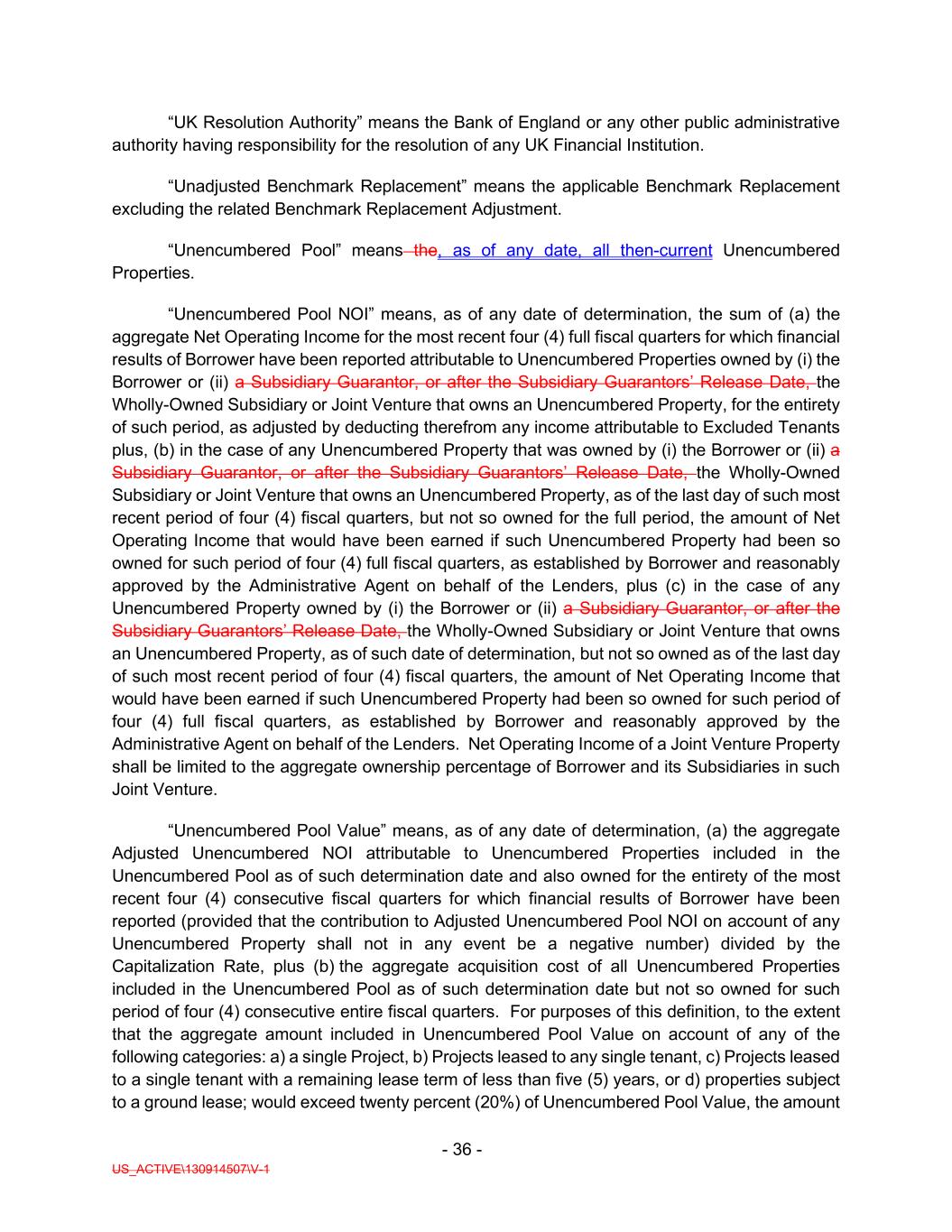 - 36 - US_ACTIVE\130914507\V-1 “UK Resolution Authority” means the Bank of England or any other public administrative authority having responsibility for the resolution of any UK Financial Institution. “Unadjusted Benchmark Replacement” means the applicable Benchmark Replacement excluding the related Benchmark Replacement Adjustment. “Unencumbered Pool” means the, as of any date, all then-current Unencumbered Properties. “Unencumbered Pool NOI” means, as of any date of determination, the sum of (a) the aggregate Net Operating Income for the most recent four (4) full fiscal quarters for which financial results of Borrower have been reported attributable to Unencumbered Properties owned by (i) the Borrower or (ii) a Subsidiary Guarantor, or after the Subsidiary Guarantors’ Release Date, the Wholly-Owned Subsidiary or Joint Venture that owns an Unencumbered Property, for the entirety of such period, as adjusted by deducting therefrom any income attributable to Excluded Tenants plus, (b) in the case of any Unencumbered Property that was owned by (i) the Borrower or (ii) a Subsidiary Guarantor, or after the Subsidiary Guarantors’ Release Date, the Wholly-Owned Subsidiary or Joint Venture that owns an Unencumbered Property, as of the last day of such most recent period of four (4) fiscal quarters, but not so owned for the full period, the amount of Net Operating Income that would have been earned if such Unencumbered Property had been so owned for such period of four (4) full fiscal quarters, as established by Borrower and reasonably approved by the Administrative Agent on behalf of the Lenders, plus (c) in the case of any Unencumbered Property owned by (i) the Borrower or (ii) a Subsidiary Guarantor, or after the Subsidiary Guarantors’ Release Date, the Wholly-Owned Subsidiary or Joint Venture that owns an Unencumbered Property, as of such date of determination, but not so owned as of the last day of such most recent period of four (4) fiscal quarters, the amount of Net Operating Income that would have been earned if such Unencumbered Property had been so owned for such period of four (4) full fiscal quarters, as established by Borrower and reasonably approved by the Administrative Agent on behalf of the Lenders. Net Operating Income of a Joint Venture Property shall be limited to the aggregate ownership percentage of Borrower and its Subsidiaries in such Joint Venture. “Unencumbered Pool Value” means, as of any date of determination, (a) the aggregate Adjusted Unencumbered NOI attributable to Unencumbered Properties included in the Unencumbered Pool as of such determination date and also owned for the entirety of the most recent four (4) consecutive fiscal quarters for which financial results of Borrower have been reported (provided that the contribution to Adjusted Unencumbered Pool NOI on account of any Unencumbered Property shall not in any event be a negative number) divided by the Capitalization Rate, plus (b) the aggregate acquisition cost of all Unencumbered Properties included in the Unencumbered Pool as of such determination date but not so owned for such period of four (4) consecutive entire fiscal quarters. For purposes of this definition, to the extent that the aggregate amount included in Unencumbered Pool Value on account of any of the following categories: a) a single Project, b) Projects leased to any single tenant, c) Projects leased to a single tenant with a remaining lease term of less than five (5) years, or d) properties subject to a ground lease; would exceed twenty percent (20%) of Unencumbered Pool Value, the amount