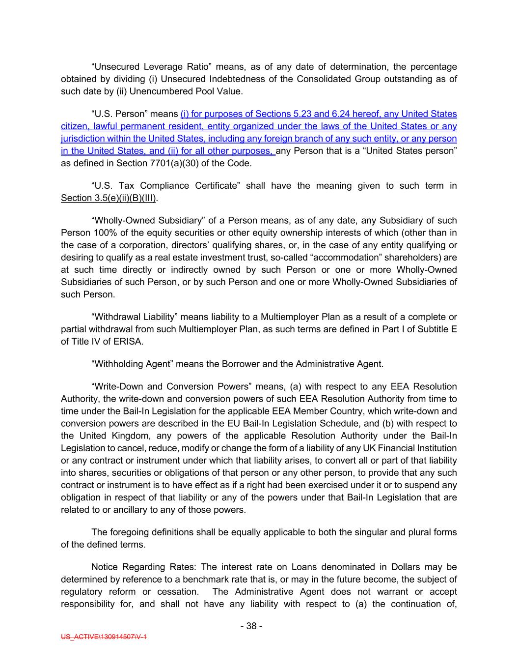 - 38 - US_ACTIVE\130914507\V-1 “Unsecured Leverage Ratio” means, as of any date of determination, the percentage obtained by dividing (i) Unsecured Indebtedness of the Consolidated Group outstanding as of such date by (ii) Unencumbered Pool Value. “U.S. Person” means (i) for purposes of Sections 5.23 and 6.24 hereof, any United States citizen, lawful permanent resident, entity organized under the laws of the United States or any jurisdiction within the United States, including any foreign branch of any such entity, or any person in the United States, and (ii) for all other purposes, any Person that is a “United States person” as defined in Section 7701(a)(30) of the Code. “U.S. Tax Compliance Certificate” shall have the meaning given to such term in Section 3.5(e)(ii)(B)(III). “Wholly-Owned Subsidiary” of a Person means, as of any date, any Subsidiary of such Person 100% of the equity securities or other equity ownership interests of which (other than in the case of a corporation, directors’ qualifying shares, or, in the case of any entity qualifying or desiring to qualify as a real estate investment trust, so-called “accommodation” shareholders) are at such time directly or indirectly owned by such Person or one or more Wholly-Owned Subsidiaries of such Person, or by such Person and one or more Wholly-Owned Subsidiaries of such Person. “Withdrawal Liability” means liability to a Multiemployer Plan as a result of a complete or partial withdrawal from such Multiemployer Plan, as such terms are defined in Part I of Subtitle E of Title IV of ERISA. “Withholding Agent” means the Borrower and the Administrative Agent. “Write-Down and Conversion Powers” means, (a) with respect to any EEA Resolution Authority, the write-down and conversion powers of such EEA Resolution Authority from time to time under the Bail-In Legislation for the applicable EEA Member Country, which write-down and conversion powers are described in the EU Bail-In Legislation Schedule, and (b) with respect to the United Kingdom, any powers of the applicable Resolution Authority under the Bail-In Legislation to cancel, reduce, modify or change the form of a liability of any UK Financial Institution or any contract or instrument under which that liability arises, to convert all or part of that liability into shares, securities or obligations of that person or any other person, to provide that any such contract or instrument is to have effect as if a right had been exercised under it or to suspend any obligation in respect of that liability or any of the powers under that Bail-In Legislation that are related to or ancillary to any of those powers. The foregoing definitions shall be equally applicable to both the singular and plural forms of the defined terms. Notice Regarding Rates: The interest rate on Loans denominated in Dollars may be determined by reference to a benchmark rate that is, or may in the future become, the subject of regulatory reform or cessation. The Administrative Agent does not warrant or accept responsibility for, and shall not have any liability with respect to (a) the continuation of,