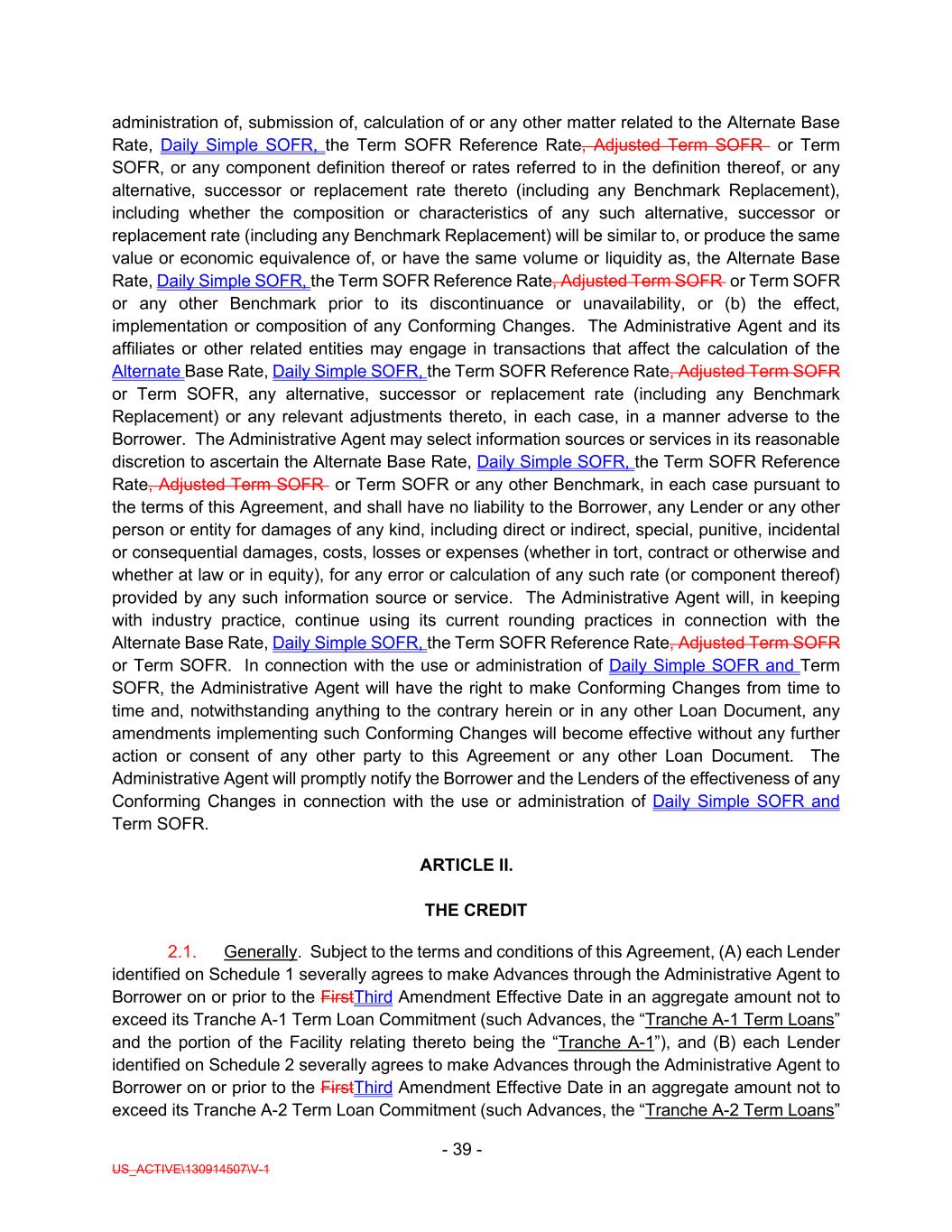 - 39 - US_ACTIVE\130914507\V-1 administration of, submission of, calculation of or any other matter related to the Alternate Base Rate, Daily Simple SOFR, the Term SOFR Reference Rate, Adjusted Term SOFR or Term SOFR, or any component definition thereof or rates referred to in the definition thereof, or any alternative, successor or replacement rate thereto (including any Benchmark Replacement), including whether the composition or characteristics of any such alternative, successor or replacement rate (including any Benchmark Replacement) will be similar to, or produce the same value or economic equivalence of, or have the same volume or liquidity as, the Alternate Base Rate, Daily Simple SOFR, the Term SOFR Reference Rate, Adjusted Term SOFR or Term SOFR or any other Benchmark prior to its discontinuance or unavailability, or (b) the effect, implementation or composition of any Conforming Changes. The Administrative Agent and its affiliates or other related entities may engage in transactions that affect the calculation of the Alternate Base Rate, Daily Simple SOFR, the Term SOFR Reference Rate, Adjusted Term SOFR or Term SOFR, any alternative, successor or replacement rate (including any Benchmark Replacement) or any relevant adjustments thereto, in each case, in a manner adverse to the Borrower. The Administrative Agent may select information sources or services in its reasonable discretion to ascertain the Alternate Base Rate, Daily Simple SOFR, the Term SOFR Reference Rate, Adjusted Term SOFR or Term SOFR or any other Benchmark, in each case pursuant to the terms of this Agreement, and shall have no liability to the Borrower, any Lender or any other person or entity for damages of any kind, including direct or indirect, special, punitive, incidental or consequential damages, costs, losses or expenses (whether in tort, contract or otherwise and whether at law or in equity), for any error or calculation of any such rate (or component thereof) provided by any such information source or service. The Administrative Agent will, in keeping with industry practice, continue using its current rounding practices in connection with the Alternate Base Rate, Daily Simple SOFR, the Term SOFR Reference Rate, Adjusted Term SOFR or Term SOFR. In connection with the use or administration of Daily Simple SOFR and Term SOFR, the Administrative Agent will have the right to make Conforming Changes from time to time and, notwithstanding anything to the contrary herein or in any other Loan Document, any amendments implementing such Conforming Changes will become effective without any further action or consent of any other party to this Agreement or any other Loan Document. The Administrative Agent will promptly notify the Borrower and the Lenders of the effectiveness of any Conforming Changes in connection with the use or administration of Daily Simple SOFR and Term SOFR. ARTICLE II. THE CREDIT Generally. Subject to the terms and conditions of this Agreement, (A) each Lender identified on Schedule 1 severally agrees to make Advances through the Administrative Agent to Borrower on or prior to the FirstThird Amendment Effective Date in an aggregate amount not to exceed its Tranche A-1 Term Loan Commitment (such Advances, the “Tranche A-1 Term Loans” and the portion of the Facility relating thereto being the “Tranche A-1”), and (B) each Lender identified on Schedule 2 severally agrees to make Advances through the Administrative Agent to Borrower on or prior to the FirstThird Amendment Effective Date in an aggregate amount not to exceed its Tranche A-2 Term Loan Commitment (such Advances, the “Tranche A-2 Term Loans”