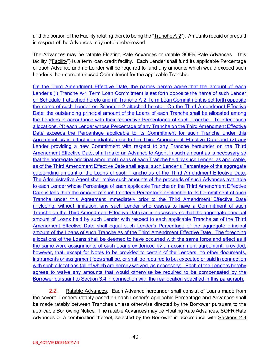 - 40 - US_ACTIVE\130914507\V-1 and the portion of the Facility relating thereto being the “Tranche A-2”). Amounts repaid or prepaid in respect of the Advances may not be reborrowed. The Advances may be ratable Floating Rate Advances or ratable SOFR Rate Advances. This facility (“Facility”) is a term loan credit facility. Each Lender shall fund its applicable Percentage of each Advance and no Lender will be required to fund any amounts which would exceed such Lender’s then-current unused Commitment for the applicable Tranche. On the Third Amendment Effective Date, the parties hereto agree that the amount of each Lender’s (i) Tranche A-1 Term Loan Commitment is set forth opposite the name of such Lender on Schedule 1 attached hereto and (ii) Tranche A-2 Term Loan Commitment is set forth opposite the name of such Lender on Schedule 2 attached hereto. On the Third Amendment Effective Date, the outstanding principal amount of the Loans of each Tranche shall be allocated among the Lenders in accordance with their respective Percentages of such Tranche. To effect such allocations, (1) each Lender whose Percentage of any Tranche on the Third Amendment Effective Date exceeds the Percentage applicable to its Commitment for such Tranche under this Agreement as in effect immediately prior to the Third Amendment Effective Date and (2) any Lender providing a new Commitment with respect to any Tranche hereunder on the Third Amendment Effective Date, shall make an Advance to Agent in such amount as is necessary so that the aggregate principal amount of Loans of each Tranche held by such Lender, as applicable, as of the Third Amendment Effective Date shall equal such Lender’s Percentage of the aggregate outstanding amount of the Loans of such Tranche as of the Third Amendment Effective Date. The Administrative Agent shall make such amounts of the proceeds of such Advances available to each Lender whose Percentage of each applicable Tranche on the Third Amendment Effective Date is less than the amount of such Lender’s Percentage applicable to its Commitment of such Tranche under this Agreement immediately prior to the Third Amendment Effective Date (including, without limitation, any such Lender who ceases to have a Commitment of such Tranche on the Third Amendment Effective Date) as is necessary so that the aggregate principal amount of Loans held by such Lender with respect to each applicable Tranche as of the Third Amendment Effective Date shall equal such Lender’s Percentage of the aggregate principal amount of the Loans of such Tranche as of the Third Amendment Effective Date. The foregoing allocations of the Loans shall be deemed to have occurred with the same force and effect as if the same were assignments of such Loans evidenced by an assignment agreement; provided, however, that, except for Notes to be provided to certain of the Lenders, no other documents, instruments or assignment fees shall be, or shall be required to be, executed or paid in connection with such allocations (all of which are hereby waived, as necessary). Each of the Lenders hereby agrees to waive any amounts that would otherwise be required to be compensated by the Borrower pursuant to Section 3.4 in connection with the reallocation specified in this paragraph. Ratable Advances. Each Advance hereunder shall consist of Loans made from the several Lenders ratably based on each Lender’s applicable Percentage and Advances shall be made ratably between Tranches unless otherwise directed by the Borrower pursuant to the applicable Borrowing Notice. The ratable Advances may be Floating Rate Advances, SOFR Rate Advances or a combination thereof, selected by the Borrower in accordance with Sections 2.8
