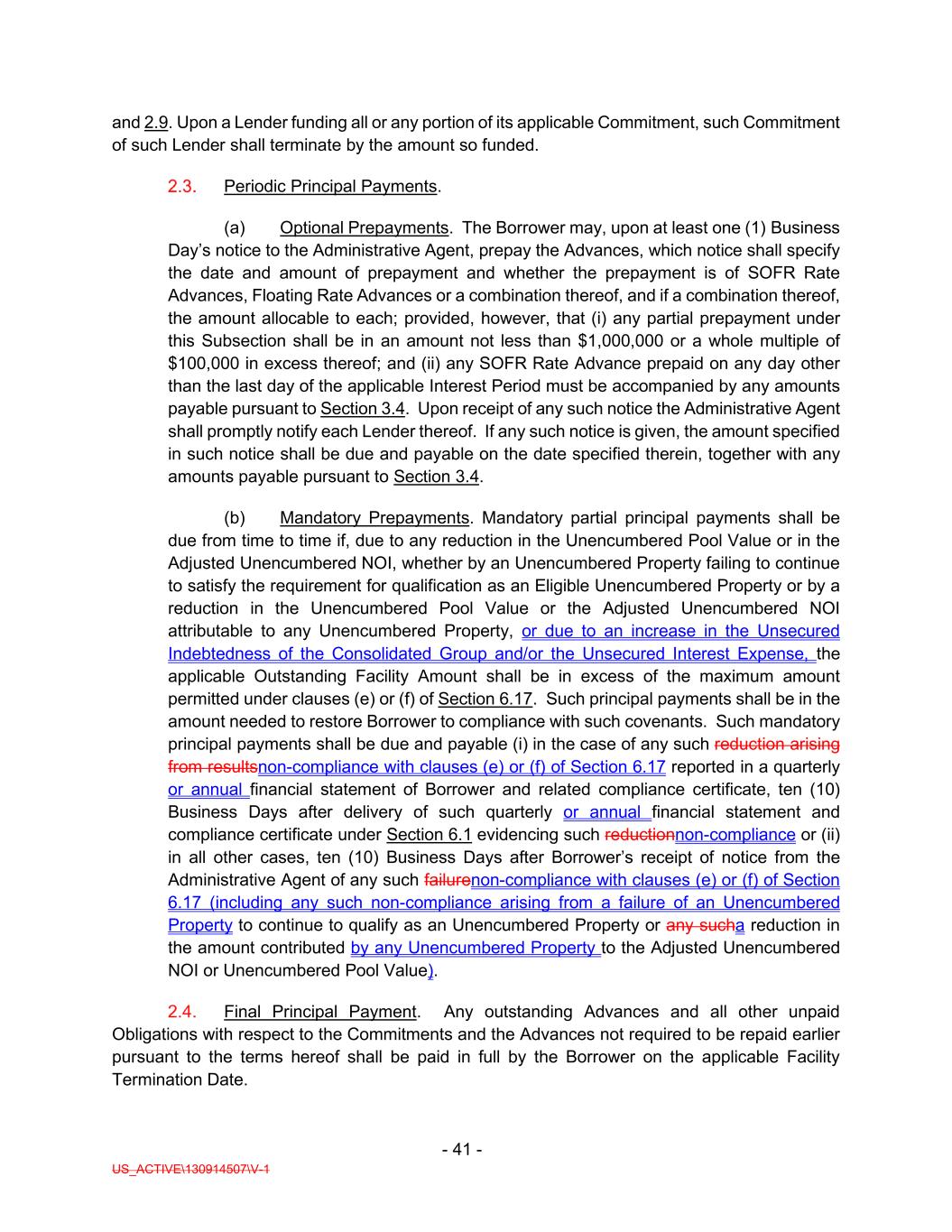 - 41 - US_ACTIVE\130914507\V-1 and 2.9. Upon a Lender funding all or any portion of its applicable Commitment, such Commitment of such Lender shall terminate by the amount so funded. Periodic Principal Payments. (a) Optional Prepayments. The Borrower may, upon at least one (1) Business Day’s notice to the Administrative Agent, prepay the Advances, which notice shall specify the date and amount of prepayment and whether the prepayment is of SOFR Rate Advances, Floating Rate Advances or a combination thereof, and if a combination thereof, the amount allocable to each; provided, however, that (i) any partial prepayment under this Subsection shall be in an amount not less than $1,000,000 or a whole multiple of $100,000 in excess thereof; and (ii) any SOFR Rate Advance prepaid on any day other than the last day of the applicable Interest Period must be accompanied by any amounts payable pursuant to Section 3.4. Upon receipt of any such notice the Administrative Agent shall promptly notify each Lender thereof. If any such notice is given, the amount specified in such notice shall be due and payable on the date specified therein, together with any amounts payable pursuant to Section 3.4. (b) Mandatory Prepayments. Mandatory partial principal payments shall be due from time to time if, due to any reduction in the Unencumbered Pool Value or in the Adjusted Unencumbered NOI, whether by an Unencumbered Property failing to continue to satisfy the requirement for qualification as an Eligible Unencumbered Property or by a reduction in the Unencumbered Pool Value or the Adjusted Unencumbered NOI attributable to any Unencumbered Property, or due to an increase in the Unsecured Indebtedness of the Consolidated Group and/or the Unsecured Interest Expense, the applicable Outstanding Facility Amount shall be in excess of the maximum amount permitted under clauses (e) or (f) of Section 6.17. Such principal payments shall be in the amount needed to restore Borrower to compliance with such covenants. Such mandatory principal payments shall be due and payable (i) in the case of any such reduction arising from resultsnon-compliance with clauses (e) or (f) of Section 6.17 reported in a quarterly or annual financial statement of Borrower and related compliance certificate, ten (10) Business Days after delivery of such quarterly or annual financial statement and compliance certificate under Section 6.1 evidencing such reductionnon-compliance or (ii) in all other cases, ten (10) Business Days after Borrower’s receipt of notice from the Administrative Agent of any such failurenon-compliance with clauses (e) or (f) of Section 6.17 (including any such non-compliance arising from a failure of an Unencumbered Property to continue to qualify as an Unencumbered Property or any sucha reduction in the amount contributed by any Unencumbered Property to the Adjusted Unencumbered NOI or Unencumbered Pool Value). Final Principal Payment. Any outstanding Advances and all other unpaid Obligations with respect to the Commitments and the Advances not required to be repaid earlier pursuant to the terms hereof shall be paid in full by the Borrower on the applicable Facility Termination Date.
