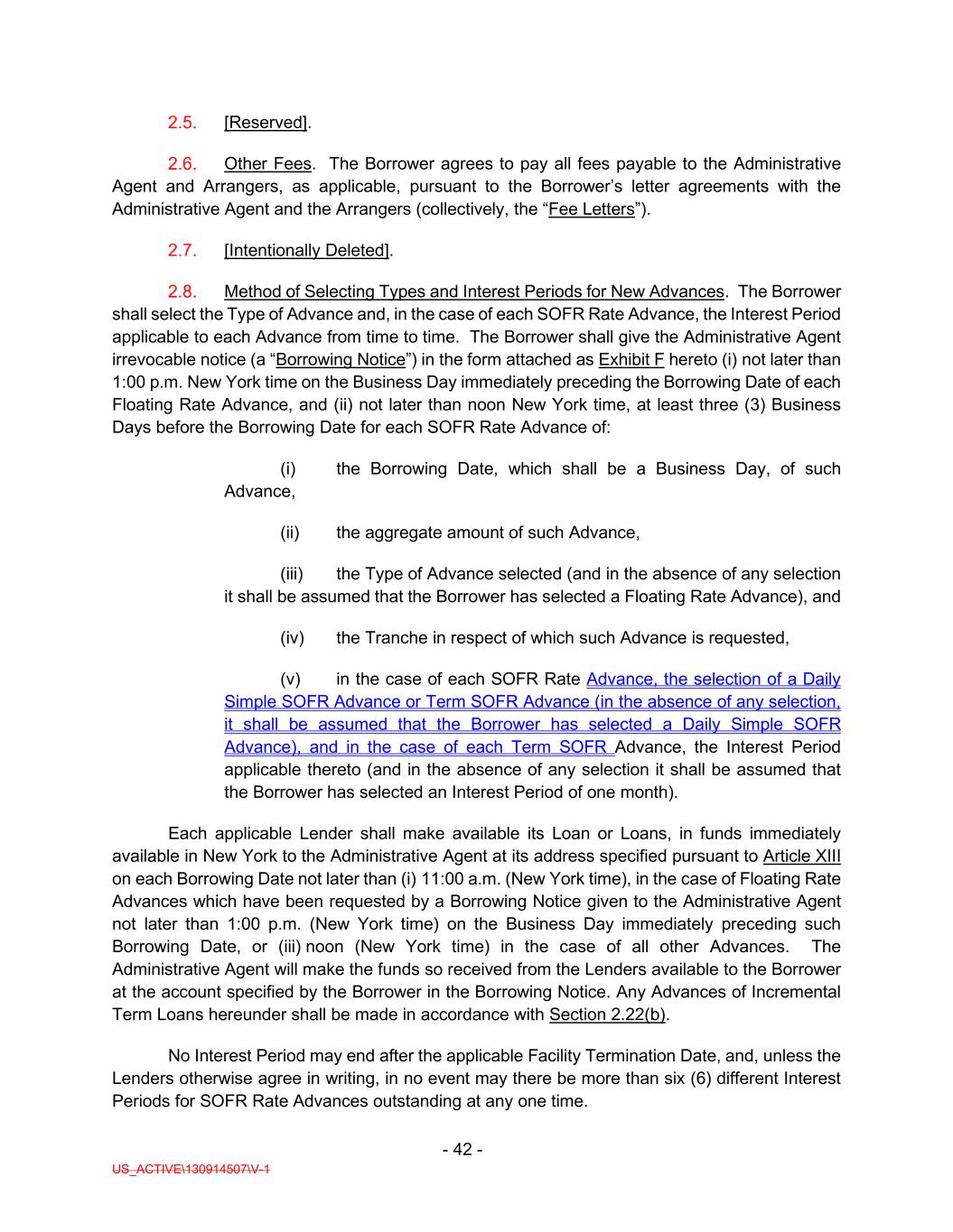 - 42 - US_ACTIVE\130914507\V-1 [Reserved]. Other Fees. The Borrower agrees to pay all fees payable to the Administrative Agent and Arrangers, as applicable, pursuant to the Borrower’s letter agreements with the Administrative Agent and the Arrangers (collectively, the “Fee Letters”). [Intentionally Deleted]. Method of Selecting Types and Interest Periods for New Advances. The Borrower shall select the Type of Advance and, in the case of each SOFR Rate Advance, the Interest Period applicable to each Advance from time to time. The Borrower shall give the Administrative Agent irrevocable notice (a “Borrowing Notice”) in the form attached as Exhibit F hereto (i) not later than 1:00 p.m. New York time on the Business Day immediately preceding the Borrowing Date of each Floating Rate Advance, and (ii) not later than noon New York time, at least three (3) Business Days before the Borrowing Date for each SOFR Rate Advance of: (i) the Borrowing Date, which shall be a Business Day, of such Advance, (ii) the aggregate amount of such Advance, (iii) the Type of Advance selected (and in the absence of any selection it shall be assumed that the Borrower has selected a Floating Rate Advance), and (iv) the Tranche in respect of which such Advance is requested, (v) in the case of each SOFR Rate Advance, the selection of a Daily Simple SOFR Advance or Term SOFR Advance (in the absence of any selection, it shall be assumed that the Borrower has selected a Daily Simple SOFR Advance), and in the case of each Term SOFR Advance, the Interest Period applicable thereto (and in the absence of any selection it shall be assumed that the Borrower has selected an Interest Period of one month). Each applicable Lender shall make available its Loan or Loans, in funds immediately available in New York to the Administrative Agent at its address specified pursuant to Article XIII on each Borrowing Date not later than (i) 11:00 a.m. (New York time), in the case of Floating Rate Advances which have been requested by a Borrowing Notice given to the Administrative Agent not later than 1:00 p.m. (New York time) on the Business Day immediately preceding such Borrowing Date, or (iii) noon (New York time) in the case of all other Advances. The Administrative Agent will make the funds so received from the Lenders available to the Borrower at the account specified by the Borrower in the Borrowing Notice. Any Advances of Incremental Term Loans hereunder shall be made in accordance with Section 2.22(b). No Interest Period may end after the applicable Facility Termination Date, and, unless the Lenders otherwise agree in writing, in no event may there be more than six (6) different Interest Periods for SOFR Rate Advances outstanding at any one time.