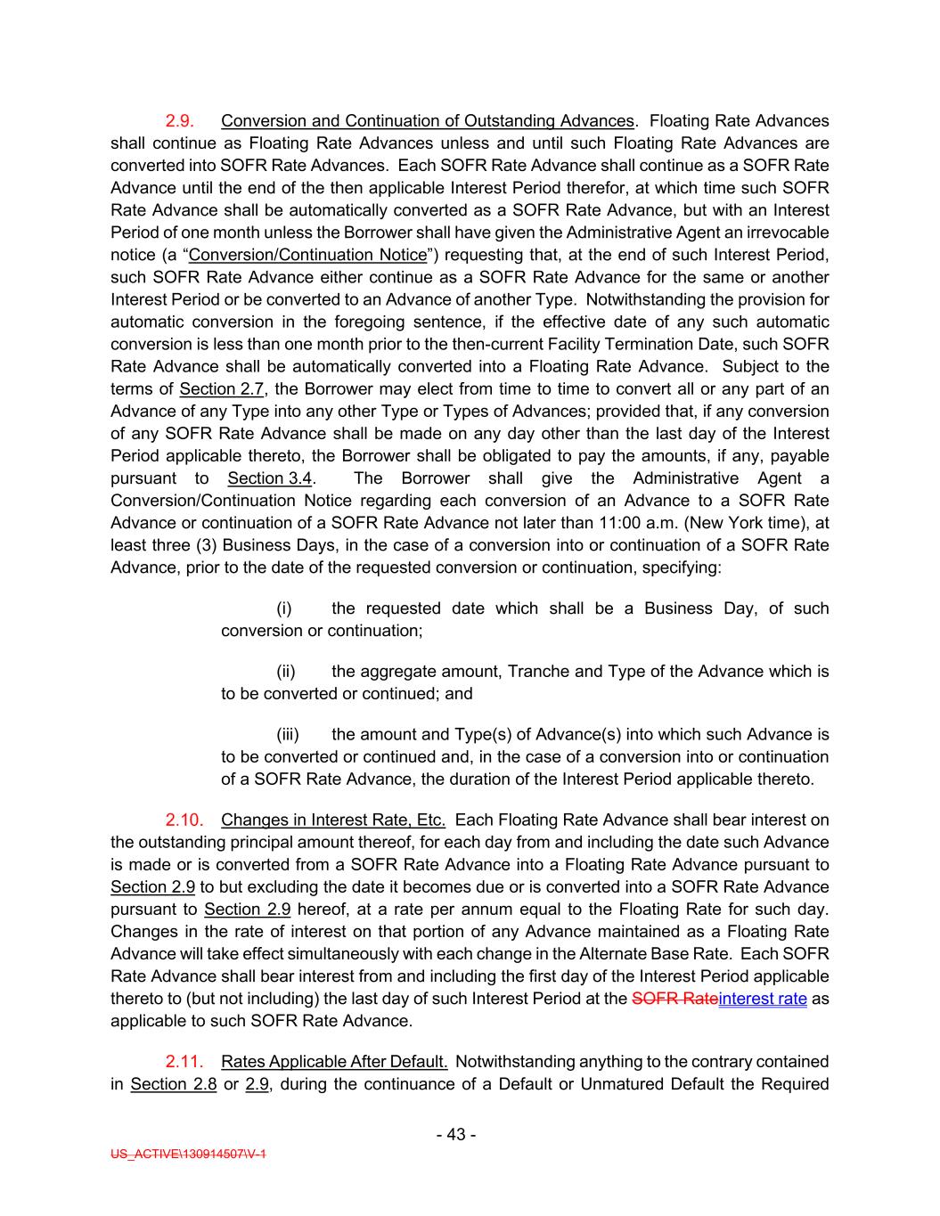 - 43 - US_ACTIVE\130914507\V-1 Conversion and Continuation of Outstanding Advances. Floating Rate Advances shall continue as Floating Rate Advances unless and until such Floating Rate Advances are converted into SOFR Rate Advances. Each SOFR Rate Advance shall continue as a SOFR Rate Advance until the end of the then applicable Interest Period therefor, at which time such SOFR Rate Advance shall be automatically converted as a SOFR Rate Advance, but with an Interest Period of one month unless the Borrower shall have given the Administrative Agent an irrevocable notice (a “Conversion/Continuation Notice”) requesting that, at the end of such Interest Period, such SOFR Rate Advance either continue as a SOFR Rate Advance for the same or another Interest Period or be converted to an Advance of another Type. Notwithstanding the provision for automatic conversion in the foregoing sentence, if the effective date of any such automatic conversion is less than one month prior to the then-current Facility Termination Date, such SOFR Rate Advance shall be automatically converted into a Floating Rate Advance. Subject to the terms of Section 2.7, the Borrower may elect from time to time to convert all or any part of an Advance of any Type into any other Type or Types of Advances; provided that, if any conversion of any SOFR Rate Advance shall be made on any day other than the last day of the Interest Period applicable thereto, the Borrower shall be obligated to pay the amounts, if any, payable pursuant to Section 3.4. The Borrower shall give the Administrative Agent a Conversion/Continuation Notice regarding each conversion of an Advance to a SOFR Rate Advance or continuation of a SOFR Rate Advance not later than 11:00 a.m. (New York time), at least three (3) Business Days, in the case of a conversion into or continuation of a SOFR Rate Advance, prior to the date of the requested conversion or continuation, specifying: (i) the requested date which shall be a Business Day, of such conversion or continuation; (ii) the aggregate amount, Tranche and Type of the Advance which is to be converted or continued; and (iii) the amount and Type(s) of Advance(s) into which such Advance is to be converted or continued and, in the case of a conversion into or continuation of a SOFR Rate Advance, the duration of the Interest Period applicable thereto. Changes in Interest Rate, Etc. Each Floating Rate Advance shall bear interest on the outstanding principal amount thereof, for each day from and including the date such Advance is made or is converted from a SOFR Rate Advance into a Floating Rate Advance pursuant to Section 2.9 to but excluding the date it becomes due or is converted into a SOFR Rate Advance pursuant to Section 2.9 hereof, at a rate per annum equal to the Floating Rate for such day. Changes in the rate of interest on that portion of any Advance maintained as a Floating Rate Advance will take effect simultaneously with each change in the Alternate Base Rate. Each SOFR Rate Advance shall bear interest from and including the first day of the Interest Period applicable thereto to (but not including) the last day of such Interest Period at the SOFR Rateinterest rate as applicable to such SOFR Rate Advance. Rates Applicable After Default. Notwithstanding anything to the contrary contained in Section 2.8 or 2.9, during the continuance of a Default or Unmatured Default the Required