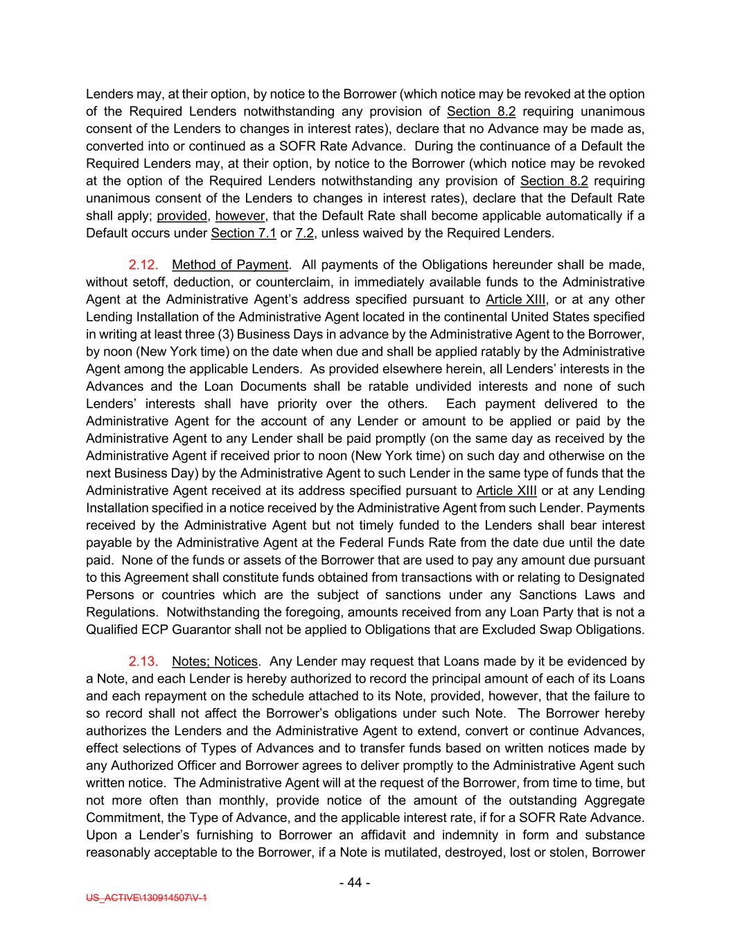 - 44 - US_ACTIVE\130914507\V-1 Lenders may, at their option, by notice to the Borrower (which notice may be revoked at the option of the Required Lenders notwithstanding any provision of Section 8.2 requiring unanimous consent of the Lenders to changes in interest rates), declare that no Advance may be made as, converted into or continued as a SOFR Rate Advance. During the continuance of a Default the Required Lenders may, at their option, by notice to the Borrower (which notice may be revoked at the option of the Required Lenders notwithstanding any provision of Section 8.2 requiring unanimous consent of the Lenders to changes in interest rates), declare that the Default Rate shall apply; provided, however, that the Default Rate shall become applicable automatically if a Default occurs under Section 7.1 or 7.2, unless waived by the Required Lenders. Method of Payment. All payments of the Obligations hereunder shall be made, without setoff, deduction, or counterclaim, in immediately available funds to the Administrative Agent at the Administrative Agent’s address specified pursuant to Article XIII, or at any other Lending Installation of the Administrative Agent located in the continental United States specified in writing at least three (3) Business Days in advance by the Administrative Agent to the Borrower, by noon (New York time) on the date when due and shall be applied ratably by the Administrative Agent among the applicable Lenders. As provided elsewhere herein, all Lenders’ interests in the Advances and the Loan Documents shall be ratable undivided interests and none of such Lenders’ interests shall have priority over the others. Each payment delivered to the Administrative Agent for the account of any Lender or amount to be applied or paid by the Administrative Agent to any Lender shall be paid promptly (on the same day as received by the Administrative Agent if received prior to noon (New York time) on such day and otherwise on the next Business Day) by the Administrative Agent to such Lender in the same type of funds that the Administrative Agent received at its address specified pursuant to Article XIII or at any Lending Installation specified in a notice received by the Administrative Agent from such Lender. Payments received by the Administrative Agent but not timely funded to the Lenders shall bear interest payable by the Administrative Agent at the Federal Funds Rate from the date due until the date paid. None of the funds or assets of the Borrower that are used to pay any amount due pursuant to this Agreement shall constitute funds obtained from transactions with or relating to Designated Persons or countries which are the subject of sanctions under any Sanctions Laws and Regulations. Notwithstanding the foregoing, amounts received from any Loan Party that is not a Qualified ECP Guarantor shall not be applied to Obligations that are Excluded Swap Obligations. Notes; Notices. Any Lender may request that Loans made by it be evidenced by a Note, and each Lender is hereby authorized to record the principal amount of each of its Loans and each repayment on the schedule attached to its Note, provided, however, that the failure to so record shall not affect the Borrower’s obligations under such Note. The Borrower hereby authorizes the Lenders and the Administrative Agent to extend, convert or continue Advances, effect selections of Types of Advances and to transfer funds based on written notices made by any Authorized Officer and Borrower agrees to deliver promptly to the Administrative Agent such written notice. The Administrative Agent will at the request of the Borrower, from time to time, but not more often than monthly, provide notice of the amount of the outstanding Aggregate Commitment, the Type of Advance, and the applicable interest rate, if for a SOFR Rate Advance. Upon a Lender’s furnishing to Borrower an affidavit and indemnity in form and substance reasonably acceptable to the Borrower, if a Note is mutilated, destroyed, lost or stolen, Borrower