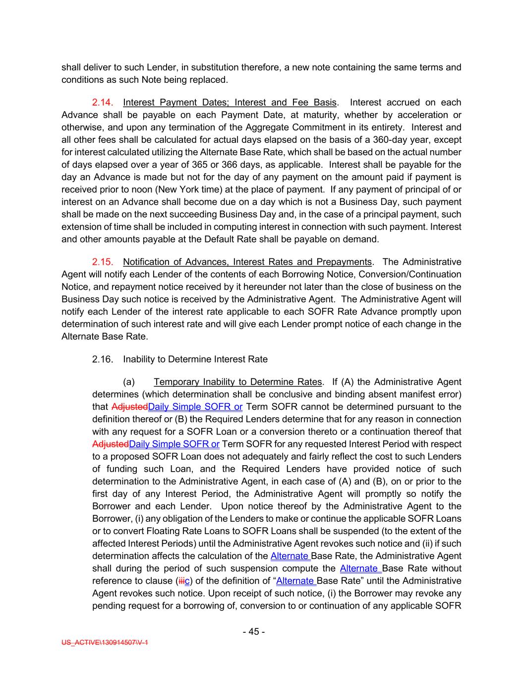 - 45 - US_ACTIVE\130914507\V-1 shall deliver to such Lender, in substitution therefore, a new note containing the same terms and conditions as such Note being replaced. Interest Payment Dates; Interest and Fee Basis. Interest accrued on each Advance shall be payable on each Payment Date, at maturity, whether by acceleration or otherwise, and upon any termination of the Aggregate Commitment in its entirety. Interest and all other fees shall be calculated for actual days elapsed on the basis of a 360-day year, except for interest calculated utilizing the Alternate Base Rate, which shall be based on the actual number of days elapsed over a year of 365 or 366 days, as applicable. Interest shall be payable for the day an Advance is made but not for the day of any payment on the amount paid if payment is received prior to noon (New York time) at the place of payment. If any payment of principal of or interest on an Advance shall become due on a day which is not a Business Day, such payment shall be made on the next succeeding Business Day and, in the case of a principal payment, such extension of time shall be included in computing interest in connection with such payment. Interest and other amounts payable at the Default Rate shall be payable on demand. Notification of Advances, Interest Rates and Prepayments. The Administrative Agent will notify each Lender of the contents of each Borrowing Notice, Conversion/Continuation Notice, and repayment notice received by it hereunder not later than the close of business on the Business Day such notice is received by the Administrative Agent. The Administrative Agent will notify each Lender of the interest rate applicable to each SOFR Rate Advance promptly upon determination of such interest rate and will give each Lender prompt notice of each change in the Alternate Base Rate. Inability to Determine Interest Rate (a) Temporary Inability to Determine Rates. If (A) the Administrative Agent determines (which determination shall be conclusive and binding absent manifest error) that AdjustedDaily Simple SOFR or Term SOFR cannot be determined pursuant to the definition thereof or (B) the Required Lenders determine that for any reason in connection with any request for a SOFR Loan or a conversion thereto or a continuation thereof that AdjustedDaily Simple SOFR or Term SOFR for any requested Interest Period with respect to a proposed SOFR Loan does not adequately and fairly reflect the cost to such Lenders of funding such Loan, and the Required Lenders have provided notice of such determination to the Administrative Agent, in each case of (A) and (B), on or prior to the first day of any Interest Period, the Administrative Agent will promptly so notify the Borrower and each Lender. Upon notice thereof by the Administrative Agent to the Borrower, (i) any obligation of the Lenders to make or continue the applicable SOFR Loans or to convert Floating Rate Loans to SOFR Loans shall be suspended (to the extent of the affected Interest Periods) until the Administrative Agent revokes such notice and (ii) if such determination affects the calculation of the Alternate Base Rate, the Administrative Agent shall during the period of such suspension compute the Alternate Base Rate without reference to clause (iiic) of the definition of “Alternate Base Rate” until the Administrative Agent revokes such notice. Upon receipt of such notice, (i) the Borrower may revoke any pending request for a borrowing of, conversion to or continuation of any applicable SOFR
