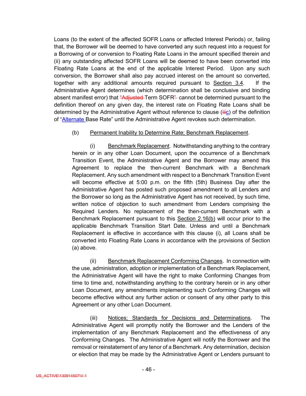 - 46 - US_ACTIVE\130914507\V-1 Loans (to the extent of the affected SOFR Loans or affected Interest Periods) or, failing that, the Borrower will be deemed to have converted any such request into a request for a Borrowing of or conversion to Floating Rate Loans in the amount specified therein and (ii) any outstanding affected SOFR Loans will be deemed to have been converted into Floating Rate Loans at the end of the applicable Interest Period. Upon any such conversion, the Borrower shall also pay accrued interest on the amount so converted, together with any additional amounts required pursuant to Section 3.4. If the Administrative Agent determines (which determination shall be conclusive and binding absent manifest error) that “Adjusted Term SOFR” cannot be determined pursuant to the definition thereof on any given day, the interest rate on Floating Rate Loans shall be determined by the Administrative Agent without reference to clause (iiic) of the definition of “Alternate Base Rate” until the Administrative Agent revokes such determination. (b) Permanent Inability to Determine Rate; Benchmark Replacement. (i) Benchmark Replacement. Notwithstanding anything to the contrary herein or in any other Loan Document, upon the occurrence of a Benchmark Transition Event, the Administrative Agent and the Borrower may amend this Agreement to replace the then-current Benchmark with a Benchmark Replacement. Any such amendment with respect to a Benchmark Transition Event will become effective at 5:00 p.m. on the fifth (5th) Business Day after the Administrative Agent has posted such proposed amendment to all Lenders and the Borrower so long as the Administrative Agent has not received, by such time, written notice of objection to such amendment from Lenders comprising the Required Lenders. No replacement of the then-current Benchmark with a Benchmark Replacement pursuant to this Section 2.16(b) will occur prior to the applicable Benchmark Transition Start Date. Unless and until a Benchmark Replacement is effective in accordance with this clause (i), all Loans shall be converted into Floating Rate Loans in accordance with the provisions of Section (a) above. (ii) Benchmark Replacement Conforming Changes. In connection with the use, administration, adoption or implementation of a Benchmark Replacement, the Administrative Agent will have the right to make Conforming Changes from time to time and, notwithstanding anything to the contrary herein or in any other Loan Document, any amendments implementing such Conforming Changes will become effective without any further action or consent of any other party to this Agreement or any other Loan Document. (iii) Notices; Standards for Decisions and Determinations. The Administrative Agent will promptly notify the Borrower and the Lenders of the implementation of any Benchmark Replacement and the effectiveness of any Conforming Changes. The Administrative Agent will notify the Borrower and the removal or reinstatement of any tenor of a Benchmark. Any determination, decision or election that may be made by the Administrative Agent or Lenders pursuant to