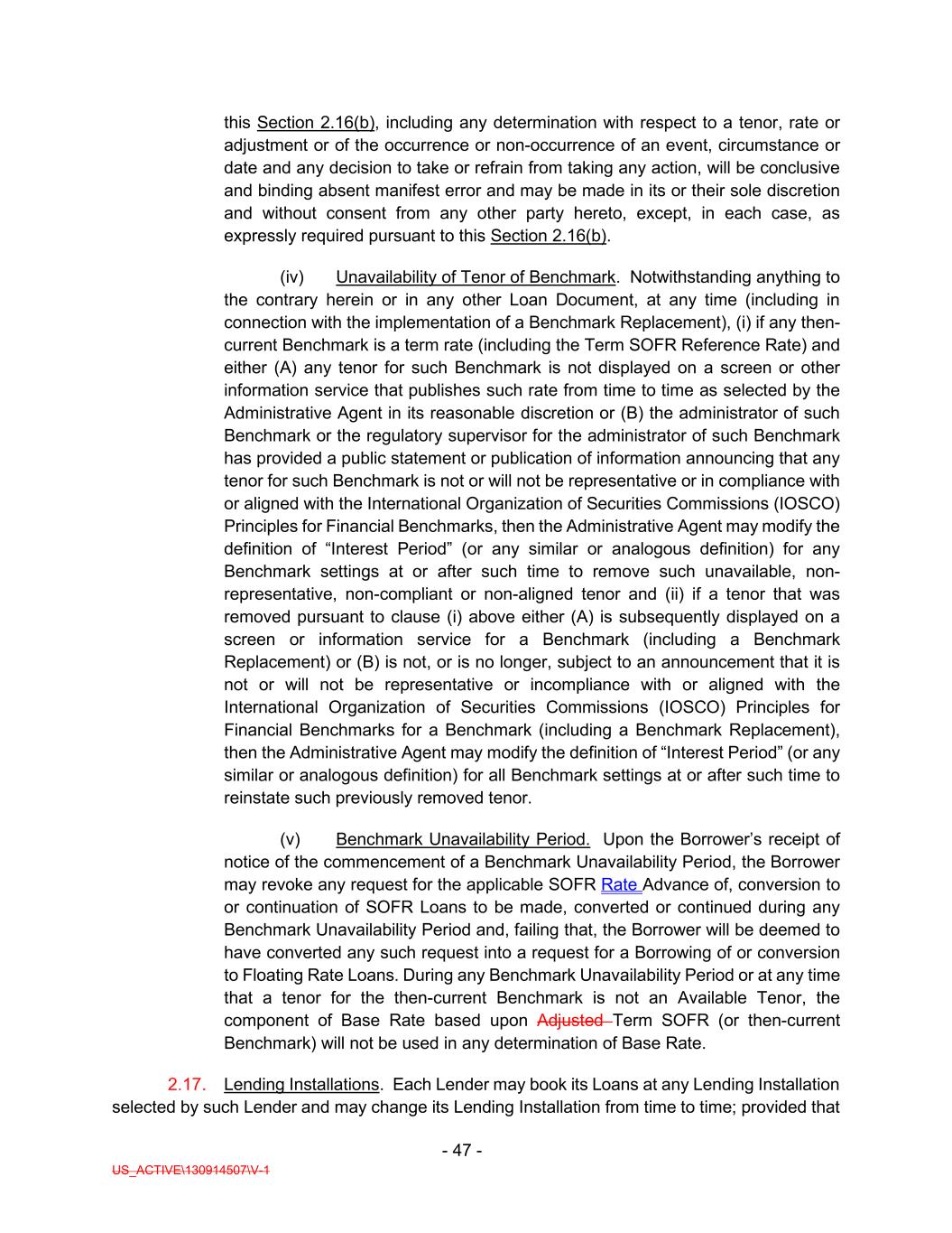 - 47 - US_ACTIVE\130914507\V-1 this Section 2.16(b), including any determination with respect to a tenor, rate or adjustment or of the occurrence or non-occurrence of an event, circumstance or date and any decision to take or refrain from taking any action, will be conclusive and binding absent manifest error and may be made in its or their sole discretion and without consent from any other party hereto, except, in each case, as expressly required pursuant to this Section 2.16(b). (iv) Unavailability of Tenor of Benchmark. Notwithstanding anything to the contrary herein or in any other Loan Document, at any time (including in connection with the implementation of a Benchmark Replacement), (i) if any then- current Benchmark is a term rate (including the Term SOFR Reference Rate) and either (A) any tenor for such Benchmark is not displayed on a screen or other information service that publishes such rate from time to time as selected by the Administrative Agent in its reasonable discretion or (B) the administrator of such Benchmark or the regulatory supervisor for the administrator of such Benchmark has provided a public statement or publication of information announcing that any tenor for such Benchmark is not or will not be representative or in compliance with or aligned with the International Organization of Securities Commissions (IOSCO) Principles for Financial Benchmarks, then the Administrative Agent may modify the definition of “Interest Period” (or any similar or analogous definition) for any Benchmark settings at or after such time to remove such unavailable, non- representative, non-compliant or non-aligned tenor and (ii) if a tenor that was removed pursuant to clause (i) above either (A) is subsequently displayed on a screen or information service for a Benchmark (including a Benchmark Replacement) or (B) is not, or is no longer, subject to an announcement that it is not or will not be representative or incompliance with or aligned with the International Organization of Securities Commissions (IOSCO) Principles for Financial Benchmarks for a Benchmark (including a Benchmark Replacement), then the Administrative Agent may modify the definition of “Interest Period” (or any similar or analogous definition) for all Benchmark settings at or after such time to reinstate such previously removed tenor. (v) Benchmark Unavailability Period. Upon the Borrower’s receipt of notice of the commencement of a Benchmark Unavailability Period, the Borrower may revoke any request for the applicable SOFR Rate Advance of, conversion to or continuation of SOFR Loans to be made, converted or continued during any Benchmark Unavailability Period and, failing that, the Borrower will be deemed to have converted any such request into a request for a Borrowing of or conversion to Floating Rate Loans. During any Benchmark Unavailability Period or at any time that a tenor for the then-current Benchmark is not an Available Tenor, the component of Base Rate based upon Adjusted Term SOFR (or then-current Benchmark) will not be used in any determination of Base Rate. Lending Installations. Each Lender may book its Loans at any Lending Installation selected by such Lender and may change its Lending Installation from time to time; provided that