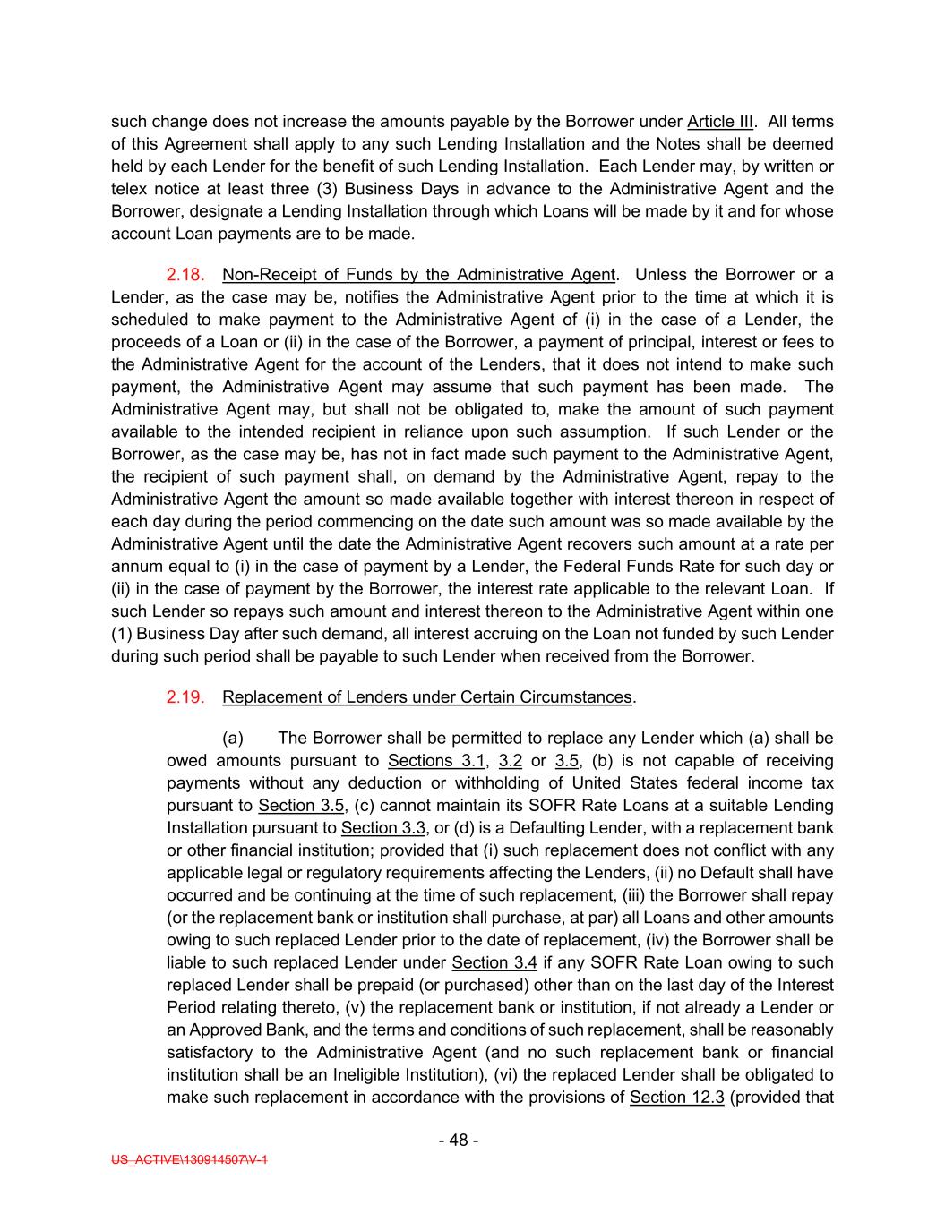 - 48 - US_ACTIVE\130914507\V-1 such change does not increase the amounts payable by the Borrower under Article III. All terms of this Agreement shall apply to any such Lending Installation and the Notes shall be deemed held by each Lender for the benefit of such Lending Installation. Each Lender may, by written or telex notice at least three (3) Business Days in advance to the Administrative Agent and the Borrower, designate a Lending Installation through which Loans will be made by it and for whose account Loan payments are to be made. Non-Receipt of Funds by the Administrative Agent. Unless the Borrower or a Lender, as the case may be, notifies the Administrative Agent prior to the time at which it is scheduled to make payment to the Administrative Agent of (i) in the case of a Lender, the proceeds of a Loan or (ii) in the case of the Borrower, a payment of principal, interest or fees to the Administrative Agent for the account of the Lenders, that it does not intend to make such payment, the Administrative Agent may assume that such payment has been made. The Administrative Agent may, but shall not be obligated to, make the amount of such payment available to the intended recipient in reliance upon such assumption. If such Lender or the Borrower, as the case may be, has not in fact made such payment to the Administrative Agent, the recipient of such payment shall, on demand by the Administrative Agent, repay to the Administrative Agent the amount so made available together with interest thereon in respect of each day during the period commencing on the date such amount was so made available by the Administrative Agent until the date the Administrative Agent recovers such amount at a rate per annum equal to (i) in the case of payment by a Lender, the Federal Funds Rate for such day or (ii) in the case of payment by the Borrower, the interest rate applicable to the relevant Loan. If such Lender so repays such amount and interest thereon to the Administrative Agent within one (1) Business Day after such demand, all interest accruing on the Loan not funded by such Lender during such period shall be payable to such Lender when received from the Borrower. Replacement of Lenders under Certain Circumstances. (a) The Borrower shall be permitted to replace any Lender which (a) shall be owed amounts pursuant to Sections 3.1, 3.2 or 3.5, (b) is not capable of receiving payments without any deduction or withholding of United States federal income tax pursuant to Section 3.5, (c) cannot maintain its SOFR Rate Loans at a suitable Lending Installation pursuant to Section 3.3, or (d) is a Defaulting Lender, with a replacement bank or other financial institution; provided that (i) such replacement does not conflict with any applicable legal or regulatory requirements affecting the Lenders, (ii) no Default shall have occurred and be continuing at the time of such replacement, (iii) the Borrower shall repay (or the replacement bank or institution shall purchase, at par) all Loans and other amounts owing to such replaced Lender prior to the date of replacement, (iv) the Borrower shall be liable to such replaced Lender under Section 3.4 if any SOFR Rate Loan owing to such replaced Lender shall be prepaid (or purchased) other than on the last day of the Interest Period relating thereto, (v) the replacement bank or institution, if not already a Lender or an Approved Bank, and the terms and conditions of such replacement, shall be reasonably satisfactory to the Administrative Agent (and no such replacement bank or financial institution shall be an Ineligible Institution), (vi) the replaced Lender shall be obligated to make such replacement in accordance with the provisions of Section 12.3 (provided that