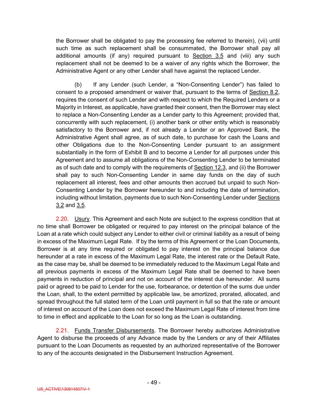 - 49 - US_ACTIVE\130914507\V-1 the Borrower shall be obligated to pay the processing fee referred to therein), (vii) until such time as such replacement shall be consummated, the Borrower shall pay all additional amounts (if any) required pursuant to Section 3.5 and (viii) any such replacement shall not be deemed to be a waiver of any rights which the Borrower, the Administrative Agent or any other Lender shall have against the replaced Lender. (b) If any Lender (such Lender, a “Non-Consenting Lender”) has failed to consent to a proposed amendment or waiver that, pursuant to the terms of Section 8.2, requires the consent of such Lender and with respect to which the Required Lenders or a Majority in Interest, as applicable, have granted their consent, then the Borrower may elect to replace a Non-Consenting Lender as a Lender party to this Agreement; provided that, concurrently with such replacement, (i) another bank or other entity which is reasonably satisfactory to the Borrower and, if not already a Lender or an Approved Bank, the Administrative Agent shall agree, as of such date, to purchase for cash the Loans and other Obligations due to the Non-Consenting Lender pursuant to an assignment substantially in the form of Exhibit B and to become a Lender for all purposes under this Agreement and to assume all obligations of the Non-Consenting Lender to be terminated as of such date and to comply with the requirements of Section 12.3, and (ii) the Borrower shall pay to such Non-Consenting Lender in same day funds on the day of such replacement all interest, fees and other amounts then accrued but unpaid to such Non- Consenting Lender by the Borrower hereunder to and including the date of termination, including without limitation, payments due to such Non-Consenting Lender under Sections 3.2 and 3.5. Usury. This Agreement and each Note are subject to the express condition that at no time shall Borrower be obligated or required to pay interest on the principal balance of the Loan at a rate which could subject any Lender to either civil or criminal liability as a result of being in excess of the Maximum Legal Rate. If by the terms of this Agreement or the Loan Documents, Borrower is at any time required or obligated to pay interest on the principal balance due hereunder at a rate in excess of the Maximum Legal Rate, the interest rate or the Default Rate, as the case may be, shall be deemed to be immediately reduced to the Maximum Legal Rate and all previous payments in excess of the Maximum Legal Rate shall be deemed to have been payments in reduction of principal and not on account of the interest due hereunder. All sums paid or agreed to be paid to Lender for the use, forbearance, or detention of the sums due under the Loan, shall, to the extent permitted by applicable law, be amortized, prorated, allocated, and spread throughout the full stated term of the Loan until payment in full so that the rate or amount of interest on account of the Loan does not exceed the Maximum Legal Rate of interest from time to time in effect and applicable to the Loan for so long as the Loan is outstanding. Funds Transfer Disbursements. The Borrower hereby authorizes Administrative Agent to disburse the proceeds of any Advance made by the Lenders or any of their Affiliates pursuant to the Loan Documents as requested by an authorized representative of the Borrower to any of the accounts designated in the Disbursement Instruction Agreement.