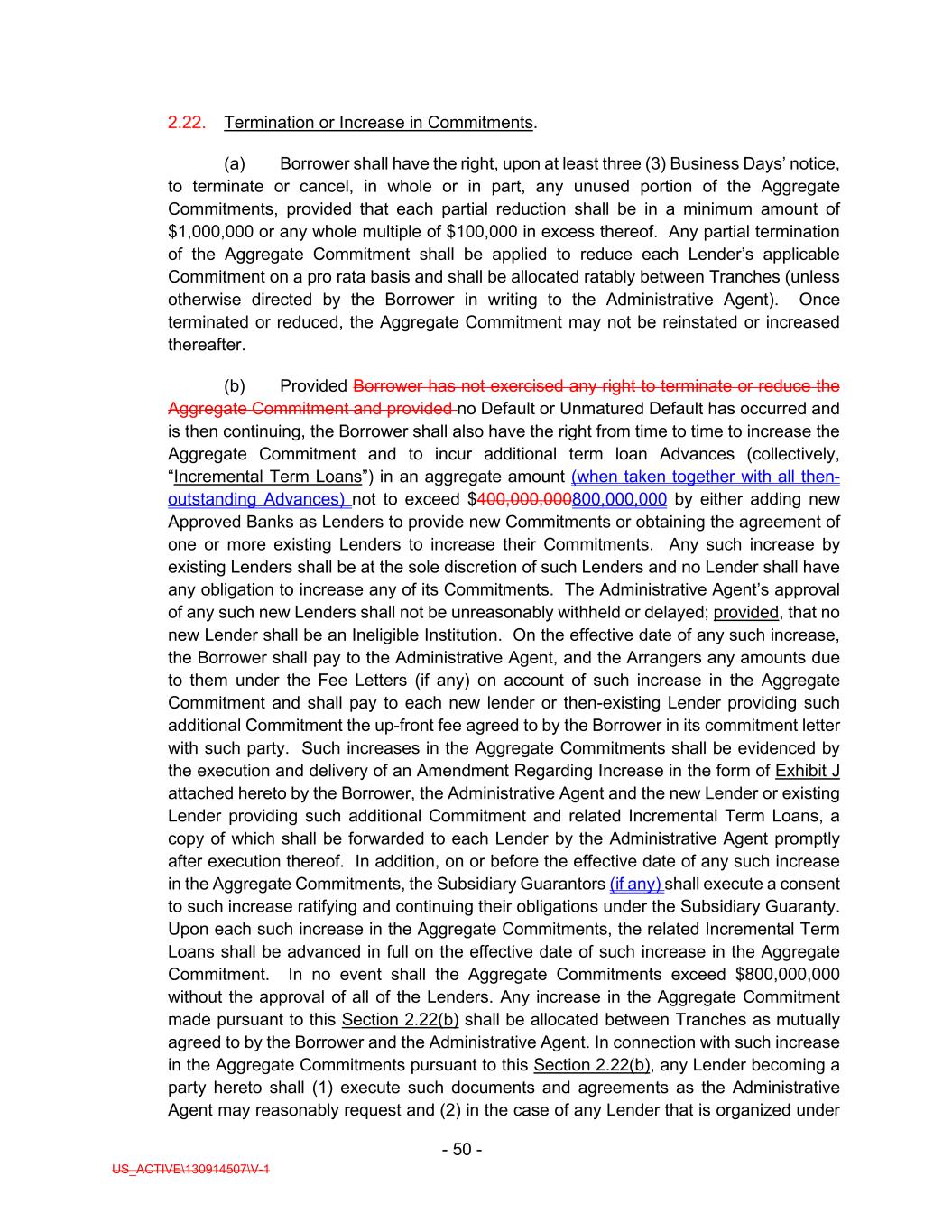 - 50 - US_ACTIVE\130914507\V-1 Termination or Increase in Commitments. (a) Borrower shall have the right, upon at least three (3) Business Days’ notice, to terminate or cancel, in whole or in part, any unused portion of the Aggregate Commitments, provided that each partial reduction shall be in a minimum amount of $1,000,000 or any whole multiple of $100,000 in excess thereof. Any partial termination of the Aggregate Commitment shall be applied to reduce each Lender’s applicable Commitment on a pro rata basis and shall be allocated ratably between Tranches (unless otherwise directed by the Borrower in writing to the Administrative Agent). Once terminated or reduced, the Aggregate Commitment may not be reinstated or increased thereafter. (b) Provided Borrower has not exercised any right to terminate or reduce the Aggregate Commitment and provided no Default or Unmatured Default has occurred and is then continuing, the Borrower shall also have the right from time to time to increase the Aggregate Commitment and to incur additional term loan Advances (collectively, “Incremental Term Loans”) in an aggregate amount (when taken together with all then- outstanding Advances) not to exceed $400,000,000800,000,000 by either adding new Approved Banks as Lenders to provide new Commitments or obtaining the agreement of one or more existing Lenders to increase their Commitments. Any such increase by existing Lenders shall be at the sole discretion of such Lenders and no Lender shall have any obligation to increase any of its Commitments. The Administrative Agent’s approval of any such new Lenders shall not be unreasonably withheld or delayed; provided, that no new Lender shall be an Ineligible Institution. On the effective date of any such increase, the Borrower shall pay to the Administrative Agent, and the Arrangers any amounts due to them under the Fee Letters (if any) on account of such increase in the Aggregate Commitment and shall pay to each new lender or then-existing Lender providing such additional Commitment the up-front fee agreed to by the Borrower in its commitment letter with such party. Such increases in the Aggregate Commitments shall be evidenced by the execution and delivery of an Amendment Regarding Increase in the form of Exhibit J attached hereto by the Borrower, the Administrative Agent and the new Lender or existing Lender providing such additional Commitment and related Incremental Term Loans, a copy of which shall be forwarded to each Lender by the Administrative Agent promptly after execution thereof. In addition, on or before the effective date of any such increase in the Aggregate Commitments, the Subsidiary Guarantors (if any) shall execute a consent to such increase ratifying and continuing their obligations under the Subsidiary Guaranty. Upon each such increase in the Aggregate Commitments, the related Incremental Term Loans shall be advanced in full on the effective date of such increase in the Aggregate Commitment. In no event shall the Aggregate Commitments exceed $800,000,000 without the approval of all of the Lenders. Any increase in the Aggregate Commitment made pursuant to this Section 2.22(b) shall be allocated between Tranches as mutually agreed to by the Borrower and the Administrative Agent. In connection with such increase in the Aggregate Commitments pursuant to this Section 2.22(b), any Lender becoming a party hereto shall (1) execute such documents and agreements as the Administrative Agent may reasonably request and (2) in the case of any Lender that is organized under