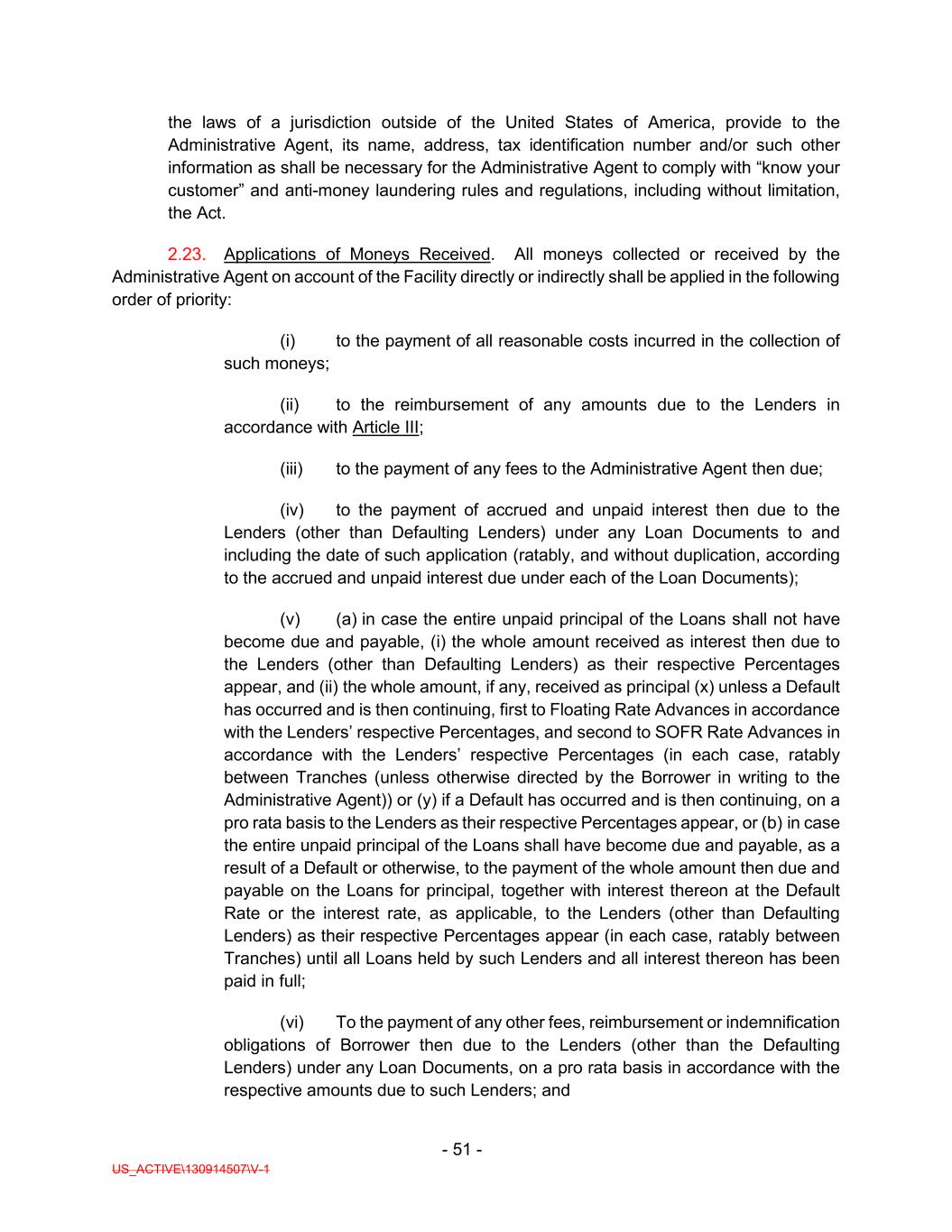 - 51 - US_ACTIVE\130914507\V-1 the laws of a jurisdiction outside of the United States of America, provide to the Administrative Agent, its name, address, tax identification number and/or such other information as shall be necessary for the Administrative Agent to comply with “know your customer” and anti-money laundering rules and regulations, including without limitation, the Act. Applications of Moneys Received. All moneys collected or received by the Administrative Agent on account of the Facility directly or indirectly shall be applied in the following order of priority: (i) to the payment of all reasonable costs incurred in the collection of such moneys; (ii) to the reimbursement of any amounts due to the Lenders in accordance with Article III; (iii) to the payment of any fees to the Administrative Agent then due; (iv) to the payment of accrued and unpaid interest then due to the Lenders (other than Defaulting Lenders) under any Loan Documents to and including the date of such application (ratably, and without duplication, according to the accrued and unpaid interest due under each of the Loan Documents); (v) (a) in case the entire unpaid principal of the Loans shall not have become due and payable, (i) the whole amount received as interest then due to the Lenders (other than Defaulting Lenders) as their respective Percentages appear, and (ii) the whole amount, if any, received as principal (x) unless a Default has occurred and is then continuing, first to Floating Rate Advances in accordance with the Lenders’ respective Percentages, and second to SOFR Rate Advances in accordance with the Lenders’ respective Percentages (in each case, ratably between Tranches (unless otherwise directed by the Borrower in writing to the Administrative Agent)) or (y) if a Default has occurred and is then continuing, on a pro rata basis to the Lenders as their respective Percentages appear, or (b) in case the entire unpaid principal of the Loans shall have become due and payable, as a result of a Default or otherwise, to the payment of the whole amount then due and payable on the Loans for principal, together with interest thereon at the Default Rate or the interest rate, as applicable, to the Lenders (other than Defaulting Lenders) as their respective Percentages appear (in each case, ratably between Tranches) until all Loans held by such Lenders and all interest thereon has been paid in full; (vi) To the payment of any other fees, reimbursement or indemnification obligations of Borrower then due to the Lenders (other than the Defaulting Lenders) under any Loan Documents, on a pro rata basis in accordance with the respective amounts due to such Lenders; and