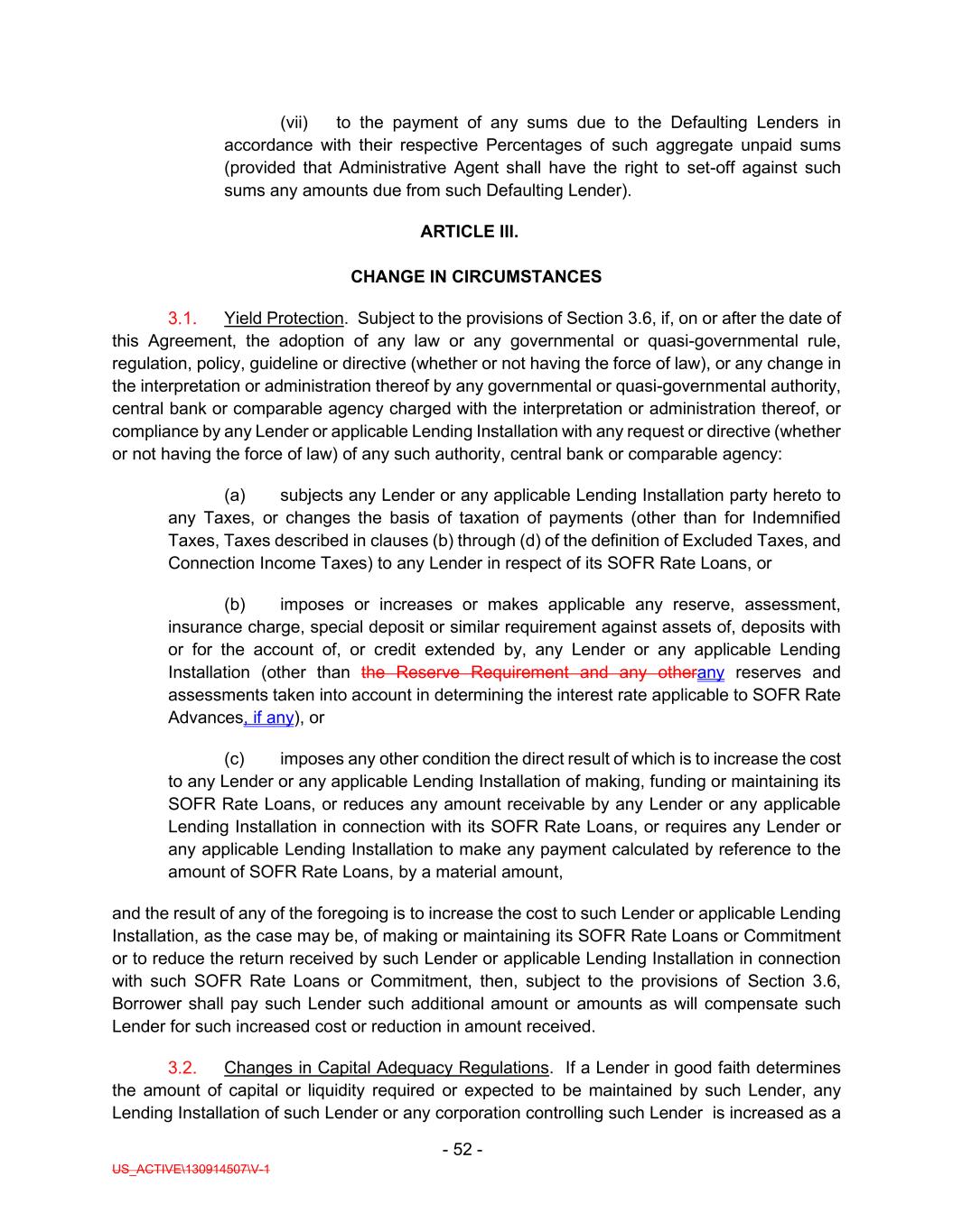- 52 - US_ACTIVE\130914507\V-1 (vii) to the payment of any sums due to the Defaulting Lenders in accordance with their respective Percentages of such aggregate unpaid sums (provided that Administrative Agent shall have the right to set-off against such sums any amounts due from such Defaulting Lender). ARTICLE III. CHANGE IN CIRCUMSTANCES Yield Protection. Subject to the provisions of Section 3.6, if, on or after the date of this Agreement, the adoption of any law or any governmental or quasi-governmental rule, regulation, policy, guideline or directive (whether or not having the force of law), or any change in the interpretation or administration thereof by any governmental or quasi-governmental authority, central bank or comparable agency charged with the interpretation or administration thereof, or compliance by any Lender or applicable Lending Installation with any request or directive (whether or not having the force of law) of any such authority, central bank or comparable agency: (a) subjects any Lender or any applicable Lending Installation party hereto to any Taxes, or changes the basis of taxation of payments (other than for Indemnified Taxes, Taxes described in clauses (b) through (d) of the definition of Excluded Taxes, and Connection Income Taxes) to any Lender in respect of its SOFR Rate Loans, or (b) imposes or increases or makes applicable any reserve, assessment, insurance charge, special deposit or similar requirement against assets of, deposits with or for the account of, or credit extended by, any Lender or any applicable Lending Installation (other than the Reserve Requirement and any otherany reserves and assessments taken into account in determining the interest rate applicable to SOFR Rate Advances, if any), or (c) imposes any other condition the direct result of which is to increase the cost to any Lender or any applicable Lending Installation of making, funding or maintaining its SOFR Rate Loans, or reduces any amount receivable by any Lender or any applicable Lending Installation in connection with its SOFR Rate Loans, or requires any Lender or any applicable Lending Installation to make any payment calculated by reference to the amount of SOFR Rate Loans, by a material amount, and the result of any of the foregoing is to increase the cost to such Lender or applicable Lending Installation, as the case may be, of making or maintaining its SOFR Rate Loans or Commitment or to reduce the return received by such Lender or applicable Lending Installation in connection with such SOFR Rate Loans or Commitment, then, subject to the provisions of Section 3.6, Borrower shall pay such Lender such additional amount or amounts as will compensate such Lender for such increased cost or reduction in amount received. Changes in Capital Adequacy Regulations. If a Lender in good faith determines the amount of capital or liquidity required or expected to be maintained by such Lender, any Lending Installation of such Lender or any corporation controlling such Lender is increased as a