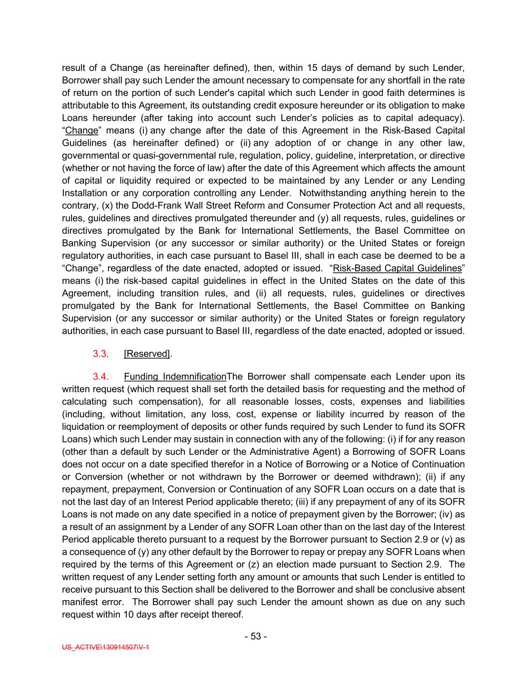 - 53 - US_ACTIVE\130914507\V-1 result of a Change (as hereinafter defined), then, within 15 days of demand by such Lender, Borrower shall pay such Lender the amount necessary to compensate for any shortfall in the rate of return on the portion of such Lender's capital which such Lender in good faith determines is attributable to this Agreement, its outstanding credit exposure hereunder or its obligation to make Loans hereunder (after taking into account such Lender’s policies as to capital adequacy). “Change” means (i) any change after the date of this Agreement in the Risk-Based Capital Guidelines (as hereinafter defined) or (ii) any adoption of or change in any other law, governmental or quasi-governmental rule, regulation, policy, guideline, interpretation, or directive (whether or not having the force of law) after the date of this Agreement which affects the amount of capital or liquidity required or expected to be maintained by any Lender or any Lending Installation or any corporation controlling any Lender. Notwithstanding anything herein to the contrary, (x) the Dodd-Frank Wall Street Reform and Consumer Protection Act and all requests, rules, guidelines and directives promulgated thereunder and (y) all requests, rules, guidelines or directives promulgated by the Bank for International Settlements, the Basel Committee on Banking Supervision (or any successor or similar authority) or the United States or foreign regulatory authorities, in each case pursuant to Basel III, shall in each case be deemed to be a “Change”, regardless of the date enacted, adopted or issued. “Risk-Based Capital Guidelines” means (i) the risk-based capital guidelines in effect in the United States on the date of this Agreement, including transition rules, and (ii) all requests, rules, guidelines or directives promulgated by the Bank for International Settlements, the Basel Committee on Banking Supervision (or any successor or similar authority) or the United States or foreign regulatory authorities, in each case pursuant to Basel III, regardless of the date enacted, adopted or issued. [Reserved]. Funding IndemnificationThe Borrower shall compensate each Lender upon its written request (which request shall set forth the detailed basis for requesting and the method of calculating such compensation), for all reasonable losses, costs, expenses and liabilities (including, without limitation, any loss, cost, expense or liability incurred by reason of the liquidation or reemployment of deposits or other funds required by such Lender to fund its SOFR Loans) which such Lender may sustain in connection with any of the following: (i) if for any reason (other than a default by such Lender or the Administrative Agent) a Borrowing of SOFR Loans does not occur on a date specified therefor in a Notice of Borrowing or a Notice of Continuation or Conversion (whether or not withdrawn by the Borrower or deemed withdrawn); (ii) if any repayment, prepayment, Conversion or Continuation of any SOFR Loan occurs on a date that is not the last day of an Interest Period applicable thereto; (iii) if any prepayment of any of its SOFR Loans is not made on any date specified in a notice of prepayment given by the Borrower; (iv) as a result of an assignment by a Lender of any SOFR Loan other than on the last day of the Interest Period applicable thereto pursuant to a request by the Borrower pursuant to Section 2.9 or (v) as a consequence of (y) any other default by the Borrower to repay or prepay any SOFR Loans when required by the terms of this Agreement or (z) an election made pursuant to Section 2.9. The written request of any Lender setting forth any amount or amounts that such Lender is entitled to receive pursuant to this Section shall be delivered to the Borrower and shall be conclusive absent manifest error. The Borrower shall pay such Lender the amount shown as due on any such request within 10 days after receipt thereof.