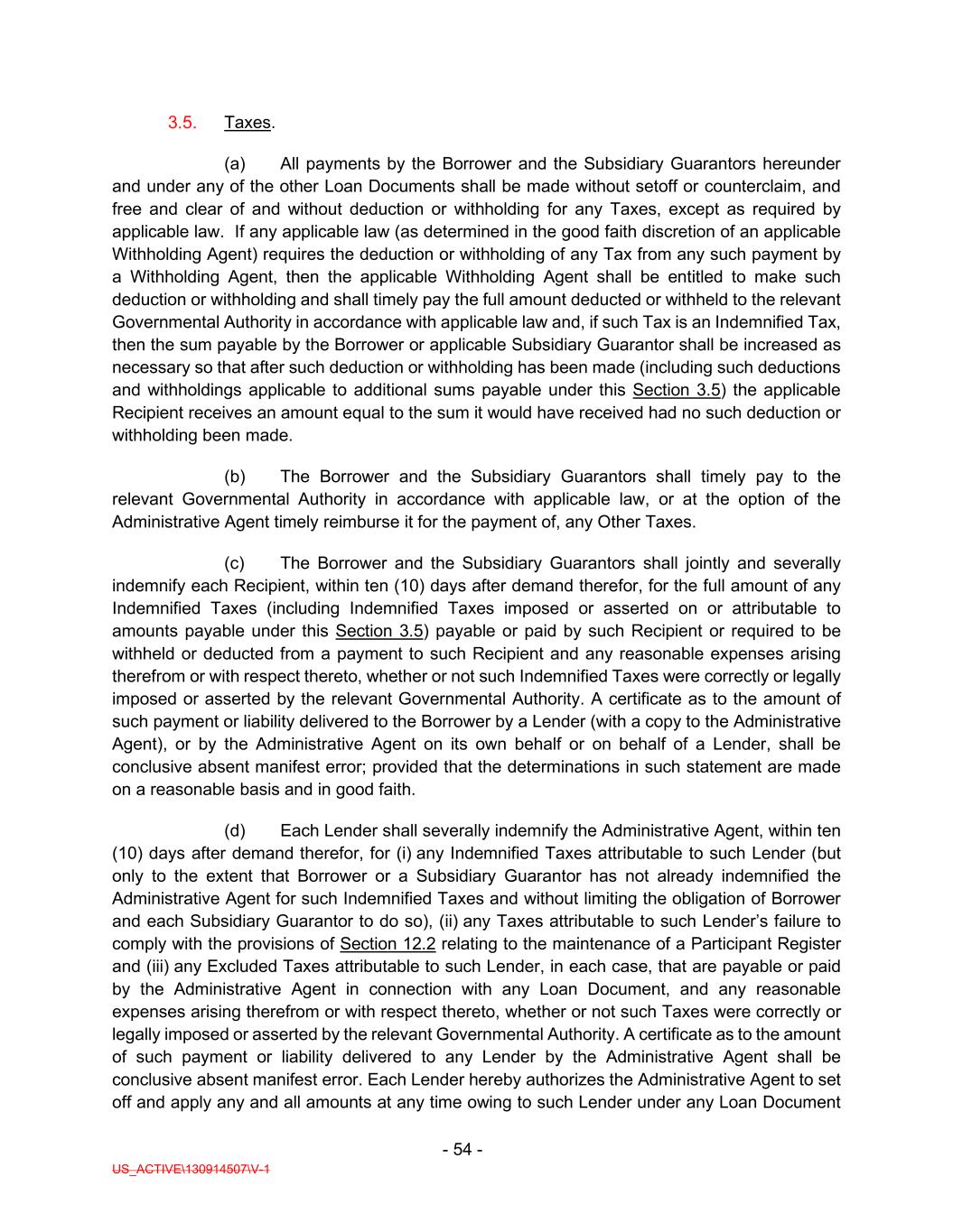 - 54 - US_ACTIVE\130914507\V-1 Taxes. (a) All payments by the Borrower and the Subsidiary Guarantors hereunder and under any of the other Loan Documents shall be made without setoff or counterclaim, and free and clear of and without deduction or withholding for any Taxes, except as required by applicable law. If any applicable law (as determined in the good faith discretion of an applicable Withholding Agent) requires the deduction or withholding of any Tax from any such payment by a Withholding Agent, then the applicable Withholding Agent shall be entitled to make such deduction or withholding and shall timely pay the full amount deducted or withheld to the relevant Governmental Authority in accordance with applicable law and, if such Tax is an Indemnified Tax, then the sum payable by the Borrower or applicable Subsidiary Guarantor shall be increased as necessary so that after such deduction or withholding has been made (including such deductions and withholdings applicable to additional sums payable under this Section 3.5) the applicable Recipient receives an amount equal to the sum it would have received had no such deduction or withholding been made. (b) The Borrower and the Subsidiary Guarantors shall timely pay to the relevant Governmental Authority in accordance with applicable law, or at the option of the Administrative Agent timely reimburse it for the payment of, any Other Taxes. (c) The Borrower and the Subsidiary Guarantors shall jointly and severally indemnify each Recipient, within ten (10) days after demand therefor, for the full amount of any Indemnified Taxes (including Indemnified Taxes imposed or asserted on or attributable to amounts payable under this Section 3.5) payable or paid by such Recipient or required to be withheld or deducted from a payment to such Recipient and any reasonable expenses arising therefrom or with respect thereto, whether or not such Indemnified Taxes were correctly or legally imposed or asserted by the relevant Governmental Authority. A certificate as to the amount of such payment or liability delivered to the Borrower by a Lender (with a copy to the Administrative Agent), or by the Administrative Agent on its own behalf or on behalf of a Lender, shall be conclusive absent manifest error; provided that the determinations in such statement are made on a reasonable basis and in good faith. (d) Each Lender shall severally indemnify the Administrative Agent, within ten (10) days after demand therefor, for (i) any Indemnified Taxes attributable to such Lender (but only to the extent that Borrower or a Subsidiary Guarantor has not already indemnified the Administrative Agent for such Indemnified Taxes and without limiting the obligation of Borrower and each Subsidiary Guarantor to do so), (ii) any Taxes attributable to such Lender’s failure to comply with the provisions of Section 12.2 relating to the maintenance of a Participant Register and (iii) any Excluded Taxes attributable to such Lender, in each case, that are payable or paid by the Administrative Agent in connection with any Loan Document, and any reasonable expenses arising therefrom or with respect thereto, whether or not such Taxes were correctly or legally imposed or asserted by the relevant Governmental Authority. A certificate as to the amount of such payment or liability delivered to any Lender by the Administrative Agent shall be conclusive absent manifest error. Each Lender hereby authorizes the Administrative Agent to set off and apply any and all amounts at any time owing to such Lender under any Loan Document