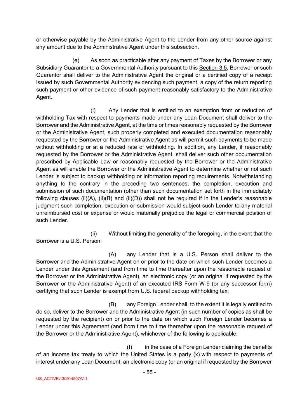 - 55 - US_ACTIVE\130914507\V-1 or otherwise payable by the Administrative Agent to the Lender from any other source against any amount due to the Administrative Agent under this subsection. (e) As soon as practicable after any payment of Taxes by the Borrower or any Subsidiary Guarantor to a Governmental Authority pursuant to this Section 3.5, Borrower or such Guarantor shall deliver to the Administrative Agent the original or a certified copy of a receipt issued by such Governmental Authority evidencing such payment, a copy of the return reporting such payment or other evidence of such payment reasonably satisfactory to the Administrative Agent. (i) Any Lender that is entitled to an exemption from or reduction of withholding Tax with respect to payments made under any Loan Document shall deliver to the Borrower and the Administrative Agent, at the time or times reasonably requested by the Borrower or the Administrative Agent, such properly completed and executed documentation reasonably requested by the Borrower or the Administrative Agent as will permit such payments to be made without withholding or at a reduced rate of withholding. In addition, any Lender, if reasonably requested by the Borrower or the Administrative Agent, shall deliver such other documentation prescribed by Applicable Law or reasonably requested by the Borrower or the Administrative Agent as will enable the Borrower or the Administrative Agent to determine whether or not such Lender is subject to backup withholding or information reporting requirements. Notwithstanding anything to the contrary in the preceding two sentences, the completion, execution and submission of such documentation (other than such documentation set forth in the immediately following clauses (ii)(A), (ii)(B) and (ii)(D)) shall not be required if in the Lender’s reasonable judgment such completion, execution or submission would subject such Lender to any material unreimbursed cost or expense or would materially prejudice the legal or commercial position of such Lender. (ii) Without limiting the generality of the foregoing, in the event that the Borrower is a U.S. Person: (A) any Lender that is a U.S. Person shall deliver to the Borrower and the Administrative Agent on or prior to the date on which such Lender becomes a Lender under this Agreement (and from time to time thereafter upon the reasonable request of the Borrower or the Administrative Agent), an electronic copy (or an original if requested by the Borrower or the Administrative Agent) of an executed IRS Form W-9 (or any successor form) certifying that such Lender is exempt from U.S. federal backup withholding tax; (B) any Foreign Lender shall, to the extent it is legally entitled to do so, deliver to the Borrower and the Administrative Agent (in such number of copies as shall be requested by the recipient) on or prior to the date on which such Foreign Lender becomes a Lender under this Agreement (and from time to time thereafter upon the reasonable request of the Borrower or the Administrative Agent), whichever of the following is applicable: (I) in the case of a Foreign Lender claiming the benefits of an income tax treaty to which the United States is a party (x) with respect to payments of interest under any Loan Document, an electronic copy (or an original if requested by the Borrower