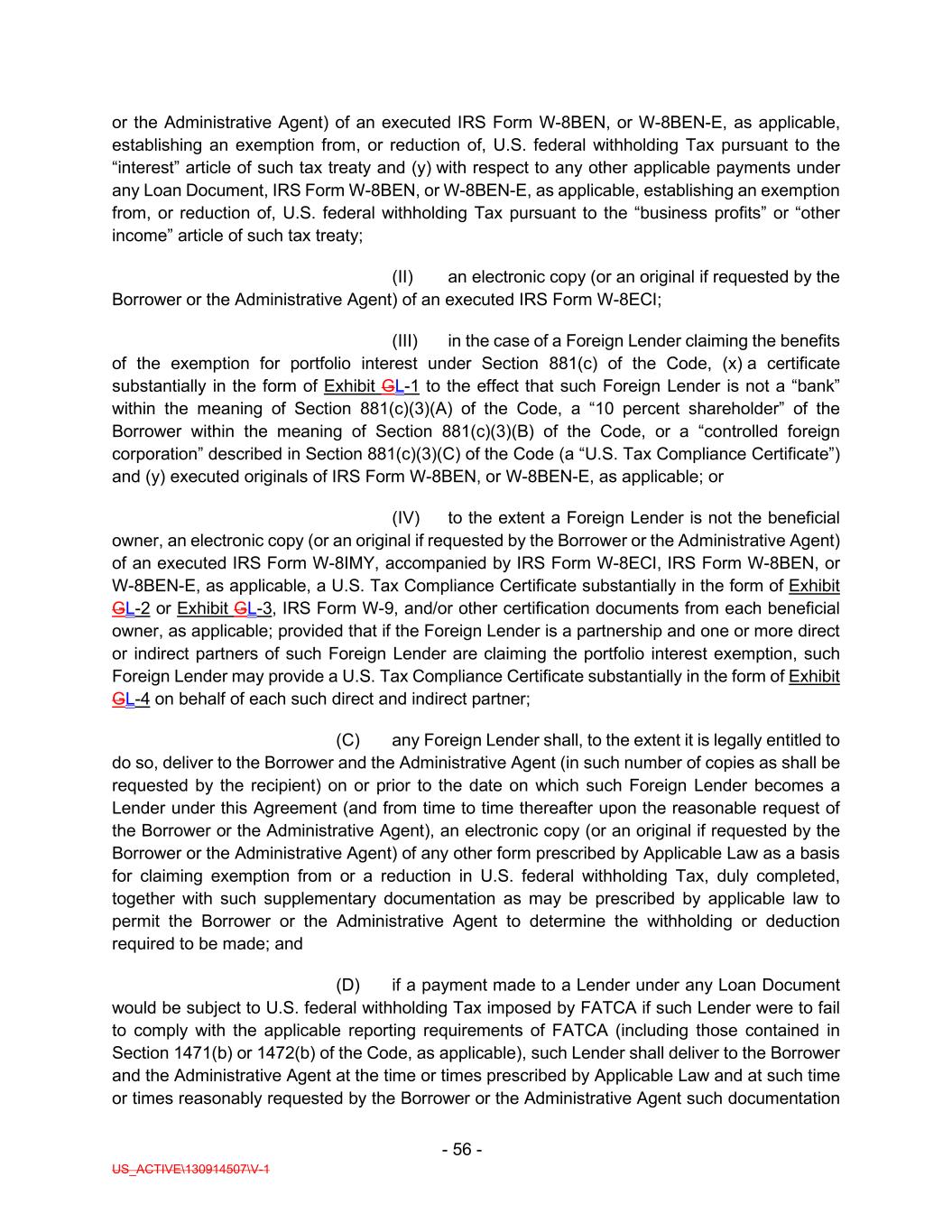 - 56 - US_ACTIVE\130914507\V-1 or the Administrative Agent) of an executed IRS Form W-8BEN, or W-8BEN-E, as applicable, establishing an exemption from, or reduction of, U.S. federal withholding Tax pursuant to the “interest” article of such tax treaty and (y) with respect to any other applicable payments under any Loan Document, IRS Form W-8BEN, or W-8BEN-E, as applicable, establishing an exemption from, or reduction of, U.S. federal withholding Tax pursuant to the “business profits” or “other income” article of such tax treaty; (II) an electronic copy (or an original if requested by the Borrower or the Administrative Agent) of an executed IRS Form W-8ECI; (III) in the case of a Foreign Lender claiming the benefits of the exemption for portfolio interest under Section 881(c) of the Code, (x) a certificate substantially in the form of Exhibit GL-1 to the effect that such Foreign Lender is not a “bank” within the meaning of Section 881(c)(3)(A) of the Code, a “10 percent shareholder” of the Borrower within the meaning of Section 881(c)(3)(B) of the Code, or a “controlled foreign corporation” described in Section 881(c)(3)(C) of the Code (a “U.S. Tax Compliance Certificate”) and (y) executed originals of IRS Form W-8BEN, or W-8BEN-E, as applicable; or (IV) to the extent a Foreign Lender is not the beneficial owner, an electronic copy (or an original if requested by the Borrower or the Administrative Agent) of an executed IRS Form W-8IMY, accompanied by IRS Form W-8ECI, IRS Form W-8BEN, or W-8BEN-E, as applicable, a U.S. Tax Compliance Certificate substantially in the form of Exhibit GL-2 or Exhibit GL-3, IRS Form W-9, and/or other certification documents from each beneficial owner, as applicable; provided that if the Foreign Lender is a partnership and one or more direct or indirect partners of such Foreign Lender are claiming the portfolio interest exemption, such Foreign Lender may provide a U.S. Tax Compliance Certificate substantially in the form of Exhibit GL-4 on behalf of each such direct and indirect partner; (C) any Foreign Lender shall, to the extent it is legally entitled to do so, deliver to the Borrower and the Administrative Agent (in such number of copies as shall be requested by the recipient) on or prior to the date on which such Foreign Lender becomes a Lender under this Agreement (and from time to time thereafter upon the reasonable request of the Borrower or the Administrative Agent), an electronic copy (or an original if requested by the Borrower or the Administrative Agent) of any other form prescribed by Applicable Law as a basis for claiming exemption from or a reduction in U.S. federal withholding Tax, duly completed, together with such supplementary documentation as may be prescribed by applicable law to permit the Borrower or the Administrative Agent to determine the withholding or deduction required to be made; and (D) if a payment made to a Lender under any Loan Document would be subject to U.S. federal withholding Tax imposed by FATCA if such Lender were to fail to comply with the applicable reporting requirements of FATCA (including those contained in Section 1471(b) or 1472(b) of the Code, as applicable), such Lender shall deliver to the Borrower and the Administrative Agent at the time or times prescribed by Applicable Law and at such time or times reasonably requested by the Borrower or the Administrative Agent such documentation