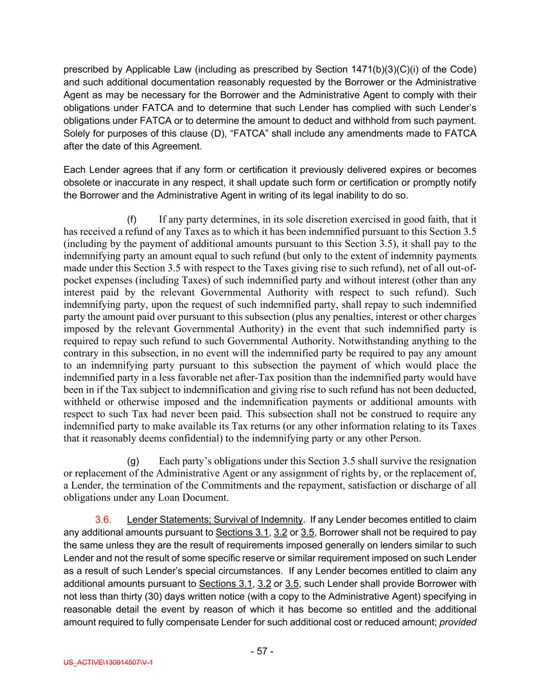 - 57 - US_ACTIVE\130914507\V-1 prescribed by Applicable Law (including as prescribed by Section 1471(b)(3)(C)(i) of the Code) and such additional documentation reasonably requested by the Borrower or the Administrative Agent as may be necessary for the Borrower and the Administrative Agent to comply with their obligations under FATCA and to determine that such Lender has complied with such Lender’s obligations under FATCA or to determine the amount to deduct and withhold from such payment. Solely for purposes of this clause (D), “FATCA” shall include any amendments made to FATCA after the date of this Agreement. Each Lender agrees that if any form or certification it previously delivered expires or becomes obsolete or inaccurate in any respect, it shall update such form or certification or promptly notify the Borrower and the Administrative Agent in writing of its legal inability to do so. (f) If any party determines, in its sole discretion exercised in good faith, that it has received a refund of any Taxes as to which it has been indemnified pursuant to this Section 3.5 (including by the payment of additional amounts pursuant to this Section 3.5), it shall pay to the indemnifying party an amount equal to such refund (but only to the extent of indemnity payments made under this Section 3.5 with respect to the Taxes giving rise to such refund), net of all out-of- pocket expenses (including Taxes) of such indemnified party and without interest (other than any interest paid by the relevant Governmental Authority with respect to such refund). Such indemnifying party, upon the request of such indemnified party, shall repay to such indemnified party the amount paid over pursuant to this subsection (plus any penalties, interest or other charges imposed by the relevant Governmental Authority) in the event that such indemnified party is required to repay such refund to such Governmental Authority. Notwithstanding anything to the contrary in this subsection, in no event will the indemnified party be required to pay any amount to an indemnifying party pursuant to this subsection the payment of which would place the indemnified party in a less favorable net after-Tax position than the indemnified party would have been in if the Tax subject to indemnification and giving rise to such refund has not been deducted, withheld or otherwise imposed and the indemnification payments or additional amounts with respect to such Tax had never been paid. This subsection shall not be construed to require any indemnified party to make available its Tax returns (or any other information relating to its Taxes that it reasonably deems confidential) to the indemnifying party or any other Person. (g) Each party’s obligations under this Section 3.5 shall survive the resignation or replacement of the Administrative Agent or any assignment of rights by, or the replacement of, a Lender, the termination of the Commitments and the repayment, satisfaction or discharge of all obligations under any Loan Document. Lender Statements; Survival of Indemnity. If any Lender becomes entitled to claim any additional amounts pursuant to Sections 3.1, 3.2 or 3.5, Borrower shall not be required to pay the same unless they are the result of requirements imposed generally on lenders similar to such Lender and not the result of some specific reserve or similar requirement imposed on such Lender as a result of such Lender’s special circumstances. If any Lender becomes entitled to claim any additional amounts pursuant to Sections 3.1, 3.2 or 3.5, such Lender shall provide Borrower with not less than thirty (30) days written notice (with a copy to the Administrative Agent) specifying in reasonable detail the event by reason of which it has become so entitled and the additional amount required to fully compensate Lender for such additional cost or reduced amount; provided