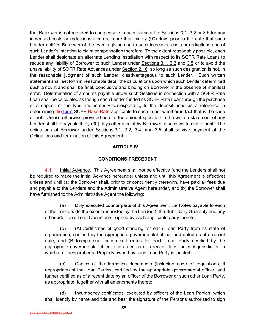 - 58 - US_ACTIVE\130914507\V-1 that Borrower is not required to compensate Lender pursuant to Sections 3.1, 3.2 or 3.5 for any increased costs or reductions incurred more than ninety (90) days prior to the date that such Lender notifies Borrower of the events giving rise to such increased costs or reductions and of such Lender’s intention to claim compensation therefore. To the extent reasonably possible, each Lender shall designate an alternate Lending Installation with respect to its SOFR Rate Loans to reduce any liability of Borrower to such Lender under Sections 3.1, 3.2 and 3.5 or to avoid the unavailability of SOFR Rate Advances under Section 2.16, so long as such designation is not, in the reasonable judgment of such Lender, disadvantageous to such Lender. Such written statement shall set forth in reasonable detail the calculations upon which such Lender determined such amount and shall be final, conclusive and binding on Borrower in the absence of manifest error. Determination of amounts payable under such Sections in connection with a SOFR Rate Loan shall be calculated as though each Lender funded its SOFR Rate Loan through the purchase of a deposit of the type and maturity corresponding to the deposit used as a reference in determining theTerm SOFR Base Rate applicable to such Loan, whether in fact that is the case or not. Unless otherwise provided herein, the amount specified in the written statement of any Lender shall be payable thirty (30) days after receipt by Borrower of such written statement. The obligations of Borrower under Sections 3.1, 3.2, 3.4, and 3.5 shall survive payment of the Obligations and termination of this Agreement. ARTICLE IV. CONDITIONS PRECEDENT Initial Advance. This Agreement shall not be effective (and the Lenders shall not be required to make the initial Advance hereunder unless and until this Agreement is effective) unless and until (a) the Borrower shall, prior to or concurrently therewith, have paid all fees due and payable to the Lenders and the Administrative Agent hereunder, and (b) the Borrower shall have furnished to the Administrative Agent the following: (a) Duly executed counterparts of this Agreement, the Notes payable to each of the Lenders (to the extent requested by the Lenders), the Subsidiary Guaranty and any other additional Loan Documents, signed by each applicable party thereto; (b) (A) Certificates of good standing for each Loan Party from its state of organization, certified by the appropriate governmental officer and dated as of a recent date, and (B) foreign qualification certificates for each Loan Party certified by the appropriate governmental officer and dated as of a recent date, for each jurisdiction in which an Unencumbered Property owned by such Loan Party is located; (c) Copies of the formation documents (including code of regulations, if appropriate) of the Loan Parties, certified by the appropriate governmental officer, and further certified as of a recent date by an officer of the Borrower or such other Loan Party, as appropriate, together with all amendments thereto; (d) Incumbency certificates, executed by officers of the Loan Parties, which shall identify by name and title and bear the signature of the Persons authorized to sign