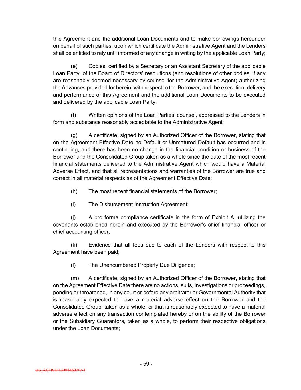 - 59 - US_ACTIVE\130914507\V-1 this Agreement and the additional Loan Documents and to make borrowings hereunder on behalf of such parties, upon which certificate the Administrative Agent and the Lenders shall be entitled to rely until informed of any change in writing by the applicable Loan Party; (e) Copies, certified by a Secretary or an Assistant Secretary of the applicable Loan Party, of the Board of Directors’ resolutions (and resolutions of other bodies, if any are reasonably deemed necessary by counsel for the Administrative Agent) authorizing the Advances provided for herein, with respect to the Borrower, and the execution, delivery and performance of this Agreement and the additional Loan Documents to be executed and delivered by the applicable Loan Party; (f) Written opinions of the Loan Parties’ counsel, addressed to the Lenders in form and substance reasonably acceptable to the Administrative Agent; (g) A certificate, signed by an Authorized Officer of the Borrower, stating that on the Agreement Effective Date no Default or Unmatured Default has occurred and is continuing, and there has been no change in the financial condition or business of the Borrower and the Consolidated Group taken as a whole since the date of the most recent financial statements delivered to the Administrative Agent which would have a Material Adverse Effect, and that all representations and warranties of the Borrower are true and correct in all material respects as of the Agreement Effective Date; (h) The most recent financial statements of the Borrower; (i) The Disbursement Instruction Agreement; (j) A pro forma compliance certificate in the form of Exhibit A, utilizing the covenants established herein and executed by the Borrower’s chief financial officer or chief accounting officer; (k) Evidence that all fees due to each of the Lenders with respect to this Agreement have been paid; (l) The Unencumbered Property Due Diligence; (m) A certificate, signed by an Authorized Officer of the Borrower, stating that on the Agreement Effective Date there are no actions, suits, investigations or proceedings, pending or threatened, in any court or before any arbitrator or Governmental Authority that is reasonably expected to have a material adverse effect on the Borrower and the Consolidated Group, taken as a whole, or that is reasonably expected to have a material adverse effect on any transaction contemplated hereby or on the ability of the Borrower or the Subsidiary Guarantors, taken as a whole, to perform their respective obligations under the Loan Documents;