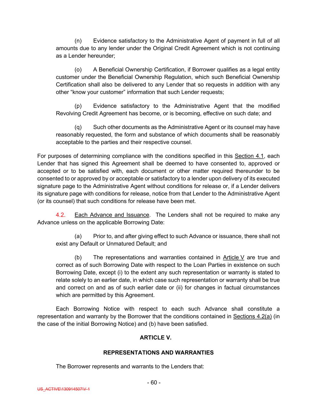 - 60 - US_ACTIVE\130914507\V-1 (n) Evidence satisfactory to the Administrative Agent of payment in full of all amounts due to any lender under the Original Credit Agreement which is not continuing as a Lender hereunder; (o) A Beneficial Ownership Certification, if Borrower qualifies as a legal entity customer under the Beneficial Ownership Regulation, which such Beneficial Ownership Certification shall also be delivered to any Lender that so requests in addition with any other “know your customer” information that such Lender requests; (p) Evidence satisfactory to the Administrative Agent that the modified Revolving Credit Agreement has become, or is becoming, effective on such date; and (q) Such other documents as the Administrative Agent or its counsel may have reasonably requested, the form and substance of which documents shall be reasonably acceptable to the parties and their respective counsel. For purposes of determining compliance with the conditions specified in this Section 4.1, each Lender that has signed this Agreement shall be deemed to have consented to, approved or accepted or to be satisfied with, each document or other matter required thereunder to be consented to or approved by or acceptable or satisfactory to a lender upon delivery of its executed signature page to the Administrative Agent without conditions for release or, if a Lender delivers its signature page with conditions for release, notice from that Lender to the Administrative Agent (or its counsel) that such conditions for release have been met. Each Advance and Issuance. The Lenders shall not be required to make any Advance unless on the applicable Borrowing Date: (a) Prior to, and after giving effect to such Advance or issuance, there shall not exist any Default or Unmatured Default; and (b) The representations and warranties contained in Article V are true and correct as of such Borrowing Date with respect to the Loan Parties in existence on such Borrowing Date, except (i) to the extent any such representation or warranty is stated to relate solely to an earlier date, in which case such representation or warranty shall be true and correct on and as of such earlier date or (ii) for changes in factual circumstances which are permitted by this Agreement. Each Borrowing Notice with respect to each such Advance shall constitute a representation and warranty by the Borrower that the conditions contained in Sections 4.2(a) (in the case of the initial Borrowing Notice) and (b) have been satisfied. ARTICLE V. REPRESENTATIONS AND WARRANTIES The Borrower represents and warrants to the Lenders that: