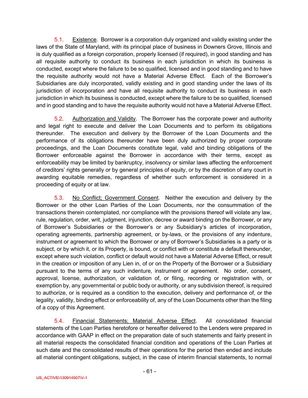 - 61 - US_ACTIVE\130914507\V-1 Existence. Borrower is a corporation duly organized and validly existing under the laws of the State of Maryland, with its principal place of business in Downers Grove, Illinois and is duly qualified as a foreign corporation, properly licensed (if required), in good standing and has all requisite authority to conduct its business in each jurisdiction in which its business is conducted, except where the failure to be so qualified, licensed and in good standing and to have the requisite authority would not have a Material Adverse Effect. Each of the Borrower’s Subsidiaries are duly incorporated, validly existing and in good standing under the laws of its jurisdiction of incorporation and have all requisite authority to conduct its business in each jurisdiction in which its business is conducted, except where the failure to be so qualified, licensed and in good standing and to have the requisite authority would not have a Material Adverse Effect. Authorization and Validity. The Borrower has the corporate power and authority and legal right to execute and deliver the Loan Documents and to perform its obligations thereunder. The execution and delivery by the Borrower of the Loan Documents and the performance of its obligations thereunder have been duly authorized by proper corporate proceedings, and the Loan Documents constitute legal, valid and binding obligations of the Borrower enforceable against the Borrower in accordance with their terms, except as enforceability may be limited by bankruptcy, insolvency or similar laws affecting the enforcement of creditors’ rights generally or by general principles of equity, or by the discretion of any court in awarding equitable remedies, regardless of whether such enforcement is considered in a proceeding of equity or at law. No Conflict; Government Consent. Neither the execution and delivery by the Borrower or the other Loan Parties of the Loan Documents, nor the consummation of the transactions therein contemplated, nor compliance with the provisions thereof will violate any law, rule, regulation, order, writ, judgment, injunction, decree or award binding on the Borrower, or any of Borrower’s Subsidiaries or the Borrower’s or any Subsidiary’s articles of incorporation, operating agreements, partnership agreement, or by-laws, or the provisions of any indenture, instrument or agreement to which the Borrower or any of Borrower’s Subsidiaries is a party or is subject, or by which it, or its Property, is bound, or conflict with or constitute a default thereunder, except where such violation, conflict or default would not have a Material Adverse Effect, or result in the creation or imposition of any Lien in, of or on the Property of the Borrower or a Subsidiary pursuant to the terms of any such indenture, instrument or agreement. No order, consent, approval, license, authorization, or validation of, or filing, recording or registration with, or exemption by, any governmental or public body or authority, or any subdivision thereof, is required to authorize, or is required as a condition to the execution, delivery and performance of, or the legality, validity, binding effect or enforceability of, any of the Loan Documents other than the filing of a copy of this Agreement. Financial Statements; Material Adverse Effect. All consolidated financial statements of the Loan Parties heretofore or hereafter delivered to the Lenders were prepared in accordance with GAAP in effect on the preparation date of such statements and fairly present in all material respects the consolidated financial condition and operations of the Loan Parties at such date and the consolidated results of their operations for the period then ended and include all material contingent obligations, subject, in the case of interim financial statements, to normal