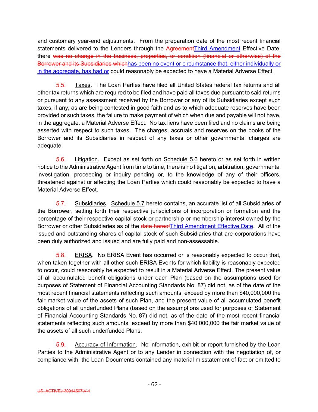 - 62 - US_ACTIVE\130914507\V-1 and customary year-end adjustments. From the preparation date of the most recent financial statements delivered to the Lenders through the AgreementThird Amendment Effective Date, there was no change in the business, properties, or condition (financial or otherwise) of the Borrower and its Subsidiaries whichhas been no event or circumstance that, either individually or in the aggregate, has had or could reasonably be expected to have a Material Adverse Effect. Taxes. The Loan Parties have filed all United States federal tax returns and all other tax returns which are required to be filed and have paid all taxes due pursuant to said returns or pursuant to any assessment received by the Borrower or any of its Subsidiaries except such taxes, if any, as are being contested in good faith and as to which adequate reserves have been provided or such taxes, the failure to make payment of which when due and payable will not have, in the aggregate, a Material Adverse Effect. No tax liens have been filed and no claims are being asserted with respect to such taxes. The charges, accruals and reserves on the books of the Borrower and its Subsidiaries in respect of any taxes or other governmental charges are adequate. Litigation. Except as set forth on Schedule 5.6 hereto or as set forth in written notice to the Administrative Agent from time to time, there is no litigation, arbitration, governmental investigation, proceeding or inquiry pending or, to the knowledge of any of their officers, threatened against or affecting the Loan Parties which could reasonably be expected to have a Material Adverse Effect. Subsidiaries. Schedule 5.7 hereto contains, an accurate list of all Subsidiaries of the Borrower, setting forth their respective jurisdictions of incorporation or formation and the percentage of their respective capital stock or partnership or membership interest owned by the Borrower or other Subsidiaries as of the date hereofThird Amendment Effective Date. All of the issued and outstanding shares of capital stock of such Subsidiaries that are corporations have been duly authorized and issued and are fully paid and non-assessable. ERISA. No ERISA Event has occurred or is reasonably expected to occur that, when taken together with all other such ERISA Events for which liability is reasonably expected to occur, could reasonably be expected to result in a Material Adverse Effect. The present value of all accumulated benefit obligations under each Plan (based on the assumptions used for purposes of Statement of Financial Accounting Standards No. 87) did not, as of the date of the most recent financial statements reflecting such amounts, exceed by more than $40,000,000 the fair market value of the assets of such Plan, and the present value of all accumulated benefit obligations of all underfunded Plans (based on the assumptions used for purposes of Statement of Financial Accounting Standards No. 87) did not, as of the date of the most recent financial statements reflecting such amounts, exceed by more than $40,000,000 the fair market value of the assets of all such underfunded Plans. Accuracy of Information. No information, exhibit or report furnished by the Loan Parties to the Administrative Agent or to any Lender in connection with the negotiation of, or compliance with, the Loan Documents contained any material misstatement of fact or omitted to