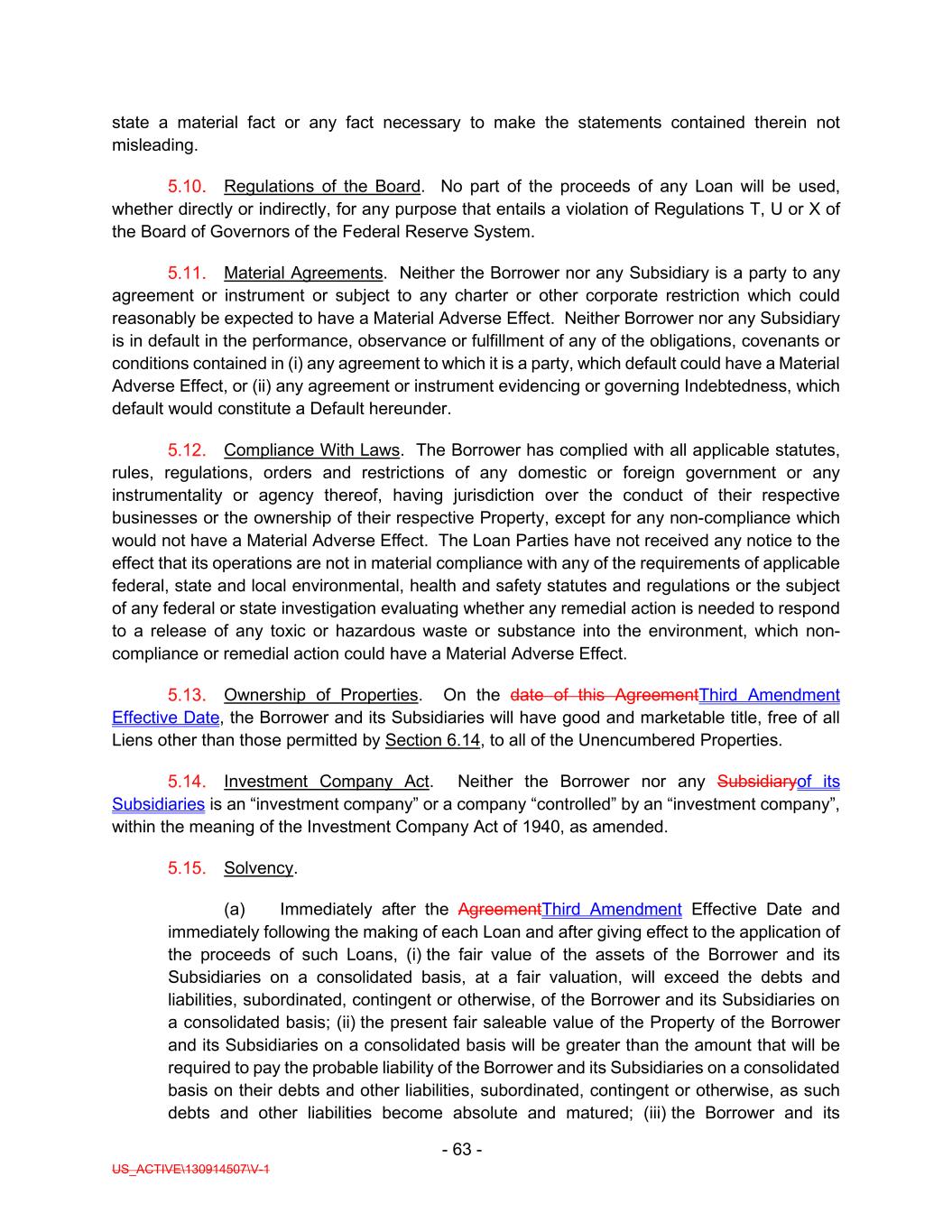 - 63 - US_ACTIVE\130914507\V-1 state a material fact or any fact necessary to make the statements contained therein not misleading. Regulations of the Board. No part of the proceeds of any Loan will be used, whether directly or indirectly, for any purpose that entails a violation of Regulations T, U or X of the Board of Governors of the Federal Reserve System. Material Agreements. Neither the Borrower nor any Subsidiary is a party to any agreement or instrument or subject to any charter or other corporate restriction which could reasonably be expected to have a Material Adverse Effect. Neither Borrower nor any Subsidiary is in default in the performance, observance or fulfillment of any of the obligations, covenants or conditions contained in (i) any agreement to which it is a party, which default could have a Material Adverse Effect, or (ii) any agreement or instrument evidencing or governing Indebtedness, which default would constitute a Default hereunder. Compliance With Laws. The Borrower has complied with all applicable statutes, rules, regulations, orders and restrictions of any domestic or foreign government or any instrumentality or agency thereof, having jurisdiction over the conduct of their respective businesses or the ownership of their respective Property, except for any non-compliance which would not have a Material Adverse Effect. The Loan Parties have not received any notice to the effect that its operations are not in material compliance with any of the requirements of applicable federal, state and local environmental, health and safety statutes and regulations or the subject of any federal or state investigation evaluating whether any remedial action is needed to respond to a release of any toxic or hazardous waste or substance into the environment, which non- compliance or remedial action could have a Material Adverse Effect. Ownership of Properties. On the date of this AgreementThird Amendment Effective Date, the Borrower and its Subsidiaries will have good and marketable title, free of all Liens other than those permitted by Section 6.14, to all of the Unencumbered Properties. Investment Company Act. Neither the Borrower nor any Subsidiaryof its Subsidiaries is an “investment company” or a company “controlled” by an “investment company”, within the meaning of the Investment Company Act of 1940, as amended. Solvency. (a) Immediately after the AgreementThird Amendment Effective Date and immediately following the making of each Loan and after giving effect to the application of the proceeds of such Loans, (i) the fair value of the assets of the Borrower and its Subsidiaries on a consolidated basis, at a fair valuation, will exceed the debts and liabilities, subordinated, contingent or otherwise, of the Borrower and its Subsidiaries on a consolidated basis; (ii) the present fair saleable value of the Property of the Borrower and its Subsidiaries on a consolidated basis will be greater than the amount that will be required to pay the probable liability of the Borrower and its Subsidiaries on a consolidated basis on their debts and other liabilities, subordinated, contingent or otherwise, as such debts and other liabilities become absolute and matured; (iii) the Borrower and its