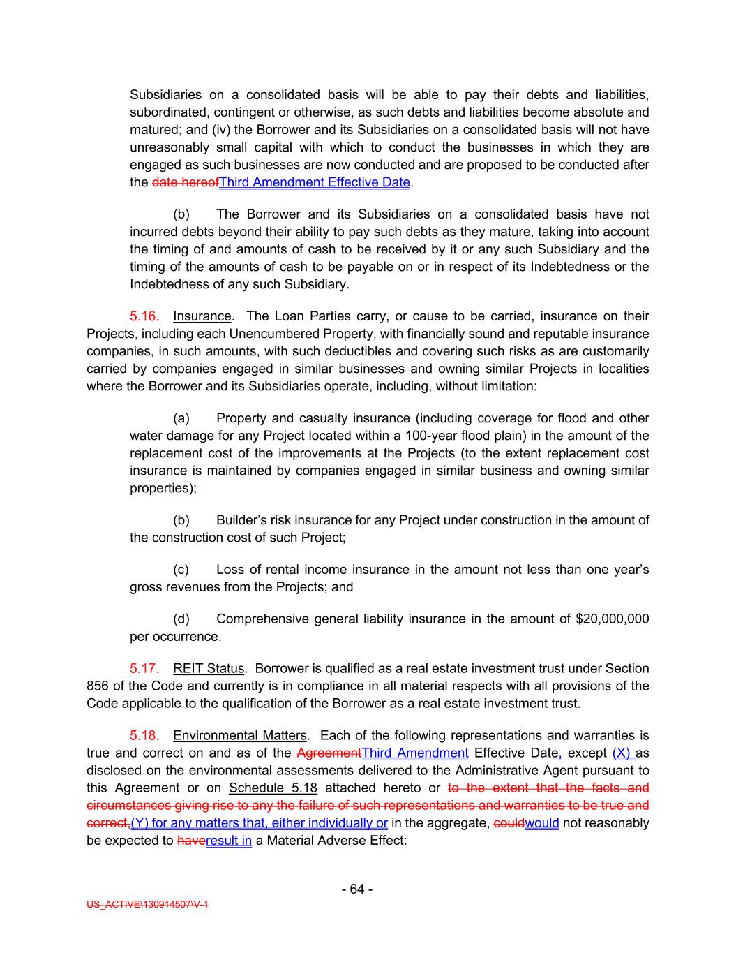 - 64 - US_ACTIVE\130914507\V-1 Subsidiaries on a consolidated basis will be able to pay their debts and liabilities, subordinated, contingent or otherwise, as such debts and liabilities become absolute and matured; and (iv) the Borrower and its Subsidiaries on a consolidated basis will not have unreasonably small capital with which to conduct the businesses in which they are engaged as such businesses are now conducted and are proposed to be conducted after the date hereofThird Amendment Effective Date. (b) The Borrower and its Subsidiaries on a consolidated basis have not incurred debts beyond their ability to pay such debts as they mature, taking into account the timing of and amounts of cash to be received by it or any such Subsidiary and the timing of the amounts of cash to be payable on or in respect of its Indebtedness or the Indebtedness of any such Subsidiary. Insurance. The Loan Parties carry, or cause to be carried, insurance on their Projects, including each Unencumbered Property, with financially sound and reputable insurance companies, in such amounts, with such deductibles and covering such risks as are customarily carried by companies engaged in similar businesses and owning similar Projects in localities where the Borrower and its Subsidiaries operate, including, without limitation: (a) Property and casualty insurance (including coverage for flood and other water damage for any Project located within a 100-year flood plain) in the amount of the replacement cost of the improvements at the Projects (to the extent replacement cost insurance is maintained by companies engaged in similar business and owning similar properties); (b) Builder’s risk insurance for any Project under construction in the amount of the construction cost of such Project; (c) Loss of rental income insurance in the amount not less than one year’s gross revenues from the Projects; and (d) Comprehensive general liability insurance in the amount of $20,000,000 per occurrence. REIT Status. Borrower is qualified as a real estate investment trust under Section 856 of the Code and currently is in compliance in all material respects with all provisions of the Code applicable to the qualification of the Borrower as a real estate investment trust. Environmental Matters. Each of the following representations and warranties is true and correct on and as of the AgreementThird Amendment Effective Date, except (X) as disclosed on the environmental assessments delivered to the Administrative Agent pursuant to this Agreement or on Schedule 5.18 attached hereto or to the extent that the facts and circumstances giving rise to any the failure of such representations and warranties to be true and correct,(Y) for any matters that, either individually or in the aggregate, couldwould not reasonably be expected to haveresult in a Material Adverse Effect: