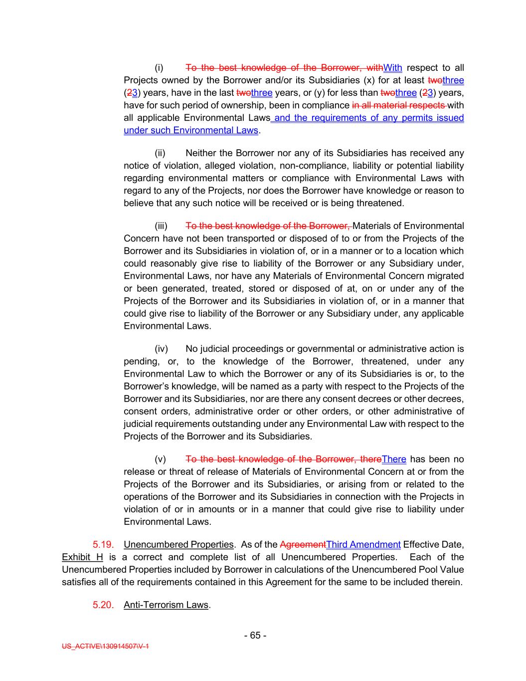 - 65 - US_ACTIVE\130914507\V-1 (i) To the best knowledge of the Borrower, withWith respect to all Projects owned by the Borrower and/or its Subsidiaries (x) for at least twothree (23) years, have in the last twothree years, or (y) for less than twothree (23) years, have for such period of ownership, been in compliance in all material respects with all applicable Environmental Laws and the requirements of any permits issued under such Environmental Laws. (ii) Neither the Borrower nor any of its Subsidiaries has received any notice of violation, alleged violation, non-compliance, liability or potential liability regarding environmental matters or compliance with Environmental Laws with regard to any of the Projects, nor does the Borrower have knowledge or reason to believe that any such notice will be received or is being threatened. (iii) To the best knowledge of the Borrower, Materials of Environmental Concern have not been transported or disposed of to or from the Projects of the Borrower and its Subsidiaries in violation of, or in a manner or to a location which could reasonably give rise to liability of the Borrower or any Subsidiary under, Environmental Laws, nor have any Materials of Environmental Concern migrated or been generated, treated, stored or disposed of at, on or under any of the Projects of the Borrower and its Subsidiaries in violation of, or in a manner that could give rise to liability of the Borrower or any Subsidiary under, any applicable Environmental Laws. (iv) No judicial proceedings or governmental or administrative action is pending, or, to the knowledge of the Borrower, threatened, under any Environmental Law to which the Borrower or any of its Subsidiaries is or, to the Borrower’s knowledge, will be named as a party with respect to the Projects of the Borrower and its Subsidiaries, nor are there any consent decrees or other decrees, consent orders, administrative order or other orders, or other administrative of judicial requirements outstanding under any Environmental Law with respect to the Projects of the Borrower and its Subsidiaries. (v) To the best knowledge of the Borrower, thereThere has been no release or threat of release of Materials of Environmental Concern at or from the Projects of the Borrower and its Subsidiaries, or arising from or related to the operations of the Borrower and its Subsidiaries in connection with the Projects in violation of or in amounts or in a manner that could give rise to liability under Environmental Laws. Unencumbered Properties. As of the AgreementThird Amendment Effective Date, Exhibit H is a correct and complete list of all Unencumbered Properties. Each of the Unencumbered Properties included by Borrower in calculations of the Unencumbered Pool Value satisfies all of the requirements contained in this Agreement for the same to be included therein. Anti-Terrorism Laws.
