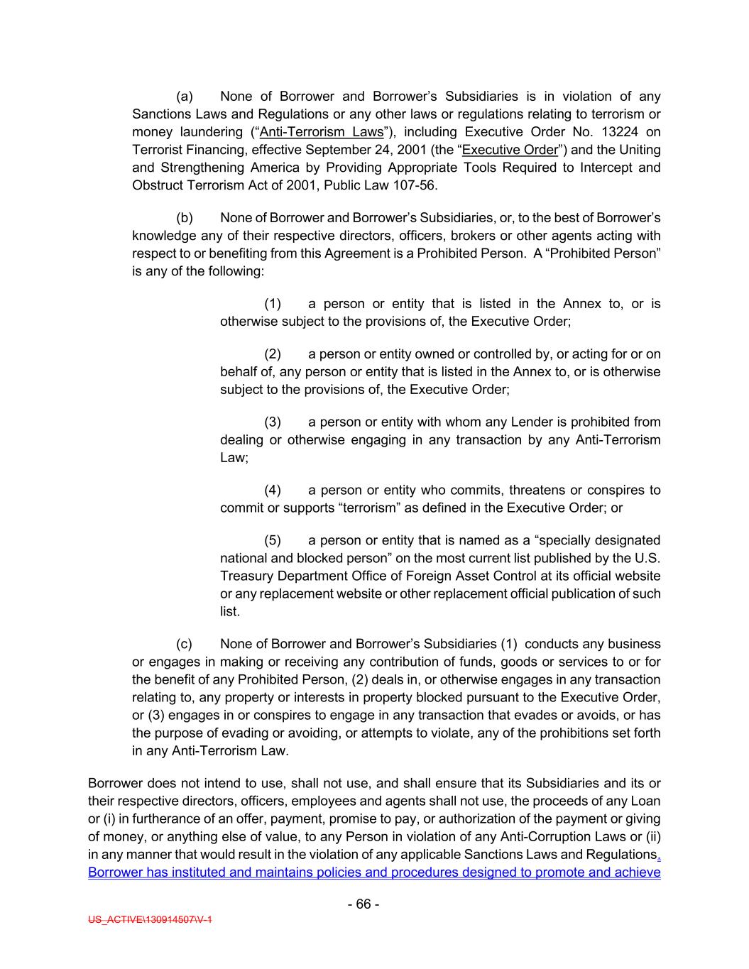 - 66 - US_ACTIVE\130914507\V-1 (a) None of Borrower and Borrower’s Subsidiaries is in violation of any Sanctions Laws and Regulations or any other laws or regulations relating to terrorism or money laundering (“Anti-Terrorism Laws”), including Executive Order No. 13224 on Terrorist Financing, effective September 24, 2001 (the “Executive Order”) and the Uniting and Strengthening America by Providing Appropriate Tools Required to Intercept and Obstruct Terrorism Act of 2001, Public Law 107-56. (b) None of Borrower and Borrower’s Subsidiaries, or, to the best of Borrower’s knowledge any of their respective directors, officers, brokers or other agents acting with respect to or benefiting from this Agreement is a Prohibited Person. A “Prohibited Person” is any of the following: (1) a person or entity that is listed in the Annex to, or is otherwise subject to the provisions of, the Executive Order; (2) a person or entity owned or controlled by, or acting for or on behalf of, any person or entity that is listed in the Annex to, or is otherwise subject to the provisions of, the Executive Order; (3) a person or entity with whom any Lender is prohibited from dealing or otherwise engaging in any transaction by any Anti-Terrorism Law; (4) a person or entity who commits, threatens or conspires to commit or supports “terrorism” as defined in the Executive Order; or (5) a person or entity that is named as a “specially designated national and blocked person” on the most current list published by the U.S. Treasury Department Office of Foreign Asset Control at its official website or any replacement website or other replacement official publication of such list. (c) None of Borrower and Borrower’s Subsidiaries (1) conducts any business or engages in making or receiving any contribution of funds, goods or services to or for the benefit of any Prohibited Person, (2) deals in, or otherwise engages in any transaction relating to, any property or interests in property blocked pursuant to the Executive Order, or (3) engages in or conspires to engage in any transaction that evades or avoids, or has the purpose of evading or avoiding, or attempts to violate, any of the prohibitions set forth in any Anti-Terrorism Law. Borrower does not intend to use, shall not use, and shall ensure that its Subsidiaries and its or their respective directors, officers, employees and agents shall not use, the proceeds of any Loan or (i) in furtherance of an offer, payment, promise to pay, or authorization of the payment or giving of money, or anything else of value, to any Person in violation of any Anti-Corruption Laws or (ii) in any manner that would result in the violation of any applicable Sanctions Laws and Regulations. Borrower has instituted and maintains policies and procedures designed to promote and achieve