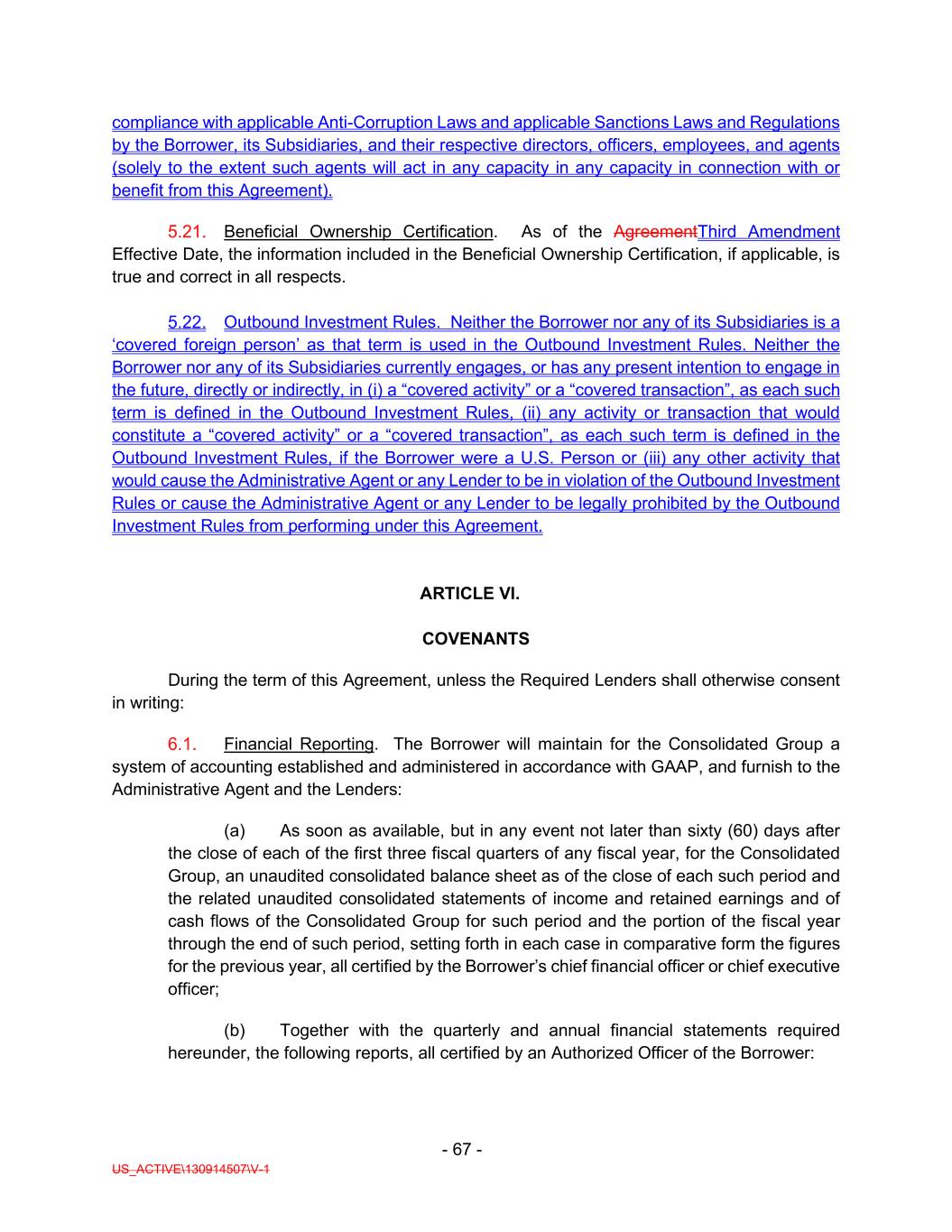 - 67 - US_ACTIVE\130914507\V-1 compliance with applicable Anti-Corruption Laws and applicable Sanctions Laws and Regulations by the Borrower, its Subsidiaries, and their respective directors, officers, employees, and agents (solely to the extent such agents will act in any capacity in any capacity in connection with or benefit from this Agreement). Beneficial Ownership Certification. As of the AgreementThird Amendment Effective Date, the information included in the Beneficial Ownership Certification, if applicable, is true and correct in all respects. Outbound Investment Rules. Neither the Borrower nor any of its Subsidiaries is a ‘covered foreign person’ as that term is used in the Outbound Investment Rules. Neither the Borrower nor any of its Subsidiaries currently engages, or has any present intention to engage in the future, directly or indirectly, in (i) a “covered activity” or a “covered transaction”, as each such term is defined in the Outbound Investment Rules, (ii) any activity or transaction that would constitute a “covered activity” or a “covered transaction”, as each such term is defined in the Outbound Investment Rules, if the Borrower were a U.S. Person or (iii) any other activity that would cause the Administrative Agent or any Lender to be in violation of the Outbound Investment Rules or cause the Administrative Agent or any Lender to be legally prohibited by the Outbound Investment Rules from performing under this Agreement. ARTICLE VI. COVENANTS During the term of this Agreement, unless the Required Lenders shall otherwise consent in writing: Financial Reporting. The Borrower will maintain for the Consolidated Group a system of accounting established and administered in accordance with GAAP, and furnish to the Administrative Agent and the Lenders: (a) As soon as available, but in any event not later than sixty (60) days after the close of each of the first three fiscal quarters of any fiscal year, for the Consolidated Group, an unaudited consolidated balance sheet as of the close of each such period and the related unaudited consolidated statements of income and retained earnings and of cash flows of the Consolidated Group for such period and the portion of the fiscal year through the end of such period, setting forth in each case in comparative form the figures for the previous year, all certified by the Borrower’s chief financial officer or chief executive officer; (b) Together with the quarterly and annual financial statements required hereunder, the following reports, all certified by an Authorized Officer of the Borrower: