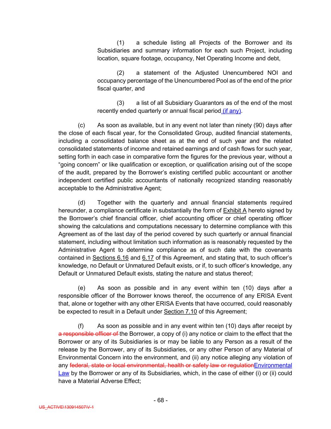 - 68 - US_ACTIVE\130914507\V-1 (1) a schedule listing all Projects of the Borrower and its Subsidiaries and summary information for each such Project, including location, square footage, occupancy, Net Operating Income and debt, (2) a statement of the Adjusted Unencumbered NOI and occupancy percentage of the Unencumbered Pool as of the end of the prior fiscal quarter, and (3) a list of all Subsidiary Guarantors as of the end of the most recently ended quarterly or annual fiscal period (if any). (c) As soon as available, but in any event not later than ninety (90) days after the close of each fiscal year, for the Consolidated Group, audited financial statements, including a consolidated balance sheet as at the end of such year and the related consolidated statements of income and retained earnings and of cash flows for such year, setting forth in each case in comparative form the figures for the previous year, without a “going concern” or like qualification or exception, or qualification arising out of the scope of the audit, prepared by the Borrower’s existing certified public accountant or another independent certified public accountants of nationally recognized standing reasonably acceptable to the Administrative Agent; (d) Together with the quarterly and annual financial statements required hereunder, a compliance certificate in substantially the form of Exhibit A hereto signed by the Borrower’s chief financial officer, chief accounting officer or chief operating officer showing the calculations and computations necessary to determine compliance with this Agreement as of the last day of the period covered by such quarterly or annual financial statement, including without limitation such information as is reasonably requested by the Administrative Agent to determine compliance as of such date with the covenants contained in Sections 6.16 and 6.17 of this Agreement, and stating that, to such officer’s knowledge, no Default or Unmatured Default exists, or if, to such officer’s knowledge, any Default or Unmatured Default exists, stating the nature and status thereof; (e) As soon as possible and in any event within ten (10) days after a responsible officer of the Borrower knows thereof, the occurrence of any ERISA Event that, alone or together with any other ERISA Events that have occurred, could reasonably be expected to result in a Default under Section 7.10 of this Agreement; (f) As soon as possible and in any event within ten (10) days after receipt by a responsible officer of the Borrower, a copy of (i) any notice or claim to the effect that the Borrower or any of its Subsidiaries is or may be liable to any Person as a result of the release by the Borrower, any of its Subsidiaries, or any other Person of any Material of Environmental Concern into the environment, and (ii) any notice alleging any violation of any federal, state or local environmental, health or safety law or regulationEnvironmental Law by the Borrower or any of its Subsidiaries, which, in the case of either (i) or (ii) could have a Material Adverse Effect;