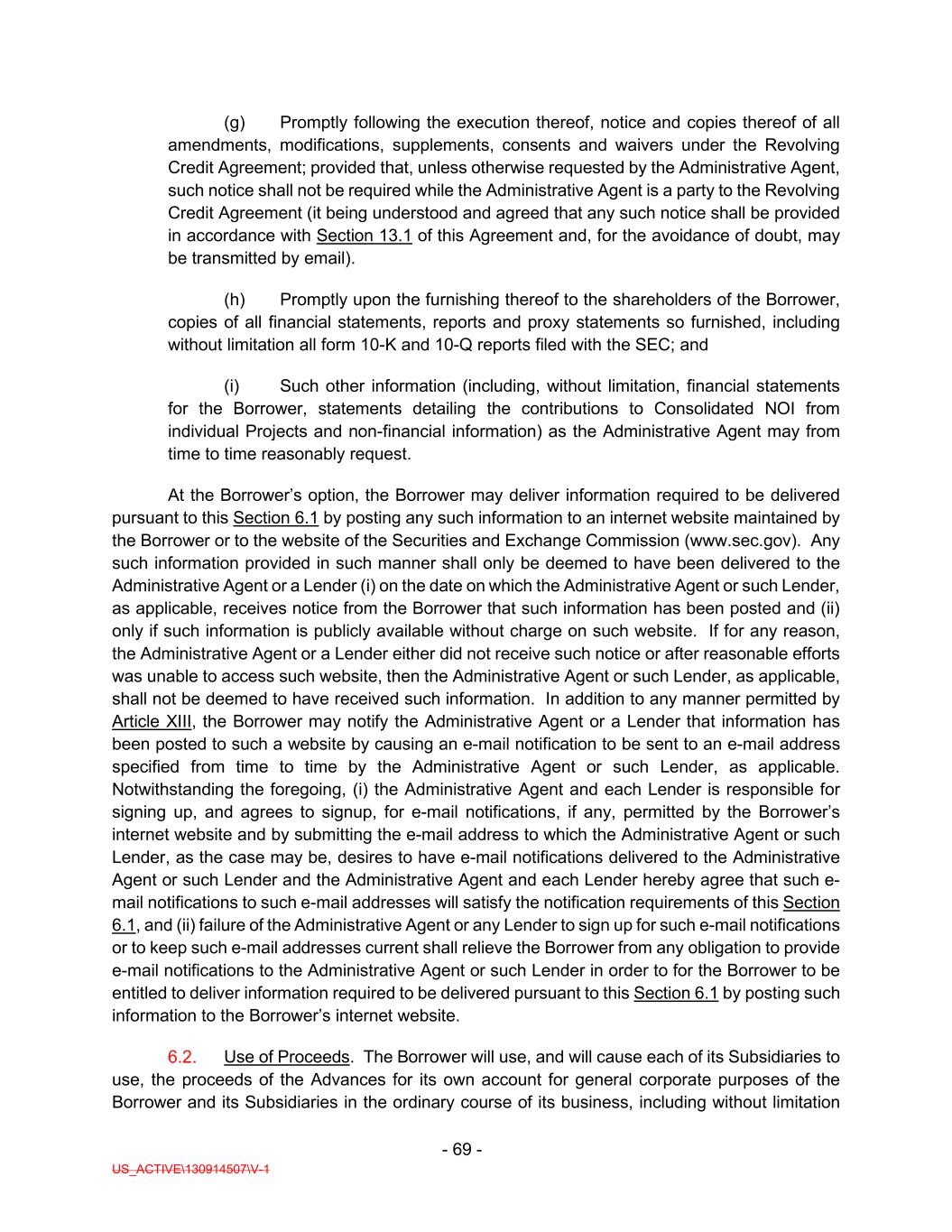 - 69 - US_ACTIVE\130914507\V-1 (g) Promptly following the execution thereof, notice and copies thereof of all amendments, modifications, supplements, consents and waivers under the Revolving Credit Agreement; provided that, unless otherwise requested by the Administrative Agent, such notice shall not be required while the Administrative Agent is a party to the Revolving Credit Agreement (it being understood and agreed that any such notice shall be provided in accordance with Section 13.1 of this Agreement and, for the avoidance of doubt, may be transmitted by email). (h) Promptly upon the furnishing thereof to the shareholders of the Borrower, copies of all financial statements, reports and proxy statements so furnished, including without limitation all form 10-K and 10-Q reports filed with the SEC; and (i) Such other information (including, without limitation, financial statements for the Borrower, statements detailing the contributions to Consolidated NOI from individual Projects and non-financial information) as the Administrative Agent may from time to time reasonably request. At the Borrower’s option, the Borrower may deliver information required to be delivered pursuant to this Section 6.1 by posting any such information to an internet website maintained by the Borrower or to the website of the Securities and Exchange Commission (www.sec.gov). Any such information provided in such manner shall only be deemed to have been delivered to the Administrative Agent or a Lender (i) on the date on which the Administrative Agent or such Lender, as applicable, receives notice from the Borrower that such information has been posted and (ii) only if such information is publicly available without charge on such website. If for any reason, the Administrative Agent or a Lender either did not receive such notice or after reasonable efforts was unable to access such website, then the Administrative Agent or such Lender, as applicable, shall not be deemed to have received such information. In addition to any manner permitted by Article XIII, the Borrower may notify the Administrative Agent or a Lender that information has been posted to such a website by causing an e-mail notification to be sent to an e-mail address specified from time to time by the Administrative Agent or such Lender, as applicable. Notwithstanding the foregoing, (i) the Administrative Agent and each Lender is responsible for signing up, and agrees to signup, for e-mail notifications, if any, permitted by the Borrower’s internet website and by submitting the e-mail address to which the Administrative Agent or such Lender, as the case may be, desires to have e-mail notifications delivered to the Administrative Agent or such Lender and the Administrative Agent and each Lender hereby agree that such e- mail notifications to such e-mail addresses will satisfy the notification requirements of this Section 6.1, and (ii) failure of the Administrative Agent or any Lender to sign up for such e-mail notifications or to keep such e-mail addresses current shall relieve the Borrower from any obligation to provide e-mail notifications to the Administrative Agent or such Lender in order to for the Borrower to be entitled to deliver information required to be delivered pursuant to this Section 6.1 by posting such information to the Borrower’s internet website. Use of Proceeds. The Borrower will use, and will cause each of its Subsidiaries to use, the proceeds of the Advances for its own account for general corporate purposes of the Borrower and its Subsidiaries in the ordinary course of its business, including without limitation