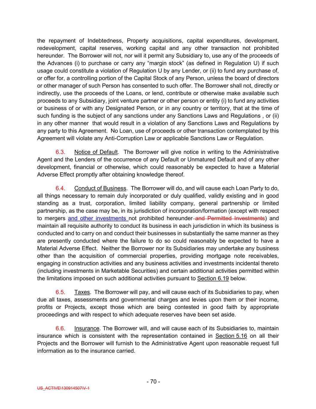 - 70 - US_ACTIVE\130914507\V-1 the repayment of Indebtedness, Property acquisitions, capital expenditures, development, redevelopment, capital reserves, working capital and any other transaction not prohibited hereunder. The Borrower will not, nor will it permit any Subsidiary to, use any of the proceeds of the Advances (i) to purchase or carry any “margin stock” (as defined in Regulation U) if such usage could constitute a violation of Regulation U by any Lender, or (ii) to fund any purchase of, or offer for, a controlling portion of the Capital Stock of any Person, unless the board of directors or other manager of such Person has consented to such offer. The Borrower shall not, directly or indirectly, use the proceeds of the Loans, or lend, contribute or otherwise make available such proceeds to any Subsidiary, joint venture partner or other person or entity (i) to fund any activities or business of or with any Designated Person, or in any country or territory, that at the time of such funding is the subject of any sanctions under any Sanctions Laws and Regulations , or (ii) in any other manner that would result in a violation of any Sanctions Laws and Regulations by any party to this Agreement. No Loan, use of proceeds or other transaction contemplated by this Agreement will violate any Anti-Corruption Law or applicable Sanctions Law or Regulation. Notice of Default. The Borrower will give notice in writing to the Administrative Agent and the Lenders of the occurrence of any Default or Unmatured Default and of any other development, financial or otherwise, which could reasonably be expected to have a Material Adverse Effect promptly after obtaining knowledge thereof. Conduct of Business. The Borrower will do, and will cause each Loan Party to do, all things necessary to remain duly incorporated or duly qualified, validly existing and in good standing as a trust, corporation, limited liability company, general partnership or limited partnership, as the case may be, in its jurisdiction of incorporation/formation (except with respect to mergers and other investments not prohibited hereunder and Permitted Investments) and maintain all requisite authority to conduct its business in each jurisdiction in which its business is conducted and to carry on and conduct their businesses in substantially the same manner as they are presently conducted where the failure to do so could reasonably be expected to have a Material Adverse Effect. Neither the Borrower nor its Subsidiaries may undertake any business other than the acquisition of commercial properties, providing mortgage note receivables, engaging in construction activities and any business activities and investments incidental thereto (including investments in Marketable Securities) and certain additional activities permitted within the limitations imposed on such additional activities pursuant to Section 6.19 below. Taxes. The Borrower will pay, and will cause each of its Subsidiaries to pay, when due all taxes, assessments and governmental charges and levies upon them or their income, profits or Projects, except those which are being contested in good faith by appropriate proceedings and with respect to which adequate reserves have been set aside. Insurance. The Borrower will, and will cause each of its Subsidiaries to, maintain insurance which is consistent with the representation contained in Section 5.16 on all their Projects and the Borrower will furnish to the Administrative Agent upon reasonable request full information as to the insurance carried.