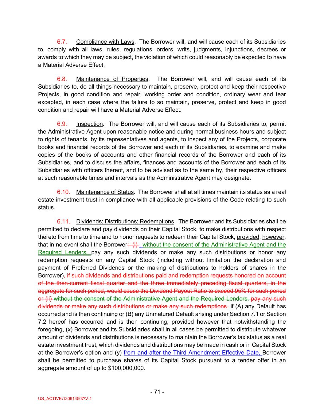 - 71 - US_ACTIVE\130914507\V-1 Compliance with Laws. The Borrower will, and will cause each of its Subsidiaries to, comply with all laws, rules, regulations, orders, writs, judgments, injunctions, decrees or awards to which they may be subject, the violation of which could reasonably be expected to have a Material Adverse Effect. Maintenance of Properties. The Borrower will, and will cause each of its Subsidiaries to, do all things necessary to maintain, preserve, protect and keep their respective Projects, in good condition and repair, working order and condition, ordinary wear and tear excepted, in each case where the failure to so maintain, preserve, protect and keep in good condition and repair will have a Material Adverse Effect. Inspection. The Borrower will, and will cause each of its Subsidiaries to, permit the Administrative Agent upon reasonable notice and during normal business hours and subject to rights of tenants, by its representatives and agents, to inspect any of the Projects, corporate books and financial records of the Borrower and each of its Subsidiaries, to examine and make copies of the books of accounts and other financial records of the Borrower and each of its Subsidiaries, and to discuss the affairs, finances and accounts of the Borrower and each of its Subsidiaries with officers thereof, and to be advised as to the same by, their respective officers at such reasonable times and intervals as the Administrative Agent may designate. Maintenance of Status. The Borrower shall at all times maintain its status as a real estate investment trust in compliance with all applicable provisions of the Code relating to such status. Dividends; Distributions; Redemptions. The Borrower and its Subsidiaries shall be permitted to declare and pay dividends on their Capital Stock, to make distributions with respect thereto from time to time and to honor requests to redeem their Capital Stock, provided, however, that in no event shall the Borrower: (i) , without the consent of the Administrative Agent and the Required Lenders, pay any such dividends or make any such distributions or honor any redemption requests on any Capital Stock (including without limitation the declaration and payment of Preferred Dividends or the making of distributions to holders of shares in the Borrower), if such dividends and distributions paid and redemption requests honored on account of the then-current fiscal quarter and the three immediately preceding fiscal quarters, in the aggregate for such period, would cause the Dividend Payout Ratio to exceed 95% for such period or (ii) without the consent of the Administrative Agent and the Required Lenders, pay any such dividends or make any such distributions or make any such redemptions if (A) any Default has occurred and is then continuing or (B) any Unmatured Default arising under Section 7.1 or Section 7.2 hereof has occurred and is then continuing; provided however that notwithstanding the foregoing, (x) Borrower and its Subsidiaries shall in all cases be permitted to distribute whatever amount of dividends and distributions is necessary to maintain the Borrower’s tax status as a real estate investment trust, which dividends and distributions may be made in cash or in Capital Stock at the Borrower’s option and (y) from and after the Third Amendment Effective Date, Borrower shall be permitted to purchase shares of its Capital Stock pursuant to a tender offer in an aggregate amount of up to $100,000,000.