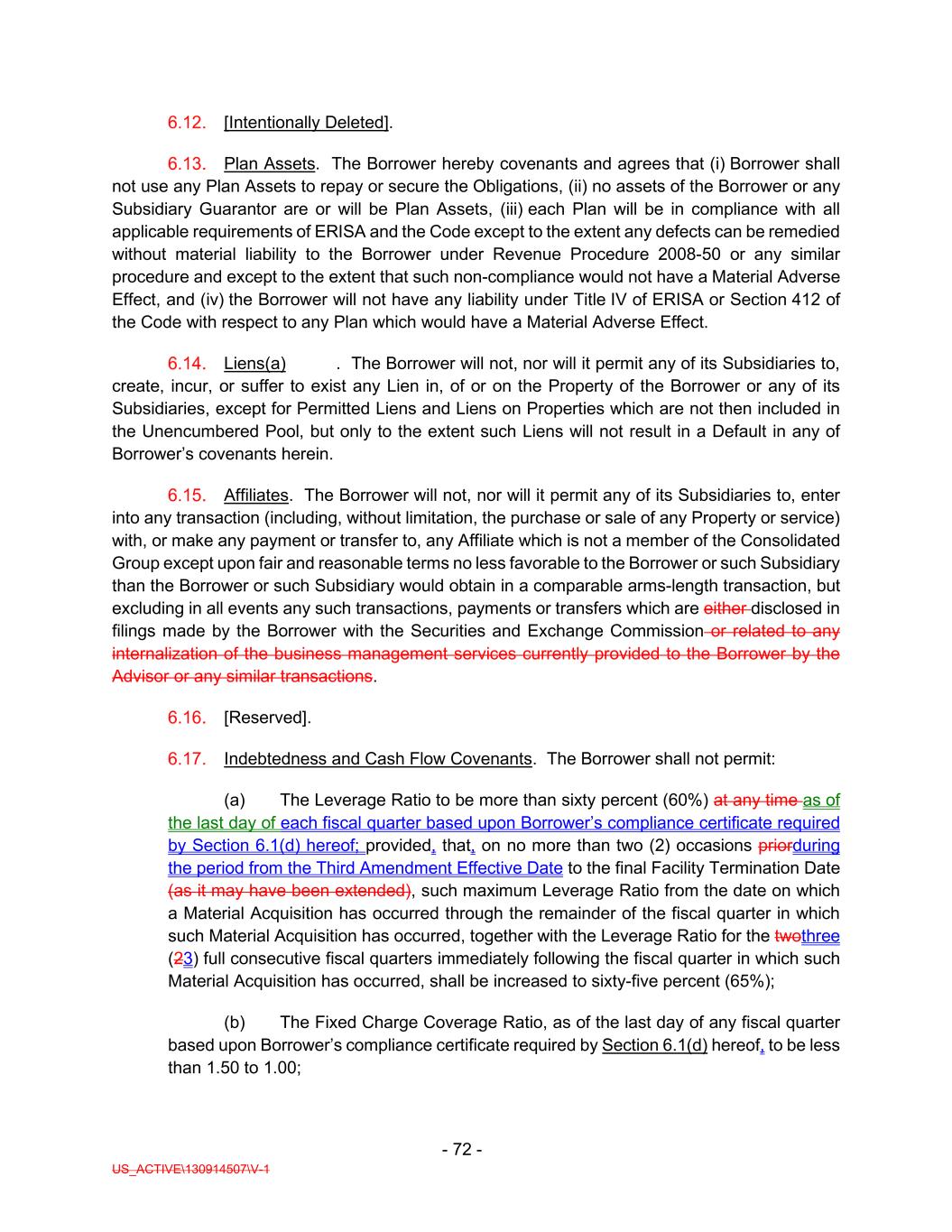 - 72 - US_ACTIVE\130914507\V-1 [Intentionally Deleted]. Plan Assets. The Borrower hereby covenants and agrees that (i) Borrower shall not use any Plan Assets to repay or secure the Obligations, (ii) no assets of the Borrower or any Subsidiary Guarantor are or will be Plan Assets, (iii) each Plan will be in compliance with all applicable requirements of ERISA and the Code except to the extent any defects can be remedied without material liability to the Borrower under Revenue Procedure 2008-50 or any similar procedure and except to the extent that such non-compliance would not have a Material Adverse Effect, and (iv) the Borrower will not have any liability under Title IV of ERISA or Section 412 of the Code with respect to any Plan which would have a Material Adverse Effect. Liens(a) . The Borrower will not, nor will it permit any of its Subsidiaries to, create, incur, or suffer to exist any Lien in, of or on the Property of the Borrower or any of its Subsidiaries, except for Permitted Liens and Liens on Properties which are not then included in the Unencumbered Pool, but only to the extent such Liens will not result in a Default in any of Borrower’s covenants herein. Affiliates. The Borrower will not, nor will it permit any of its Subsidiaries to, enter into any transaction (including, without limitation, the purchase or sale of any Property or service) with, or make any payment or transfer to, any Affiliate which is not a member of the Consolidated Group except upon fair and reasonable terms no less favorable to the Borrower or such Subsidiary than the Borrower or such Subsidiary would obtain in a comparable arms-length transaction, but excluding in all events any such transactions, payments or transfers which are either disclosed in filings made by the Borrower with the Securities and Exchange Commission or related to any internalization of the business management services currently provided to the Borrower by the Advisor or any similar transactions. [Reserved]. Indebtedness and Cash Flow Covenants. The Borrower shall not permit: (a) The Leverage Ratio to be more than sixty percent (60%) at any time as of the last day of each fiscal quarter based upon Borrower’s compliance certificate required by Section 6.1(d) hereof; provided, that, on no more than two (2) occasions priorduring the period from the Third Amendment Effective Date to the final Facility Termination Date (as it may have been extended), such maximum Leverage Ratio from the date on which a Material Acquisition has occurred through the remainder of the fiscal quarter in which such Material Acquisition has occurred, together with the Leverage Ratio for the twothree (23) full consecutive fiscal quarters immediately following the fiscal quarter in which such Material Acquisition has occurred, shall be increased to sixty-five percent (65%); (b) The Fixed Charge Coverage Ratio, as of the last day of any fiscal quarter based upon Borrower’s compliance certificate required by Section 6.1(d) hereof, to be less than 1.50 to 1.00;