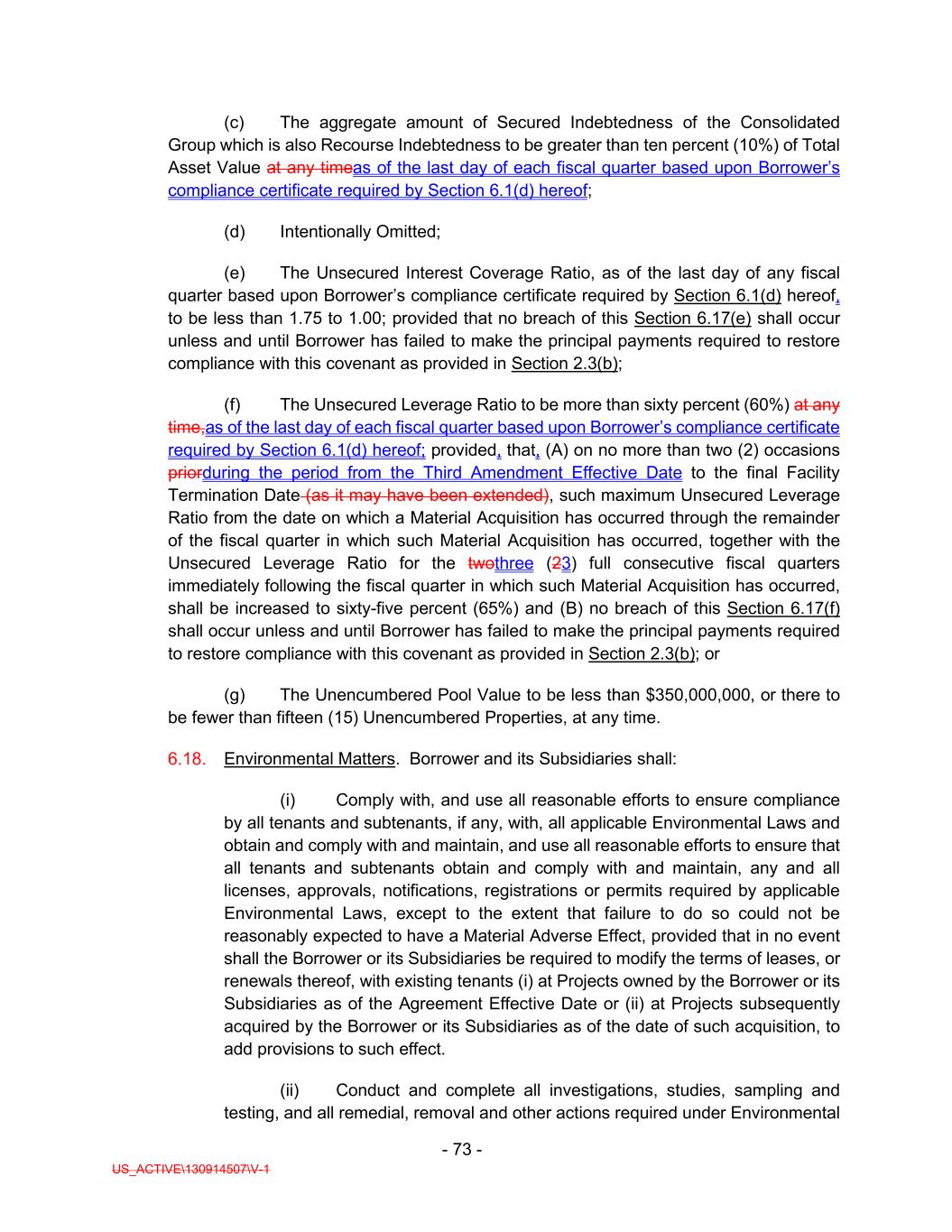 - 73 - US_ACTIVE\130914507\V-1 (c) The aggregate amount of Secured Indebtedness of the Consolidated Group which is also Recourse Indebtedness to be greater than ten percent (10%) of Total Asset Value at any timeas of the last day of each fiscal quarter based upon Borrower’s compliance certificate required by Section 6.1(d) hereof; (d) Intentionally Omitted; (e) The Unsecured Interest Coverage Ratio, as of the last day of any fiscal quarter based upon Borrower’s compliance certificate required by Section 6.1(d) hereof, to be less than 1.75 to 1.00; provided that no breach of this Section 6.17(e) shall occur unless and until Borrower has failed to make the principal payments required to restore compliance with this covenant as provided in Section 2.3(b); (f) The Unsecured Leverage Ratio to be more than sixty percent (60%) at any time,as of the last day of each fiscal quarter based upon Borrower’s compliance certificate required by Section 6.1(d) hereof; provided, that, (A) on no more than two (2) occasions priorduring the period from the Third Amendment Effective Date to the final Facility Termination Date (as it may have been extended), such maximum Unsecured Leverage Ratio from the date on which a Material Acquisition has occurred through the remainder of the fiscal quarter in which such Material Acquisition has occurred, together with the Unsecured Leverage Ratio for the twothree (23) full consecutive fiscal quarters immediately following the fiscal quarter in which such Material Acquisition has occurred, shall be increased to sixty-five percent (65%) and (B) no breach of this Section 6.17(f) shall occur unless and until Borrower has failed to make the principal payments required to restore compliance with this covenant as provided in Section 2.3(b); or (g) The Unencumbered Pool Value to be less than $350,000,000, or there to be fewer than fifteen (15) Unencumbered Properties, at any time. Environmental Matters. Borrower and its Subsidiaries shall: (i) Comply with, and use all reasonable efforts to ensure compliance by all tenants and subtenants, if any, with, all applicable Environmental Laws and obtain and comply with and maintain, and use all reasonable efforts to ensure that all tenants and subtenants obtain and comply with and maintain, any and all licenses, approvals, notifications, registrations or permits required by applicable Environmental Laws, except to the extent that failure to do so could not be reasonably expected to have a Material Adverse Effect, provided that in no event shall the Borrower or its Subsidiaries be required to modify the terms of leases, or renewals thereof, with existing tenants (i) at Projects owned by the Borrower or its Subsidiaries as of the Agreement Effective Date or (ii) at Projects subsequently acquired by the Borrower or its Subsidiaries as of the date of such acquisition, to add provisions to such effect. (ii) Conduct and complete all investigations, studies, sampling and testing, and all remedial, removal and other actions required under Environmental