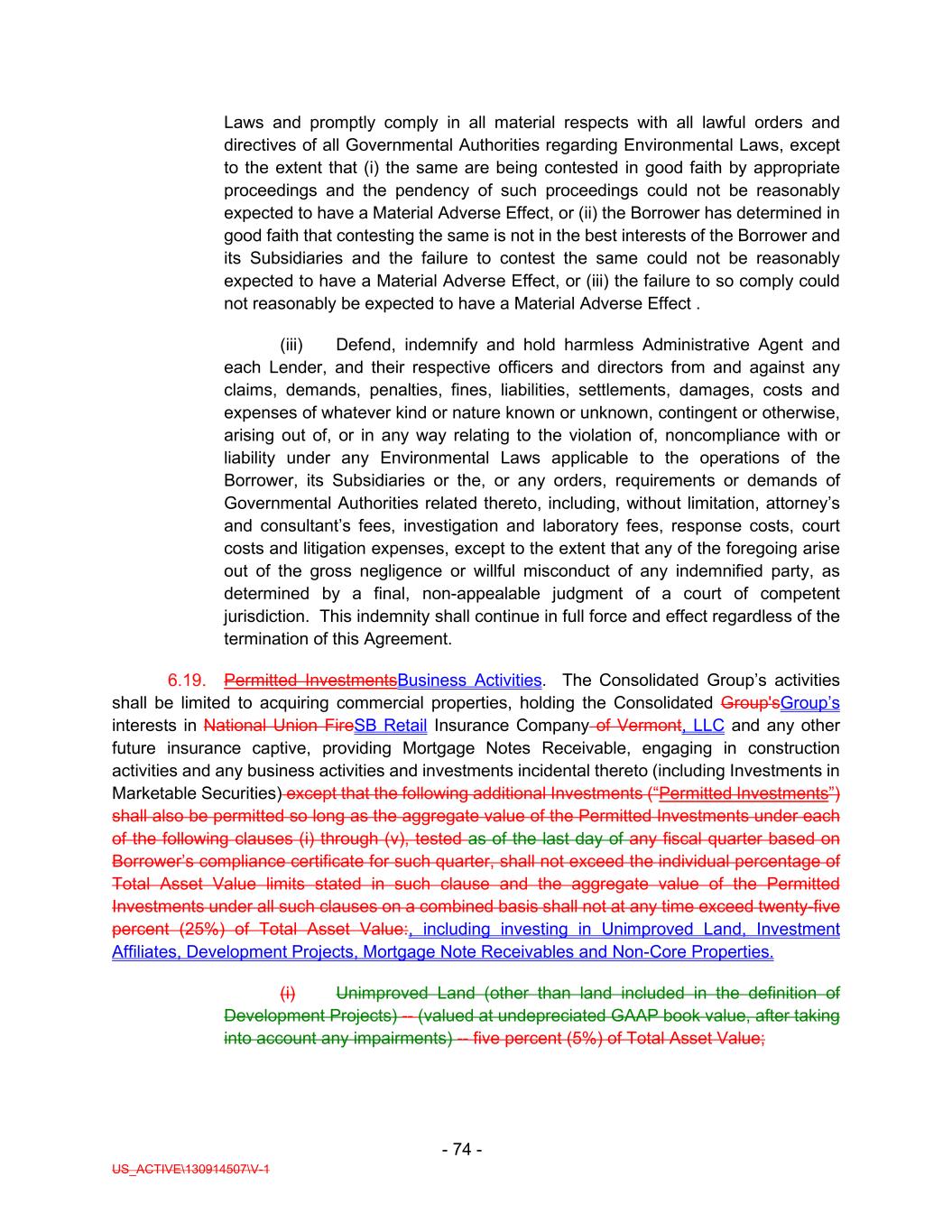 - 74 - US_ACTIVE\130914507\V-1 Laws and promptly comply in all material respects with all lawful orders and directives of all Governmental Authorities regarding Environmental Laws, except to the extent that (i) the same are being contested in good faith by appropriate proceedings and the pendency of such proceedings could not be reasonably expected to have a Material Adverse Effect, or (ii) the Borrower has determined in good faith that contesting the same is not in the best interests of the Borrower and its Subsidiaries and the failure to contest the same could not be reasonably expected to have a Material Adverse Effect, or (iii) the failure to so comply could not reasonably be expected to have a Material Adverse Effect . (iii) Defend, indemnify and hold harmless Administrative Agent and each Lender, and their respective officers and directors from and against any claims, demands, penalties, fines, liabilities, settlements, damages, costs and expenses of whatever kind or nature known or unknown, contingent or otherwise, arising out of, or in any way relating to the violation of, noncompliance with or liability under any Environmental Laws applicable to the operations of the Borrower, its Subsidiaries or the, or any orders, requirements or demands of Governmental Authorities related thereto, including, without limitation, attorney’s and consultant’s fees, investigation and laboratory fees, response costs, court costs and litigation expenses, except to the extent that any of the foregoing arise out of the gross negligence or willful misconduct of any indemnified party, as determined by a final, non-appealable judgment of a court of competent jurisdiction. This indemnity shall continue in full force and effect regardless of the termination of this Agreement. Permitted InvestmentsBusiness Activities. The Consolidated Group’s activities shall be limited to acquiring commercial properties, holding the Consolidated Group'sGroup’s interests in National Union FireSB Retail Insurance Company of Vermont, LLC and any other future insurance captive, providing Mortgage Notes Receivable, engaging in construction activities and any business activities and investments incidental thereto (including Investments in Marketable Securities) except that the following additional Investments (“Permitted Investments”) shall also be permitted so long as the aggregate value of the Permitted Investments under each of the following clauses (i) through (v), tested as of the last day of any fiscal quarter based on Borrower’s compliance certificate for such quarter, shall not exceed the individual percentage of Total Asset Value limits stated in such clause and the aggregate value of the Permitted Investments under all such clauses on a combined basis shall not at any time exceed twenty-five percent (25%) of Total Asset Value:, including investing in Unimproved Land, Investment Affiliates, Development Projects, Mortgage Note Receivables and Non-Core Properties. (i) Unimproved Land (other than land included in the definition of Development Projects) -- (valued at undepreciated GAAP book value, after taking into account any impairments) -- five percent (5%) of Total Asset Value;