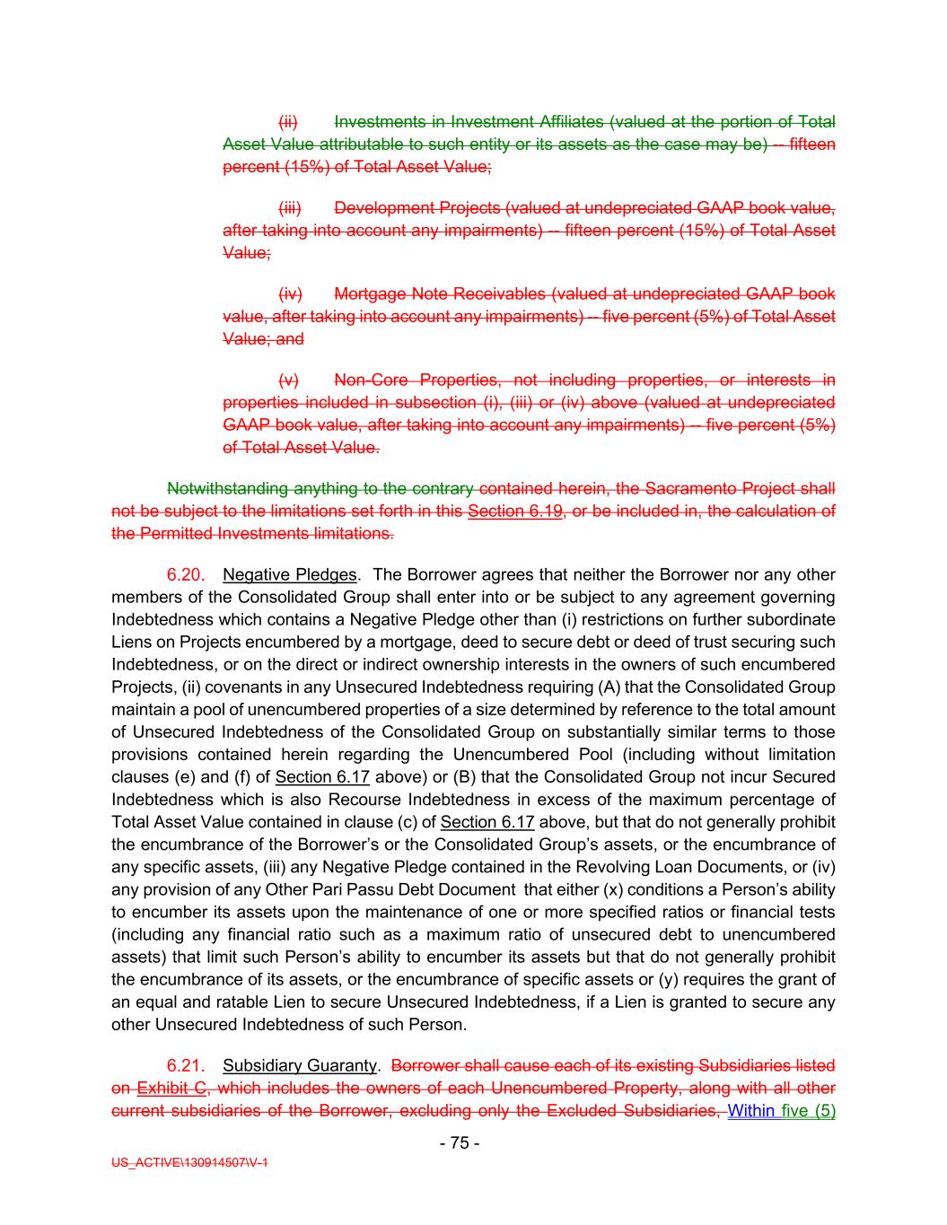 - 75 - US_ACTIVE\130914507\V-1 (ii) Investments in Investment Affiliates (valued at the portion of Total Asset Value attributable to such entity or its assets as the case may be) -- fifteen percent (15%) of Total Asset Value; (iii) Development Projects (valued at undepreciated GAAP book value, after taking into account any impairments) -- fifteen percent (15%) of Total Asset Value; (iv) Mortgage Note Receivables (valued at undepreciated GAAP book value, after taking into account any impairments) -- five percent (5%) of Total Asset Value; and (v) Non-Core Properties, not including properties, or interests in properties included in subsection (i), (iii) or (iv) above (valued at undepreciated GAAP book value, after taking into account any impairments) -- five percent (5%) of Total Asset Value. Notwithstanding anything to the contrary contained herein, the Sacramento Project shall not be subject to the limitations set forth in this Section 6.19, or be included in, the calculation of the Permitted Investments limitations. Negative Pledges. The Borrower agrees that neither the Borrower nor any other members of the Consolidated Group shall enter into or be subject to any agreement governing Indebtedness which contains a Negative Pledge other than (i) restrictions on further subordinate Liens on Projects encumbered by a mortgage, deed to secure debt or deed of trust securing such Indebtedness, or on the direct or indirect ownership interests in the owners of such encumbered Projects, (ii) covenants in any Unsecured Indebtedness requiring (A) that the Consolidated Group maintain a pool of unencumbered properties of a size determined by reference to the total amount of Unsecured Indebtedness of the Consolidated Group on substantially similar terms to those provisions contained herein regarding the Unencumbered Pool (including without limitation clauses (e) and (f) of Section 6.17 above) or (B) that the Consolidated Group not incur Secured Indebtedness which is also Recourse Indebtedness in excess of the maximum percentage of Total Asset Value contained in clause (c) of Section 6.17 above, but that do not generally prohibit the encumbrance of the Borrower’s or the Consolidated Group’s assets, or the encumbrance of any specific assets, (iii) any Negative Pledge contained in the Revolving Loan Documents, or (iv) any provision of any Other Pari Passu Debt Document that either (x) conditions a Person’s ability to encumber its assets upon the maintenance of one or more specified ratios or financial tests (including any financial ratio such as a maximum ratio of unsecured debt to unencumbered assets) that limit such Person’s ability to encumber its assets but that do not generally prohibit the encumbrance of its assets, or the encumbrance of specific assets or (y) requires the grant of an equal and ratable Lien to secure Unsecured Indebtedness, if a Lien is granted to secure any other Unsecured Indebtedness of such Person. Subsidiary Guaranty. Borrower shall cause each of its existing Subsidiaries listed on Exhibit C, which includes the owners of each Unencumbered Property, along with all other current subsidiaries of the Borrower, excluding only the Excluded Subsidiaries, Within five (5)