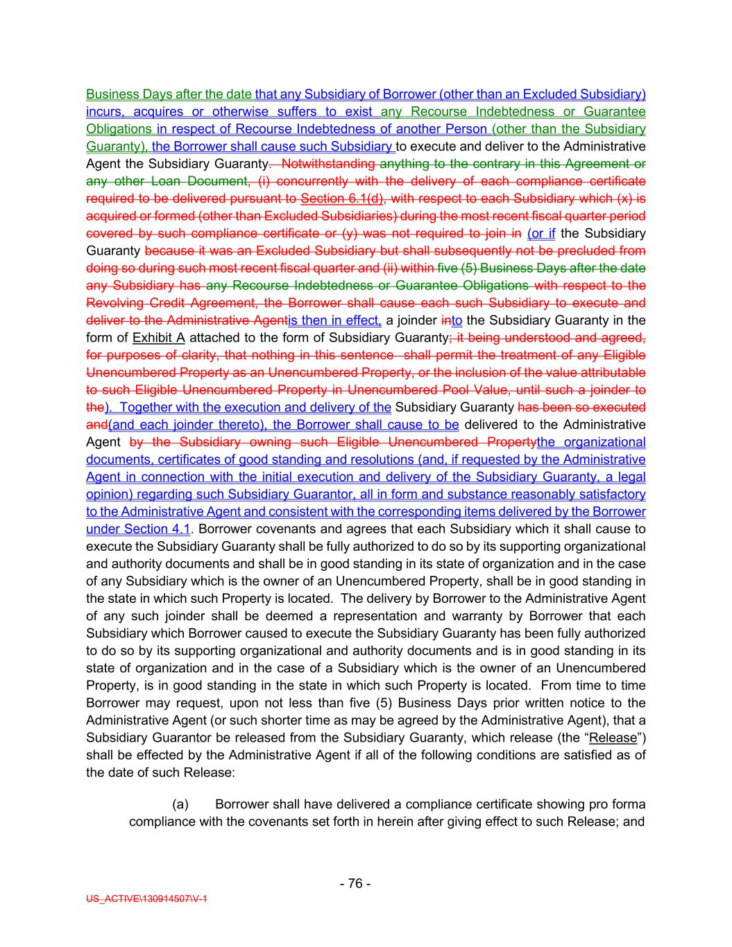 - 76 - US_ACTIVE\130914507\V-1 Business Days after the date that any Subsidiary of Borrower (other than an Excluded Subsidiary) incurs, acquires or otherwise suffers to exist any Recourse Indebtedness or Guarantee Obligations in respect of Recourse Indebtedness of another Person (other than the Subsidiary Guaranty), the Borrower shall cause such Subsidiary to execute and deliver to the Administrative Agent the Subsidiary Guaranty. Notwithstanding anything to the contrary in this Agreement or any other Loan Document, (i) concurrently with the delivery of each compliance certificate required to be delivered pursuant to Section 6.1(d), with respect to each Subsidiary which (x) is acquired or formed (other than Excluded Subsidiaries) during the most recent fiscal quarter period covered by such compliance certificate or (y) was not required to join in (or if the Subsidiary Guaranty because it was an Excluded Subsidiary but shall subsequently not be precluded from doing so during such most recent fiscal quarter and (ii) within five (5) Business Days after the date any Subsidiary has any Recourse Indebtedness or Guarantee Obligations with respect to the Revolving Credit Agreement, the Borrower shall cause each such Subsidiary to execute and deliver to the Administrative Agentis then in effect, a joinder into the Subsidiary Guaranty in the form of Exhibit A attached to the form of Subsidiary Guaranty; it being understood and agreed, for purposes of clarity, that nothing in this sentence shall permit the treatment of any Eligible Unencumbered Property as an Unencumbered Property, or the inclusion of the value attributable to such Eligible Unencumbered Property in Unencumbered Pool Value, until such a joinder to the). Together with the execution and delivery of the Subsidiary Guaranty has been so executed and(and each joinder thereto), the Borrower shall cause to be delivered to the Administrative Agent by the Subsidiary owning such Eligible Unencumbered Propertythe organizational documents, certificates of good standing and resolutions (and, if requested by the Administrative Agent in connection with the initial execution and delivery of the Subsidiary Guaranty, a legal opinion) regarding such Subsidiary Guarantor, all in form and substance reasonably satisfactory to the Administrative Agent and consistent with the corresponding items delivered by the Borrower under Section 4.1. Borrower covenants and agrees that each Subsidiary which it shall cause to execute the Subsidiary Guaranty shall be fully authorized to do so by its supporting organizational and authority documents and shall be in good standing in its state of organization and in the case of any Subsidiary which is the owner of an Unencumbered Property, shall be in good standing in the state in which such Property is located. The delivery by Borrower to the Administrative Agent of any such joinder shall be deemed a representation and warranty by Borrower that each Subsidiary which Borrower caused to execute the Subsidiary Guaranty has been fully authorized to do so by its supporting organizational and authority documents and is in good standing in its state of organization and in the case of a Subsidiary which is the owner of an Unencumbered Property, is in good standing in the state in which such Property is located. From time to time Borrower may request, upon not less than five (5) Business Days prior written notice to the Administrative Agent (or such shorter time as may be agreed by the Administrative Agent), that a Subsidiary Guarantor be released from the Subsidiary Guaranty, which release (the “Release”) shall be effected by the Administrative Agent if all of the following conditions are satisfied as of the date of such Release: (a) Borrower shall have delivered a compliance certificate showing pro forma compliance with the covenants set forth in herein after giving effect to such Release; and