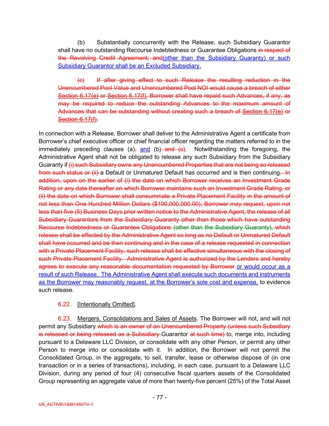 - 77 - US_ACTIVE\130914507\V-1 (b) Substantially concurrently with the Release, such Subsidiary Guarantor shall have no outstanding Recourse Indebtedness or Guarantee Obligations in respect of the Revolving Credit Agreement; and(other than the Subsidiary Guaranty) or such Subsidiary Guarantor shall be an Excluded Subsidiary. (c) If after giving effect to such Release the resulting reduction in the Unencumbered Pool Value and Unencumbered Pool NOI would cause a breach of either Section 6.17(e) or Section 6.17(f), Borrower shall have repaid such Advances, if any, as may be required to reduce the outstanding Advances to the maximum amount of Advances that can be outstanding without creating such a breach of Section 6.17(e) or Section 6.17(f). In connection with a Release, Borrower shall deliver to the Administrative Agent a certificate from Borrower’s chief executive officer or chief financial officer regarding the matters referred to in the immediately preceding clauses (a), and (b) and (c). Notwithstanding the foregoing, the Administrative Agent shall not be obligated to release any such Subsidiary from the Subsidiary Guaranty if (i) such Subsidiary owns any Unencumbered Properties that are not being so released from such status or (ii) a Default or Unmatured Default has occurred and is then continuing. In addition, upon on the earlier of (i) the date on which Borrower receives an Investment Grade Rating or any date thereafter on which Borrower maintains such an Investment Grade Rating, or (ii) the date on which Borrower shall consummate a Private Placement Facility in the amount of not less than One Hundred Million Dollars ($100,000,000.00), Borrower may request, upon not less than five (5) Business Days prior written notice to the Administrative Agent, the release of all Subsidiary Guarantors from the Subsidiary Guaranty other than those which have outstanding Recourse Indebtedness or Guarantee Obligations (other than the Subsidiary Guaranty), which release shall be effected by the Administrative Agent so long as no Default or Unmatured Default shall have occurred and be then continuing and in the case of a release requested in connection with a Private Placement Facility, such release shall be effective simultaneous with the closing of such Private Placement Facility. Administrative Agent is authorized by the Lenders and hereby agrees to execute any reasonable documentation requested by Borrower or would occur as a result of such Release. The Administrative Agent shall execute such documents and instruments as the Borrower may reasonably request, at the Borrower’s sole cost and expense, to evidence such release. [Intentionally Omitted]. Mergers, Consolidations and Sales of Assets. The Borrower will not, and will not permit any Subsidiary which is an owner of an Unencumbered Property (unless such Subsidiary is released or being released as a Subsidiary Guarantor at such time) to, merge into, including pursuant to a Delaware LLC Division, or consolidate with any other Person, or permit any other Person to merge into or consolidate with it. In addition, the Borrower will not permit the Consolidated Group, in the aggregate, to sell, transfer, lease or otherwise dispose of (in one transaction or in a series of transactions), including, in each case, pursuant to a Delaware LLC Division, during any period of four (4) consecutive fiscal quarters assets of the Consolidated Group representing an aggregate value of more than twenty-five percent (25%) of the Total Asset