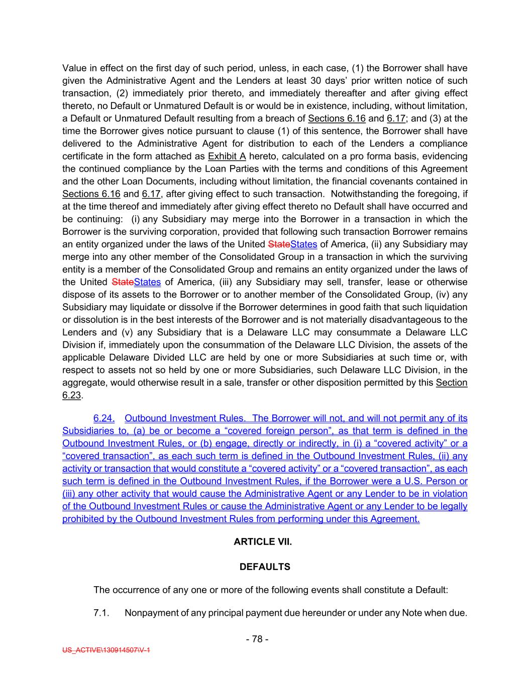 - 78 - US_ACTIVE\130914507\V-1 Value in effect on the first day of such period, unless, in each case, (1) the Borrower shall have given the Administrative Agent and the Lenders at least 30 days’ prior written notice of such transaction, (2) immediately prior thereto, and immediately thereafter and after giving effect thereto, no Default or Unmatured Default is or would be in existence, including, without limitation, a Default or Unmatured Default resulting from a breach of Sections 6.16 and 6.17; and (3) at the time the Borrower gives notice pursuant to clause (1) of this sentence, the Borrower shall have delivered to the Administrative Agent for distribution to each of the Lenders a compliance certificate in the form attached as Exhibit A hereto, calculated on a pro forma basis, evidencing the continued compliance by the Loan Parties with the terms and conditions of this Agreement and the other Loan Documents, including without limitation, the financial covenants contained in Sections 6.16 and 6.17, after giving effect to such transaction. Notwithstanding the foregoing, if at the time thereof and immediately after giving effect thereto no Default shall have occurred and be continuing: (i) any Subsidiary may merge into the Borrower in a transaction in which the Borrower is the surviving corporation, provided that following such transaction Borrower remains an entity organized under the laws of the United StateStates of America, (ii) any Subsidiary may merge into any other member of the Consolidated Group in a transaction in which the surviving entity is a member of the Consolidated Group and remains an entity organized under the laws of the United StateStates of America, (iii) any Subsidiary may sell, transfer, lease or otherwise dispose of its assets to the Borrower or to another member of the Consolidated Group, (iv) any Subsidiary may liquidate or dissolve if the Borrower determines in good faith that such liquidation or dissolution is in the best interests of the Borrower and is not materially disadvantageous to the Lenders and (v) any Subsidiary that is a Delaware LLC may consummate a Delaware LLC Division if, immediately upon the consummation of the Delaware LLC Division, the assets of the applicable Delaware Divided LLC are held by one or more Subsidiaries at such time or, with respect to assets not so held by one or more Subsidiaries, such Delaware LLC Division, in the aggregate, would otherwise result in a sale, transfer or other disposition permitted by this Section 6.23. Outbound Investment Rules. The Borrower will not, and will not permit any of its Subsidiaries to, (a) be or become a “covered foreign person”, as that term is defined in the Outbound Investment Rules, or (b) engage, directly or indirectly, in (i) a “covered activity” or a “covered transaction”, as each such term is defined in the Outbound Investment Rules, (ii) any activity or transaction that would constitute a “covered activity” or a “covered transaction”, as each such term is defined in the Outbound Investment Rules, if the Borrower were a U.S. Person or (iii) any other activity that would cause the Administrative Agent or any Lender to be in violation of the Outbound Investment Rules or cause the Administrative Agent or any Lender to be legally prohibited by the Outbound Investment Rules from performing under this Agreement. ARTICLE VII. DEFAULTS The occurrence of any one or more of the following events shall constitute a Default: 7.1. Nonpayment of any principal payment due hereunder or under any Note when due.