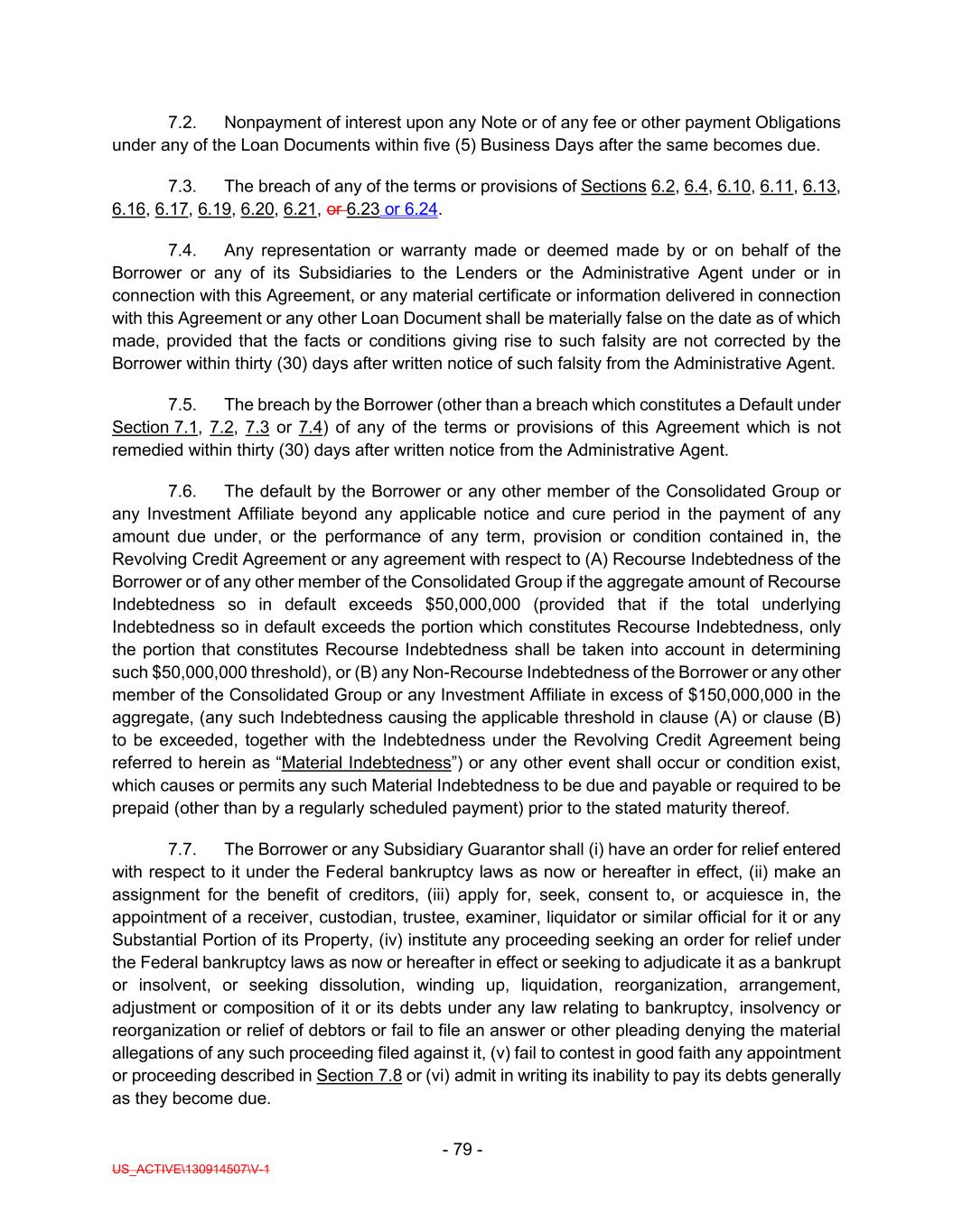 - 79 - US_ACTIVE\130914507\V-1 7.2. Nonpayment of interest upon any Note or of any fee or other payment Obligations under any of the Loan Documents within five (5) Business Days after the same becomes due. 7.3. The breach of any of the terms or provisions of Sections 6.2, 6.4, 6.10, 6.11, 6.13, 6.16, 6.17, 6.19, 6.20, 6.21, or 6.23 or 6.24. 7.4. Any representation or warranty made or deemed made by or on behalf of the Borrower or any of its Subsidiaries to the Lenders or the Administrative Agent under or in connection with this Agreement, or any material certificate or information delivered in connection with this Agreement or any other Loan Document shall be materially false on the date as of which made, provided that the facts or conditions giving rise to such falsity are not corrected by the Borrower within thirty (30) days after written notice of such falsity from the Administrative Agent. 7.5. The breach by the Borrower (other than a breach which constitutes a Default under Section 7.1, 7.2, 7.3 or 7.4) of any of the terms or provisions of this Agreement which is not remedied within thirty (30) days after written notice from the Administrative Agent. 7.6. The default by the Borrower or any other member of the Consolidated Group or any Investment Affiliate beyond any applicable notice and cure period in the payment of any amount due under, or the performance of any term, provision or condition contained in, the Revolving Credit Agreement or any agreement with respect to (A) Recourse Indebtedness of the Borrower or of any other member of the Consolidated Group if the aggregate amount of Recourse Indebtedness so in default exceeds $50,000,000 (provided that if the total underlying Indebtedness so in default exceeds the portion which constitutes Recourse Indebtedness, only the portion that constitutes Recourse Indebtedness shall be taken into account in determining such $50,000,000 threshold), or (B) any Non-Recourse Indebtedness of the Borrower or any other member of the Consolidated Group or any Investment Affiliate in excess of $150,000,000 in the aggregate, (any such Indebtedness causing the applicable threshold in clause (A) or clause (B) to be exceeded, together with the Indebtedness under the Revolving Credit Agreement being referred to herein as “Material Indebtedness”) or any other event shall occur or condition exist, which causes or permits any such Material Indebtedness to be due and payable or required to be prepaid (other than by a regularly scheduled payment) prior to the stated maturity thereof. 7.7. The Borrower or any Subsidiary Guarantor shall (i) have an order for relief entered with respect to it under the Federal bankruptcy laws as now or hereafter in effect, (ii) make an assignment for the benefit of creditors, (iii) apply for, seek, consent to, or acquiesce in, the appointment of a receiver, custodian, trustee, examiner, liquidator or similar official for it or any Substantial Portion of its Property, (iv) institute any proceeding seeking an order for relief under the Federal bankruptcy laws as now or hereafter in effect or seeking to adjudicate it as a bankrupt or insolvent, or seeking dissolution, winding up, liquidation, reorganization, arrangement, adjustment or composition of it or its debts under any law relating to bankruptcy, insolvency or reorganization or relief of debtors or fail to file an answer or other pleading denying the material allegations of any such proceeding filed against it, (v) fail to contest in good faith any appointment or proceeding described in Section 7.8 or (vi) admit in writing its inability to pay its debts generally as they become due.