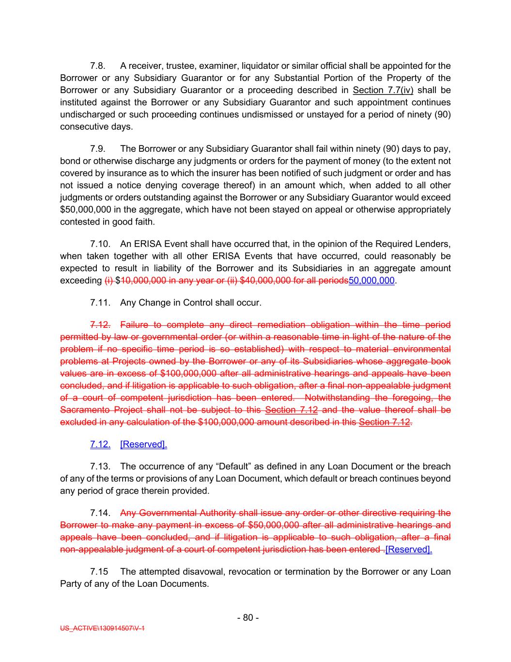 - 80 - US_ACTIVE\130914507\V-1 7.8. A receiver, trustee, examiner, liquidator or similar official shall be appointed for the Borrower or any Subsidiary Guarantor or for any Substantial Portion of the Property of the Borrower or any Subsidiary Guarantor or a proceeding described in Section 7.7(iv) shall be instituted against the Borrower or any Subsidiary Guarantor and such appointment continues undischarged or such proceeding continues undismissed or unstayed for a period of ninety (90) consecutive days. 7.9. The Borrower or any Subsidiary Guarantor shall fail within ninety (90) days to pay, bond or otherwise discharge any judgments or orders for the payment of money (to the extent not covered by insurance as to which the insurer has been notified of such judgment or order and has not issued a notice denying coverage thereof) in an amount which, when added to all other judgments or orders outstanding against the Borrower or any Subsidiary Guarantor would exceed $50,000,000 in the aggregate, which have not been stayed on appeal or otherwise appropriately contested in good faith. 7.10. An ERISA Event shall have occurred that, in the opinion of the Required Lenders, when taken together with all other ERISA Events that have occurred, could reasonably be expected to result in liability of the Borrower and its Subsidiaries in an aggregate amount exceeding (i) $10,000,000 in any year or (ii) $40,000,000 for all periods50,000,000. 7.11. Any Change in Control shall occur. 7.12. Failure to complete any direct remediation obligation within the time period permitted by law or governmental order (or within a reasonable time in light of the nature of the problem if no specific time period is so established) with respect to material environmental problems at Projects owned by the Borrower or any of its Subsidiaries whose aggregate book values are in excess of $100,000,000 after all administrative hearings and appeals have been concluded, and if litigation is applicable to such obligation, after a final non-appealable judgment of a court of competent jurisdiction has been entered. Notwithstanding the foregoing, the Sacramento Project shall not be subject to this Section 7.12 and the value thereof shall be excluded in any calculation of the $100,000,000 amount described in this Section 7.12. 7.12. [Reserved]. 7.13. The occurrence of any “Default” as defined in any Loan Document or the breach of any of the terms or provisions of any Loan Document, which default or breach continues beyond any period of grace therein provided. 7.14. Any Governmental Authority shall issue any order or other directive requiring the Borrower to make any payment in excess of $50,000,000 after all administrative hearings and appeals have been concluded, and if litigation is applicable to such obligation, after a final non-appealable judgment of a court of competent jurisdiction has been entered .[Reserved]. 7.15 The attempted disavowal, revocation or termination by the Borrower or any Loan Party of any of the Loan Documents.